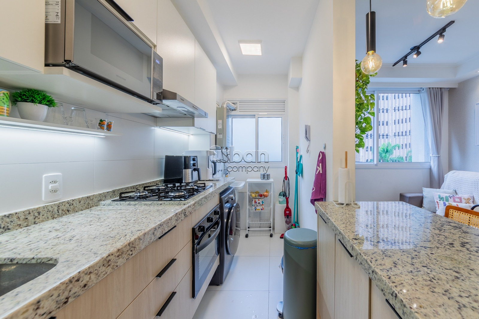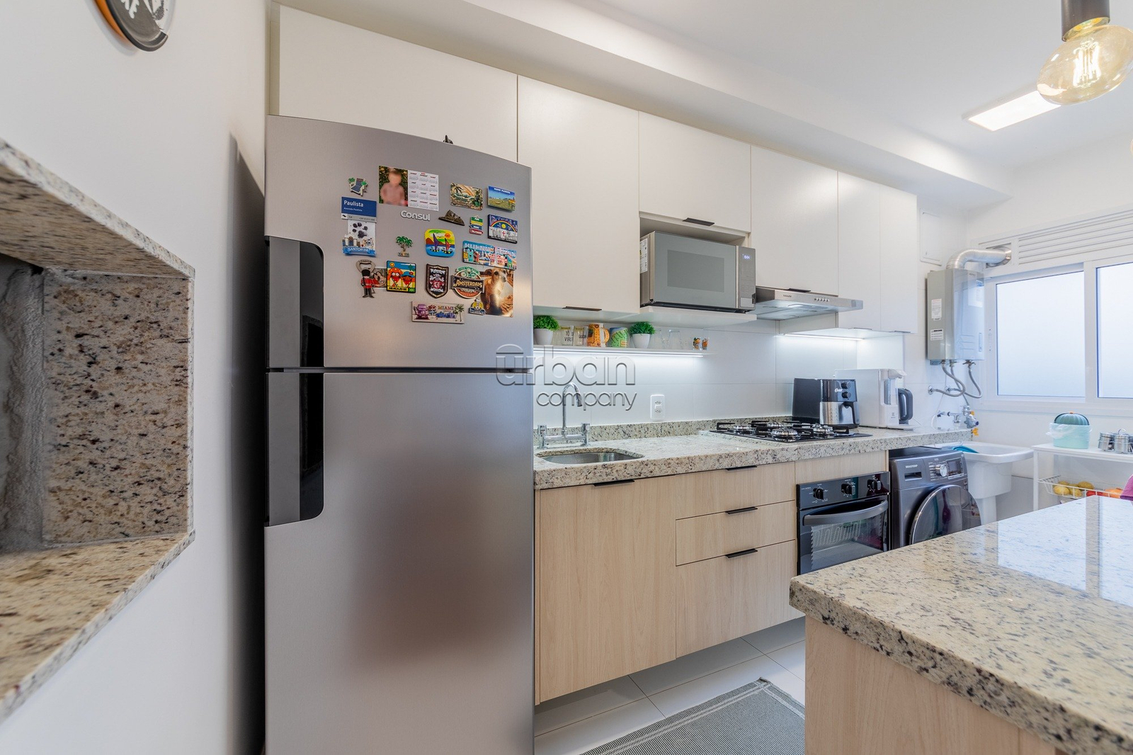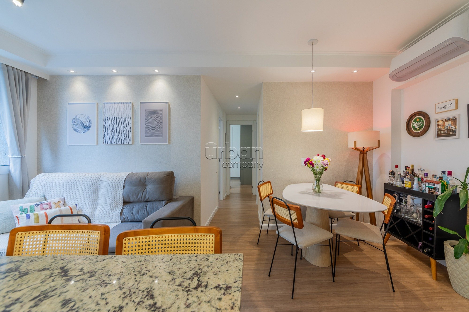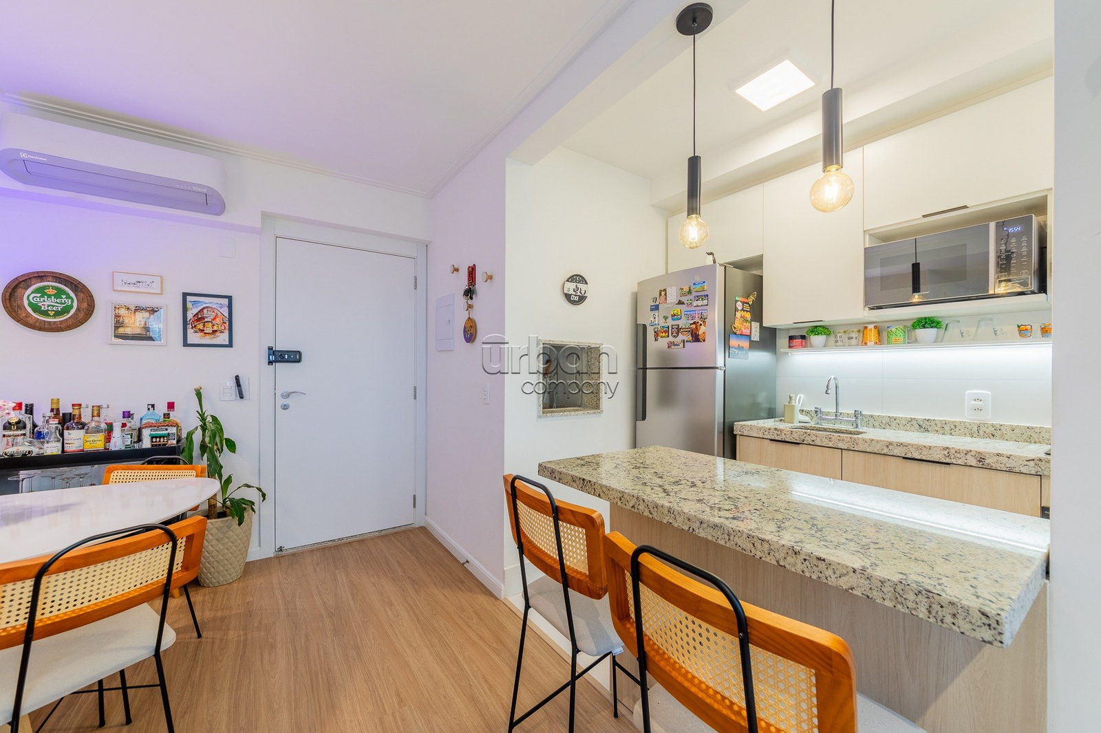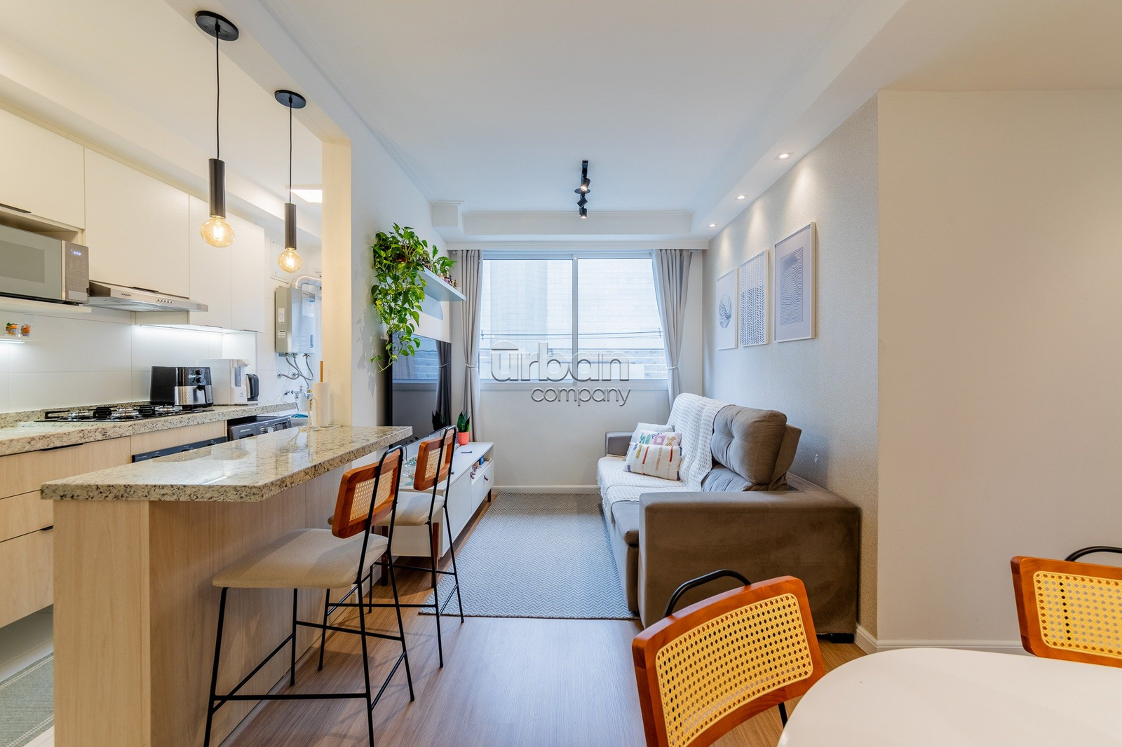 Apartamento com 67m² de área privativa; 3 dormitórios sendo 1 suíte; living 2 ambientes; cozinha americana completa com churrasqueira (e para maior conveniência, permanecem os splits, fogão e forno); e área de serviço integrada.