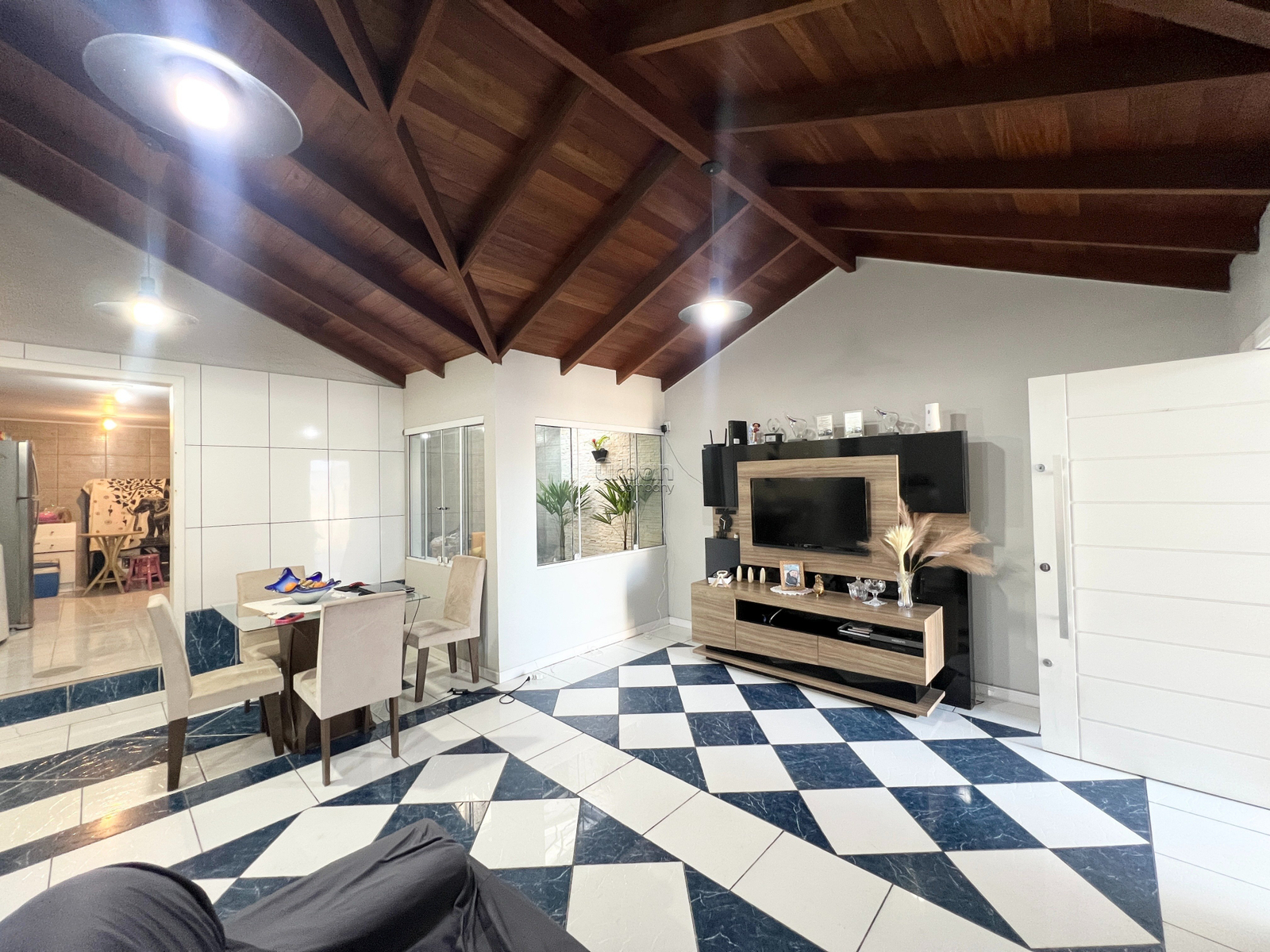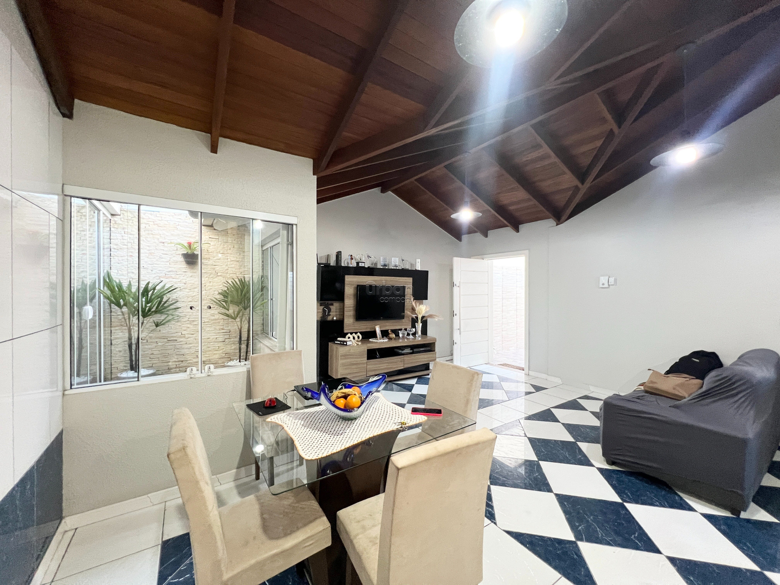 No primeiro piso você encontra living 2 ambientes com cozinha integrada, banheiro social, jardim de inverno, 1 dormitório/ou closet, área de serviço, adega, amplo pátio na frente da casa com piscina e vaga de garagem.