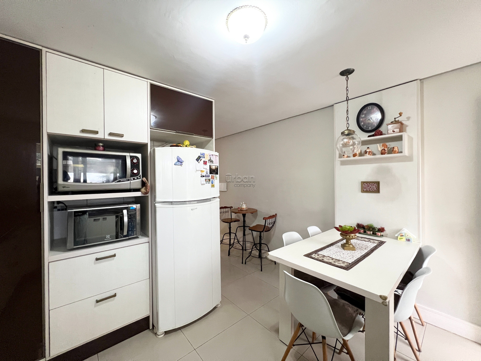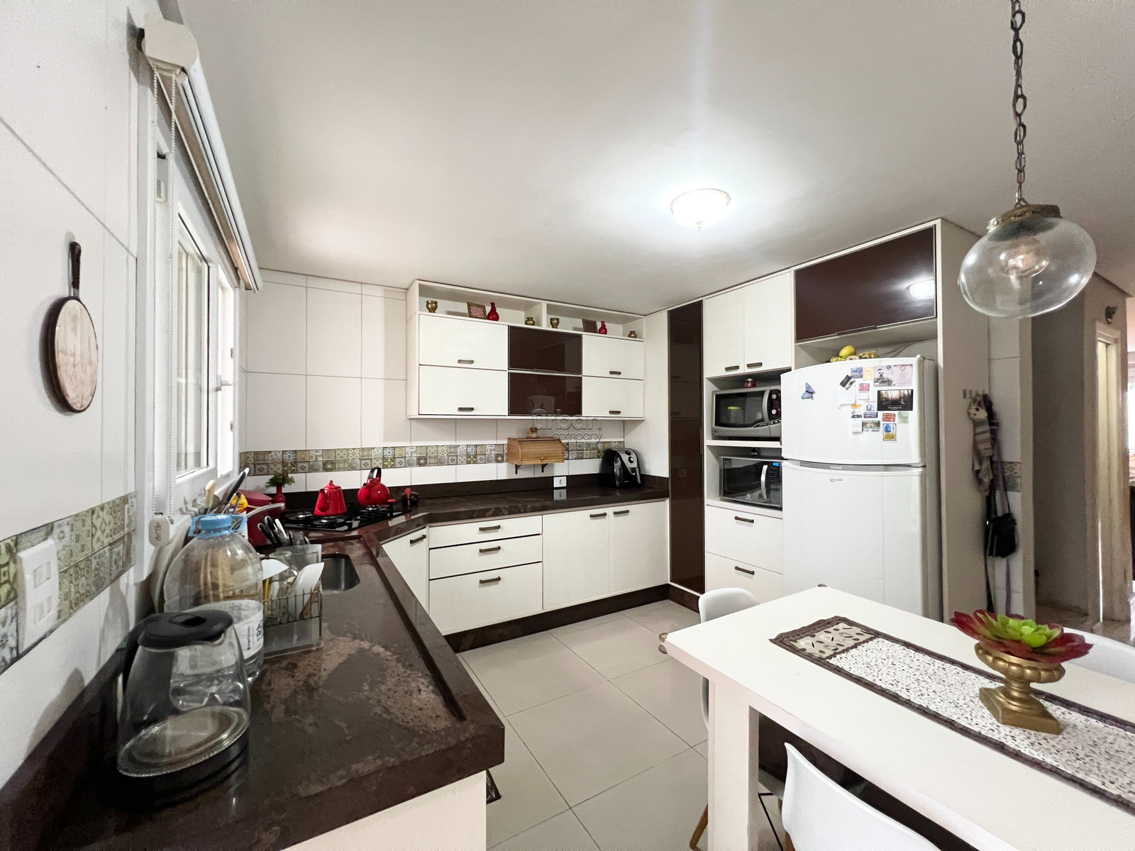 - Cozinha: móveis planejados, cooktop, mesa com 4 cadeiras e pendentes.