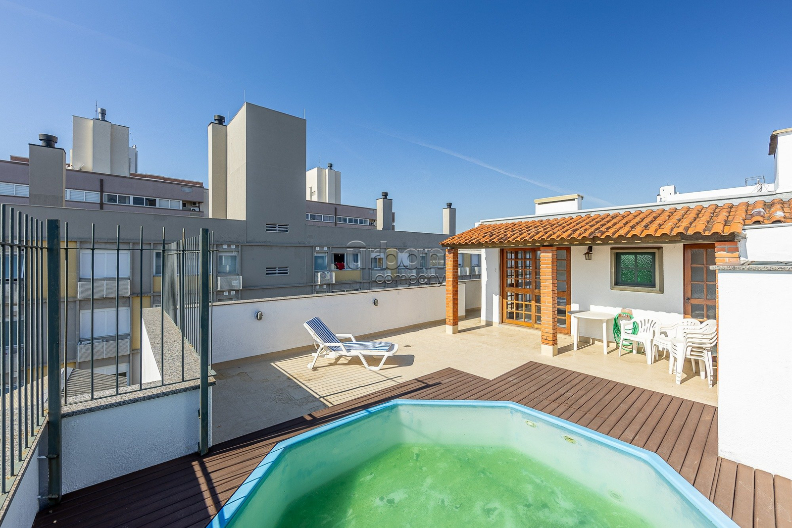 Na área externa, um charmoso deck em madeira com pequena piscina é ideal para relaxar nos dias mais quentes, além de um espaço aberto perfeito para aproveitar o sol ou contemplar a vista panorâmica da cidade.