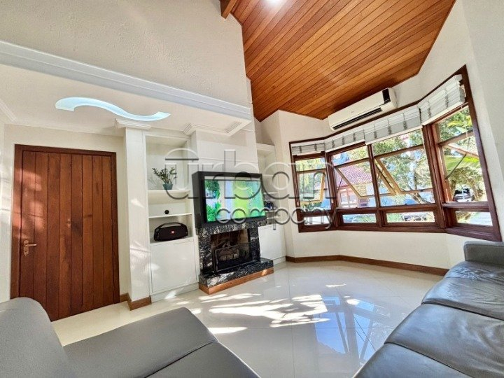 Sala de estar com lareira e pé-direito alto