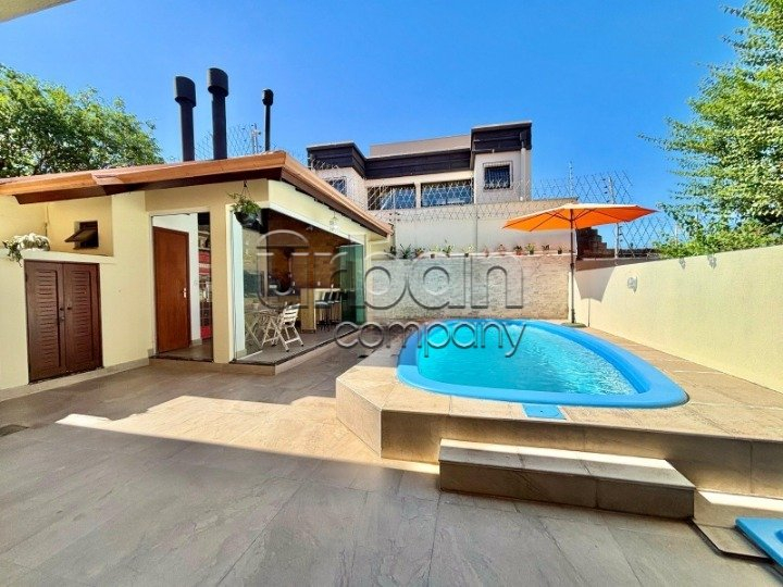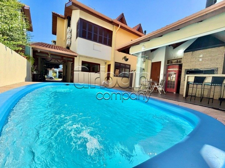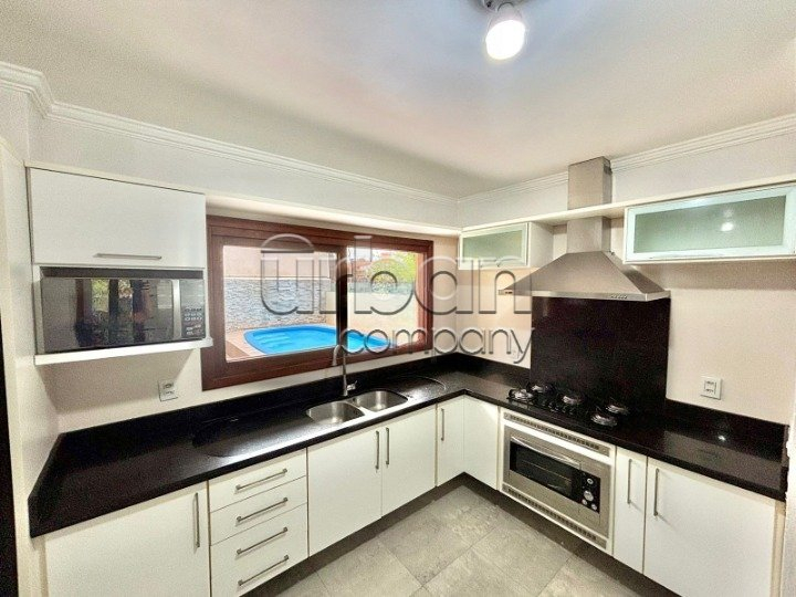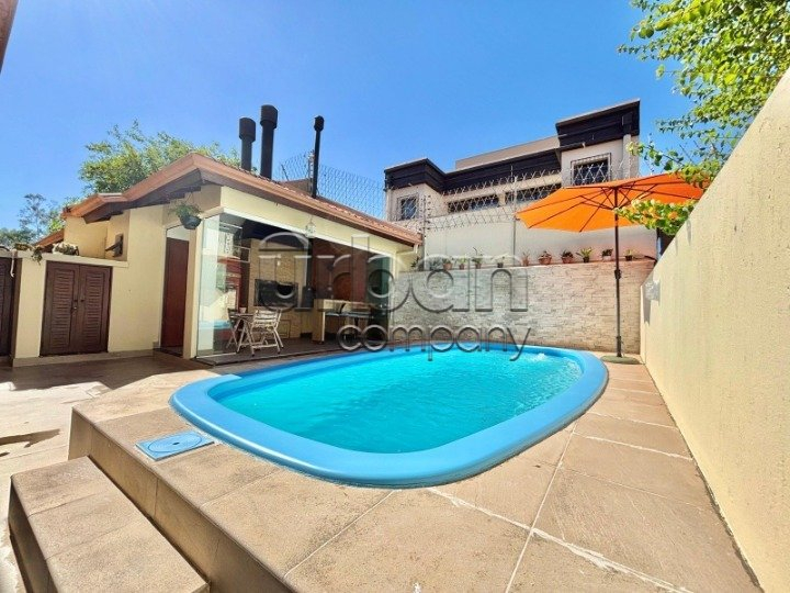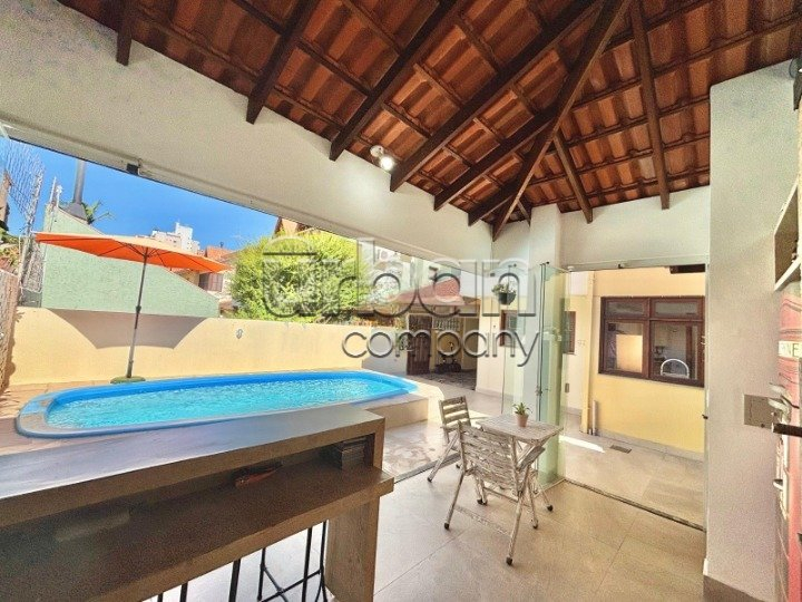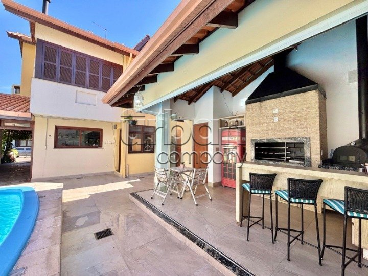 Área gourmet com churrasqueiras interna e externa, forno de pizza à lenha e piscina e ficam os móveis sob medida.