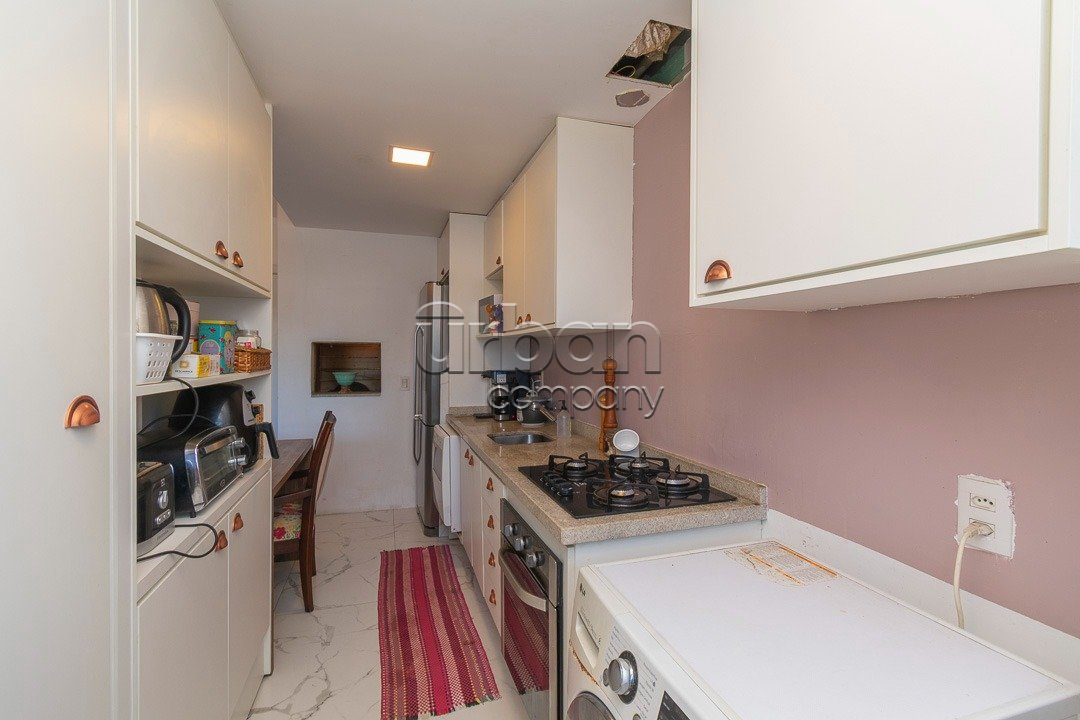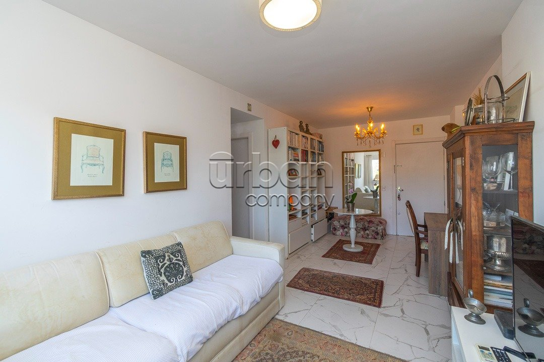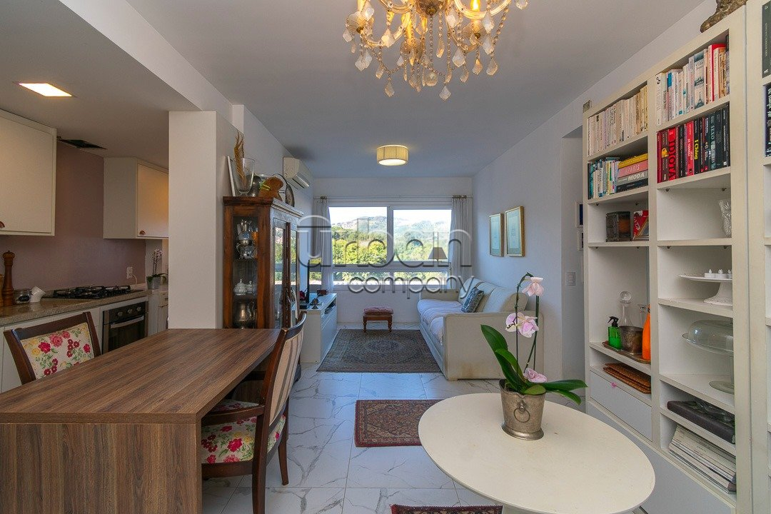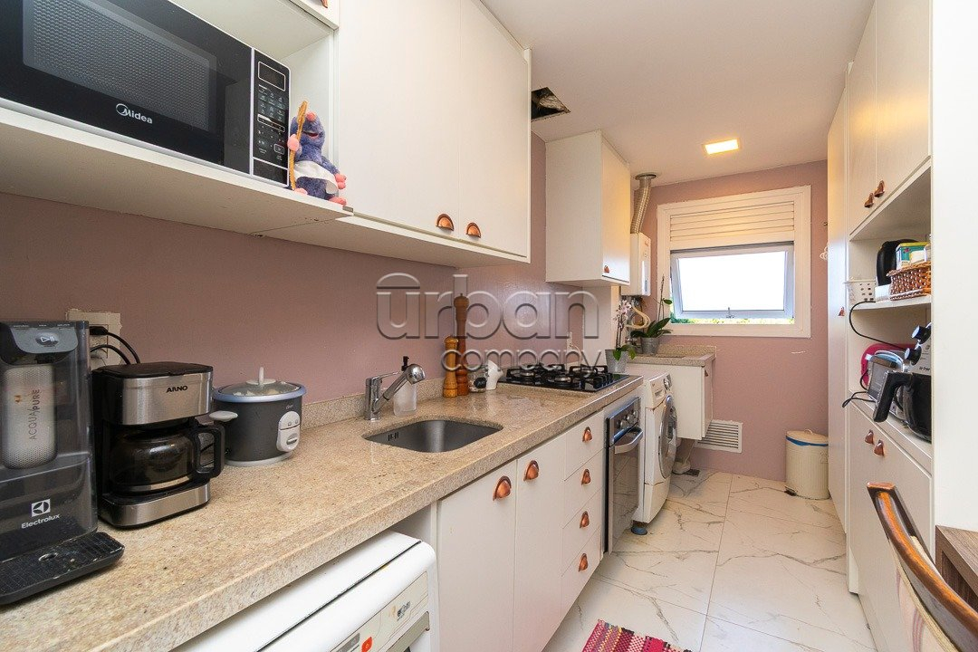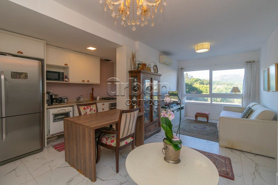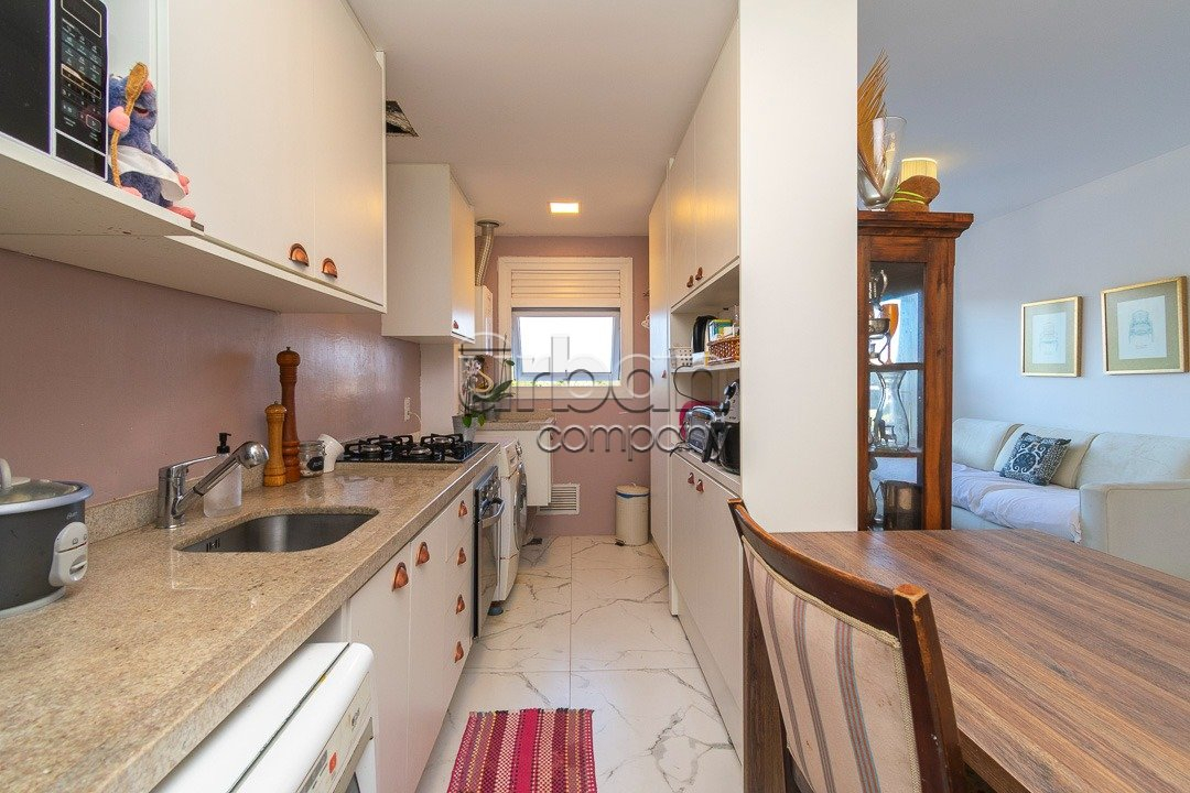 O apartamento conta com living amplo para dois ambientes, cozinha com churrasqueira integrada, além de área de serviço funcional. São dois dormitórios, sendo um deles uma suíte, garantindo mais conforto e privacidade. A unidade dispõe ainda de vaga de garagem escriturada.