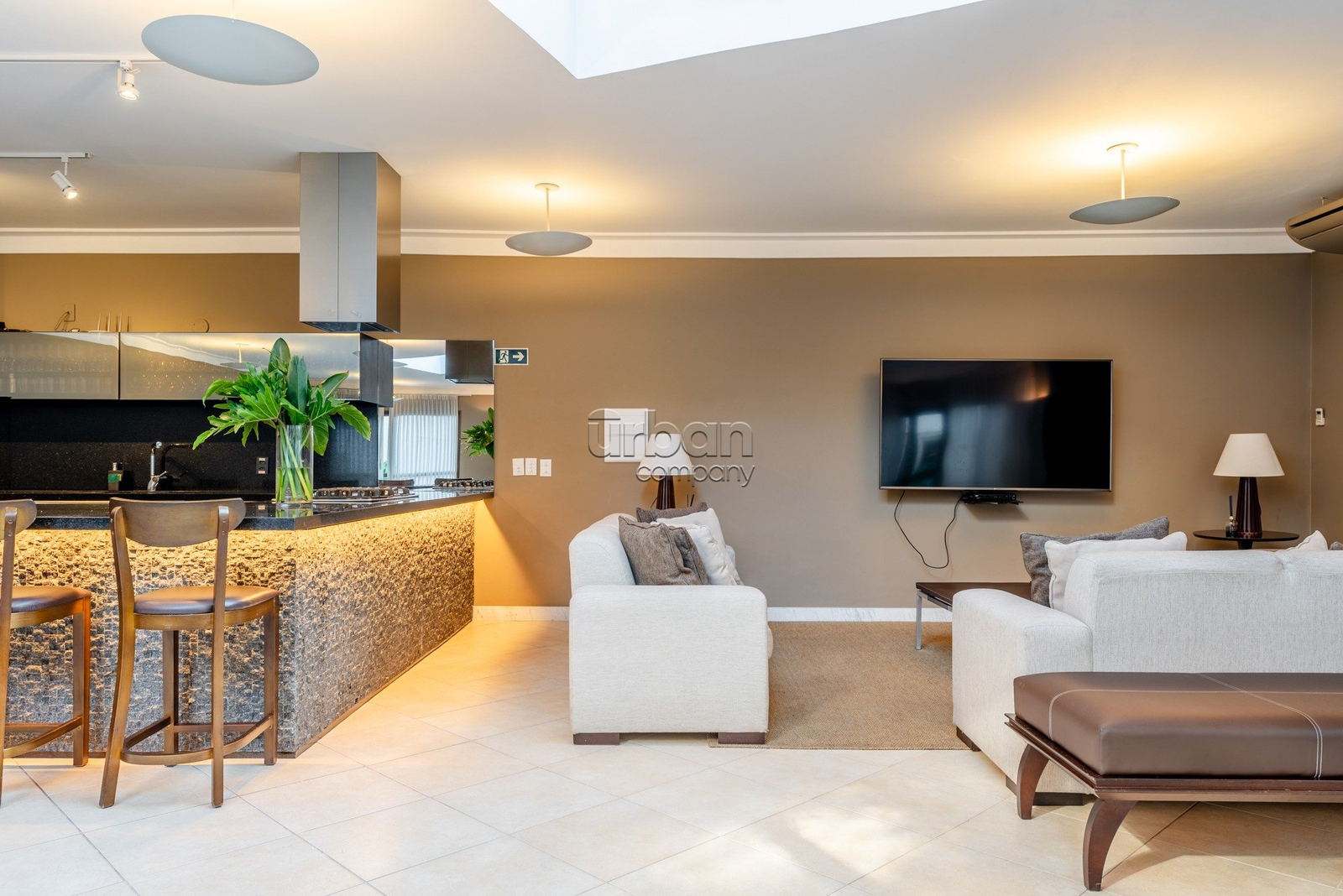 Está semi-mobiliado, permanecendo os móveis fixos de marcenaria no living, home office, closet, quartos, cozinha, área de serviço, banheiros, lareira e churrasqueira/bar. Os demais itens podem ser negociados conforme o interesse do comprador.