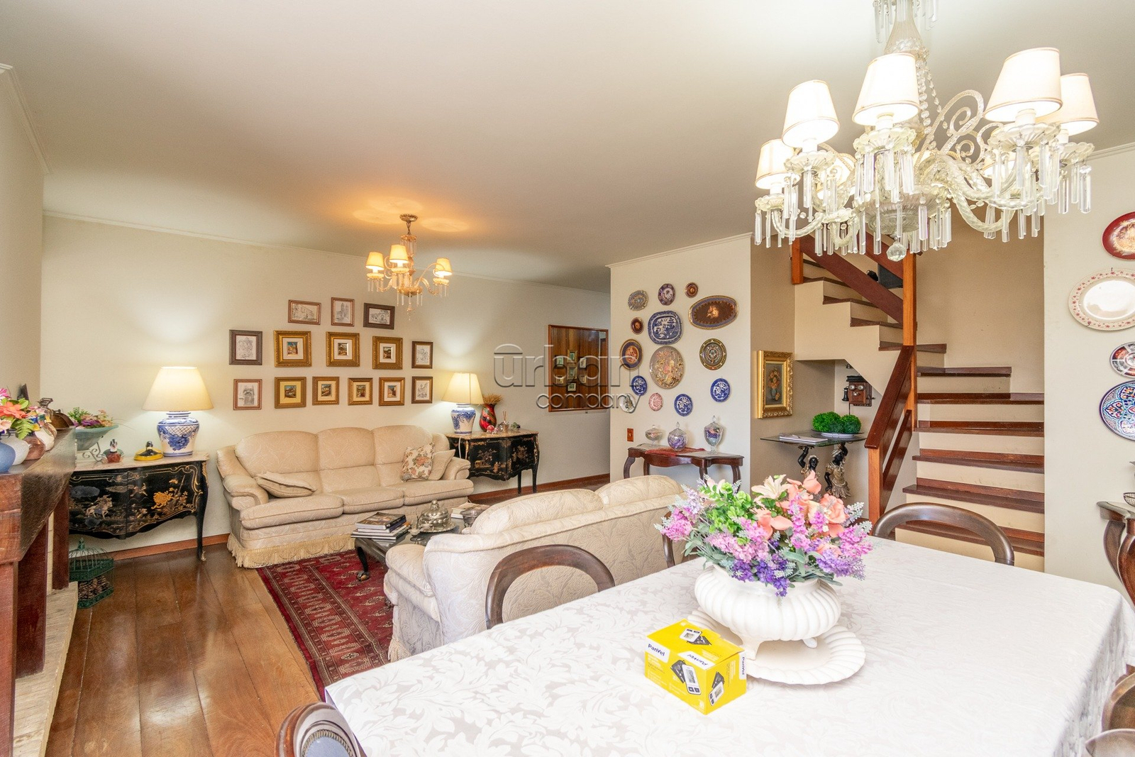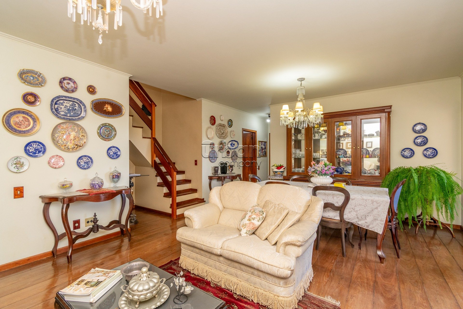 No pavimento inferior, estão os três dormitórios, incluindo uma suíte aconchegante, além de um banheiro social, lavabo e uma ampla sala com lareira que se conecta à sacada. O piso em tabuão confere charme e elegância ao ambiente. A cozinha sob medida garante funcionalidade, enquanto a área de serviço separada e a dependência completa de empregada com banheiro auxiliar trazem comodidade ao cotidiano.
