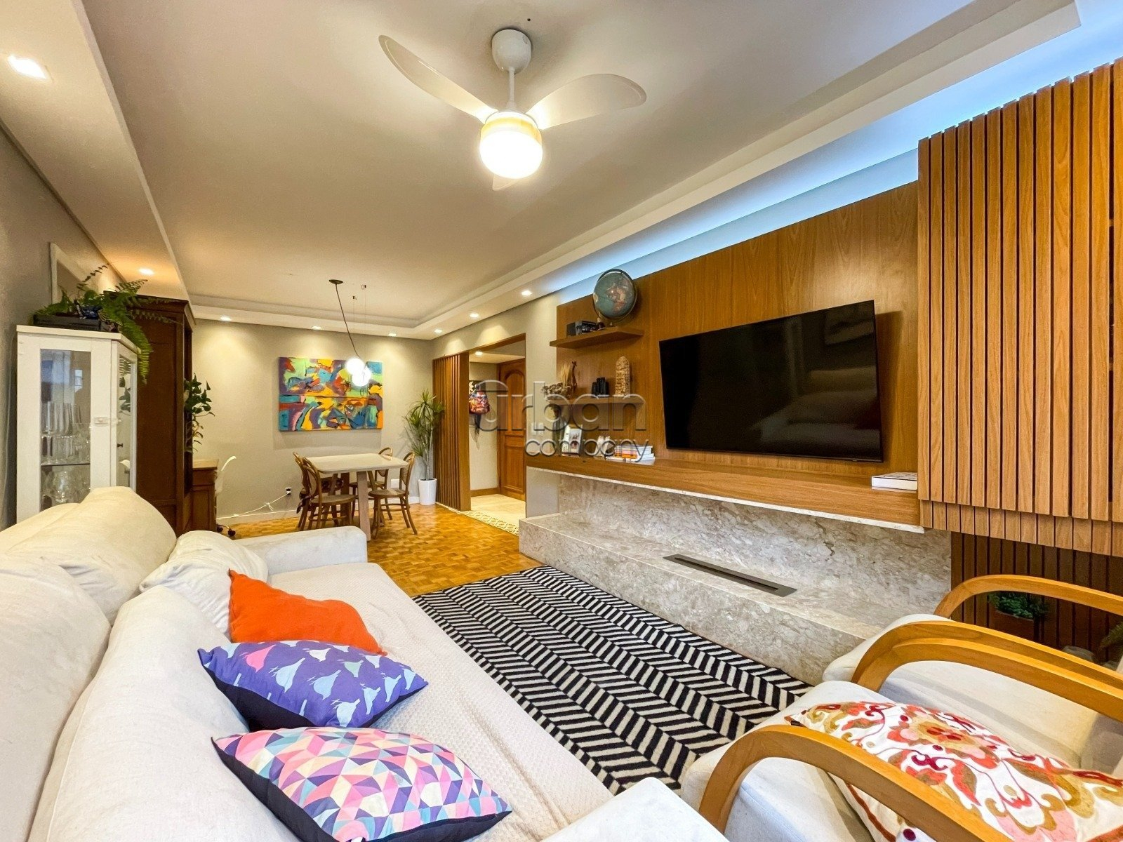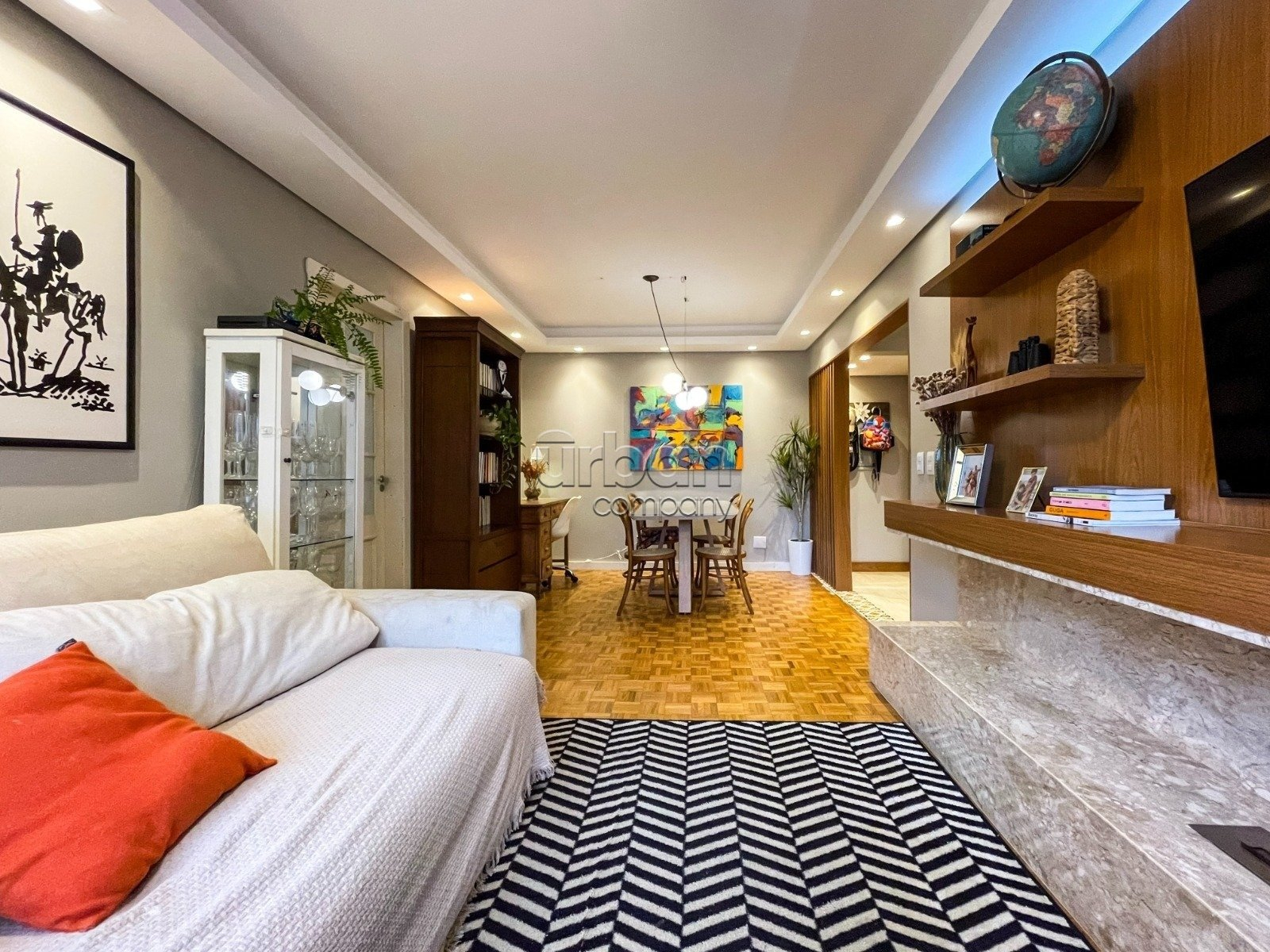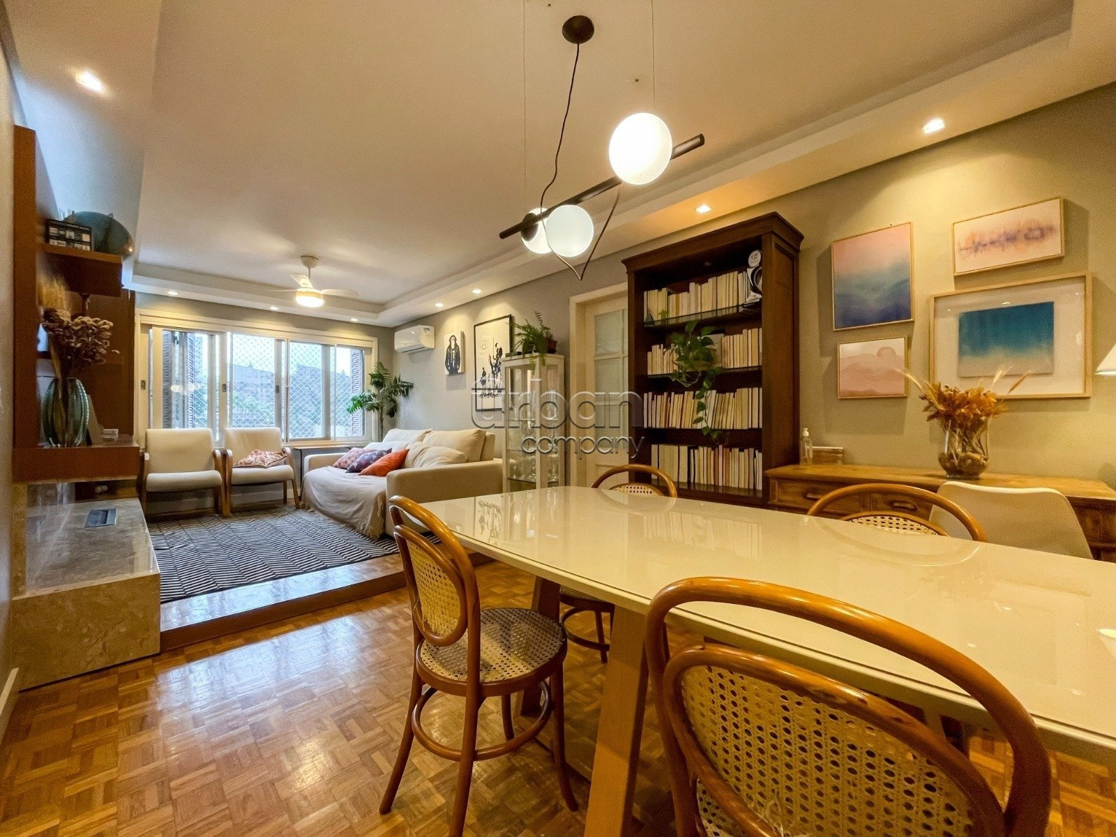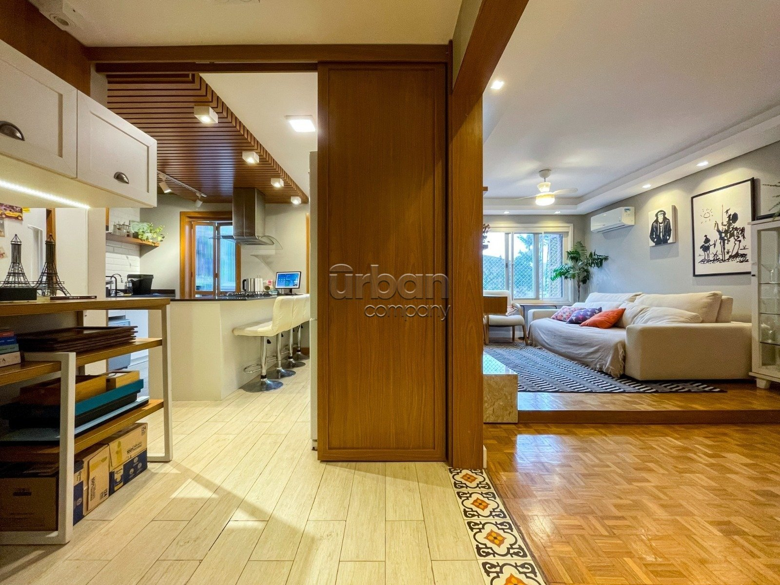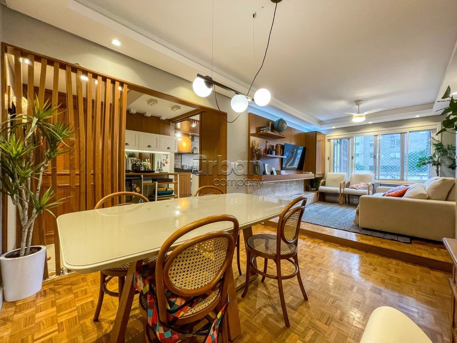 Com 104 m² de área privativa, os ambientes sociais ? sala de estar, jantar e cozinha ? foram harmoniosamente integrados, proporcionando uma atmosfera acolhedora e sofisticada.