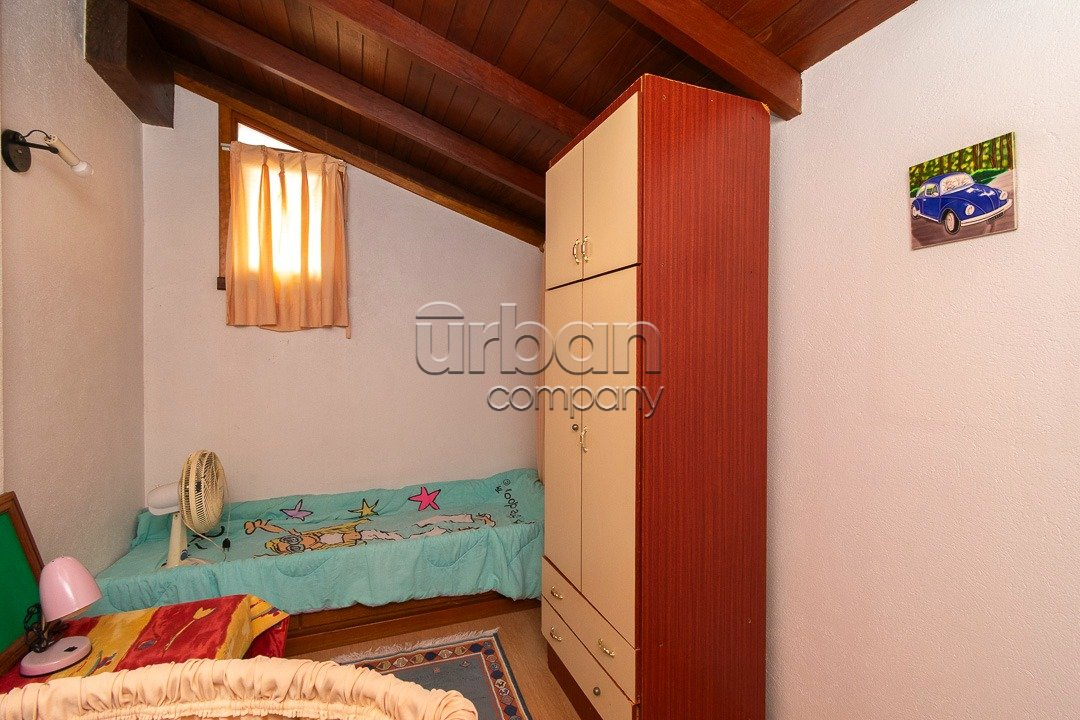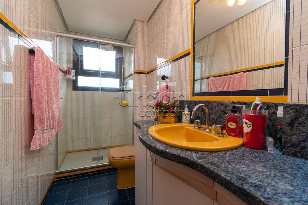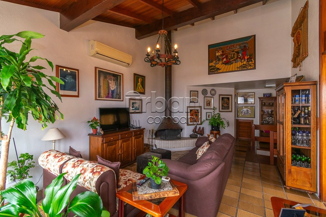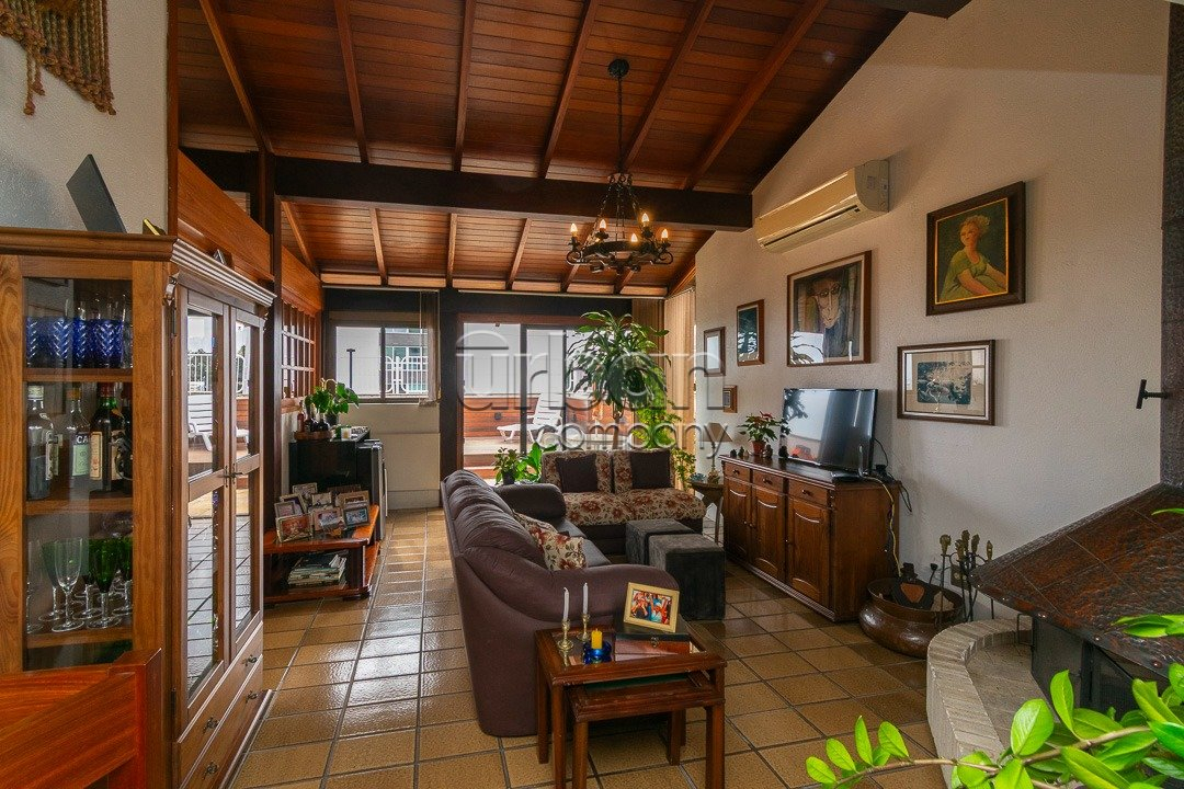 No andar superior, o destaque é o amplo living com lareira, perfeito para momentos de relaxamento. A área gourmet é fechada e equipada com churrasqueira, acompanhada de um banheiro generoso e uma área externa com deck. A cobertura ainda dispõe de área de serviço e dependência completa de empregada.