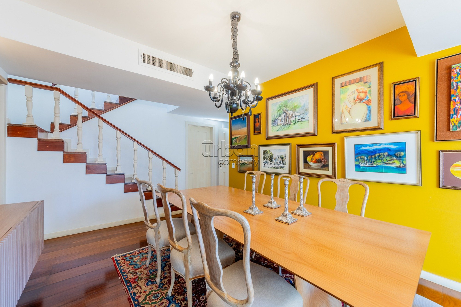 No primeiro andar, você encontra os dormitórios, incluindo a suíte com closet, banheiro social, sala de estar com lareira, sala de jantar, lavabo, escritório, cozinha planejada, lavanderia separada e dependência completa de serviço.