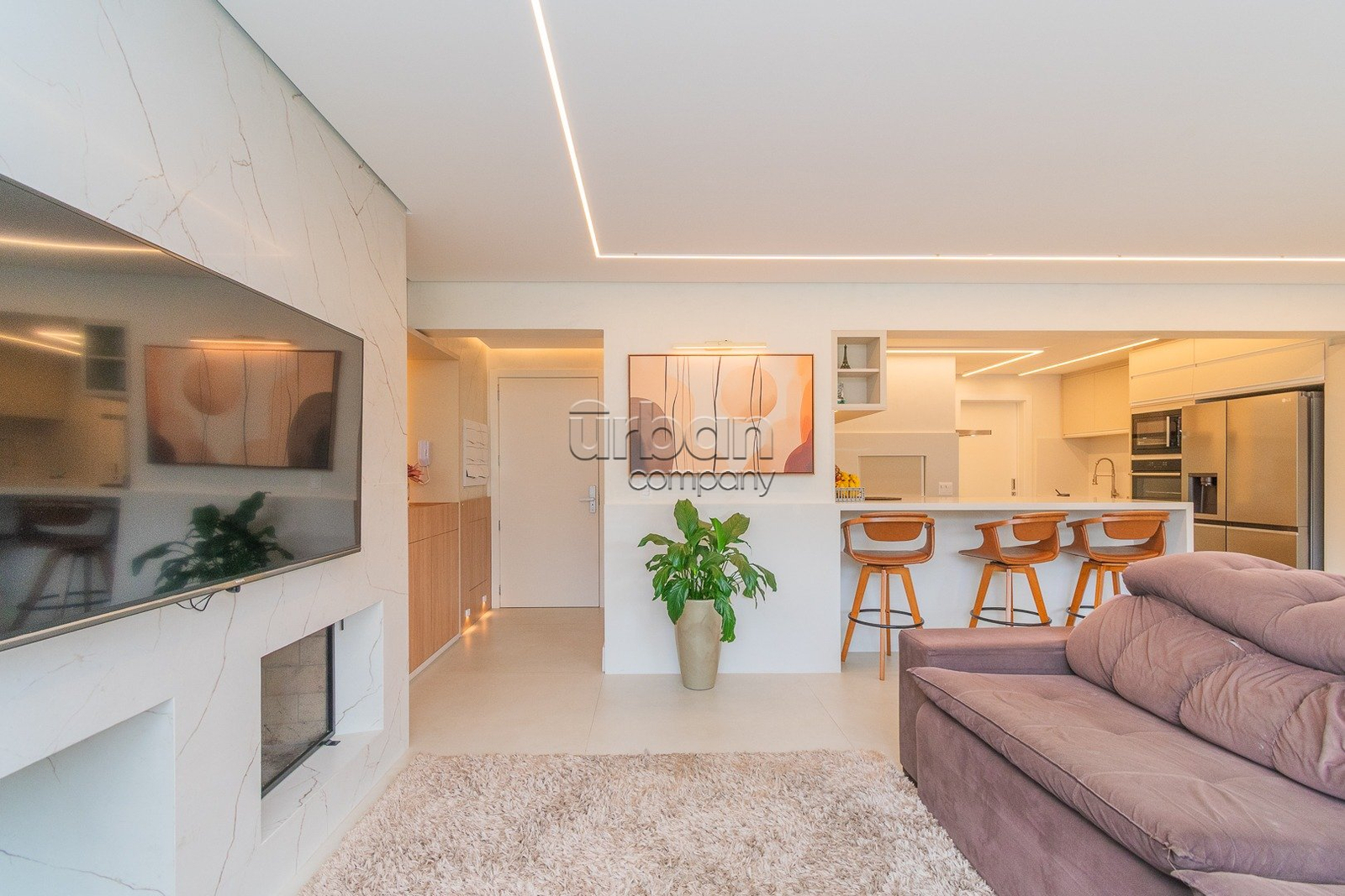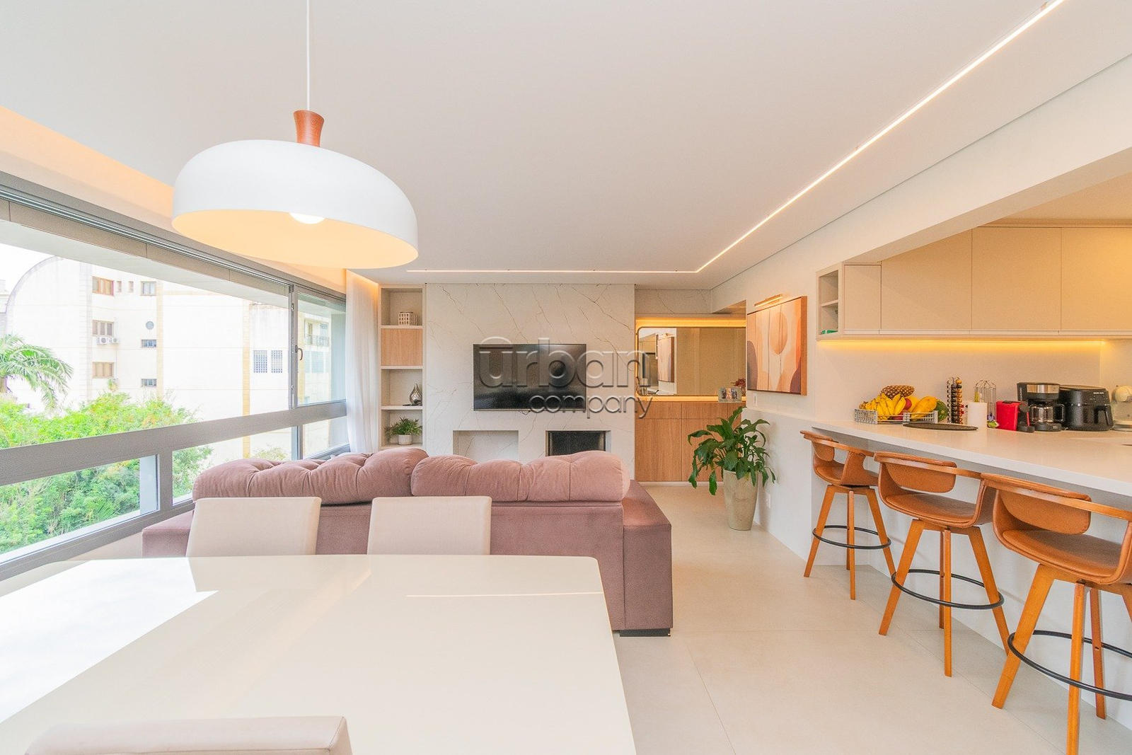 O living é espaçoso, com dois ambientes, lareira, lavabo e um elegante espaço gourmet com churrasqueira, ideal para receber com conforto. A cozinha é americana e integrada ao ambiente, com lavanderia separada.