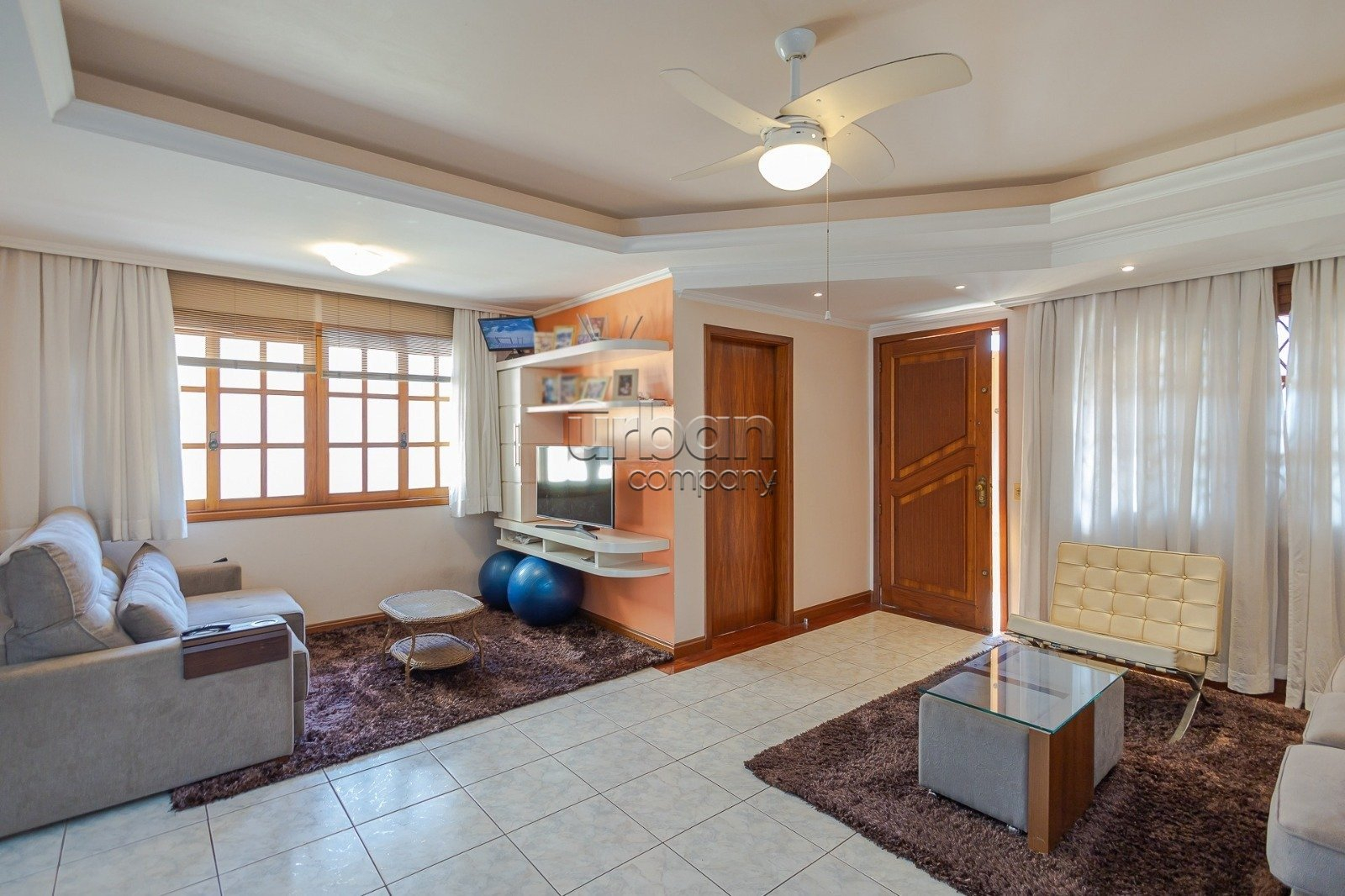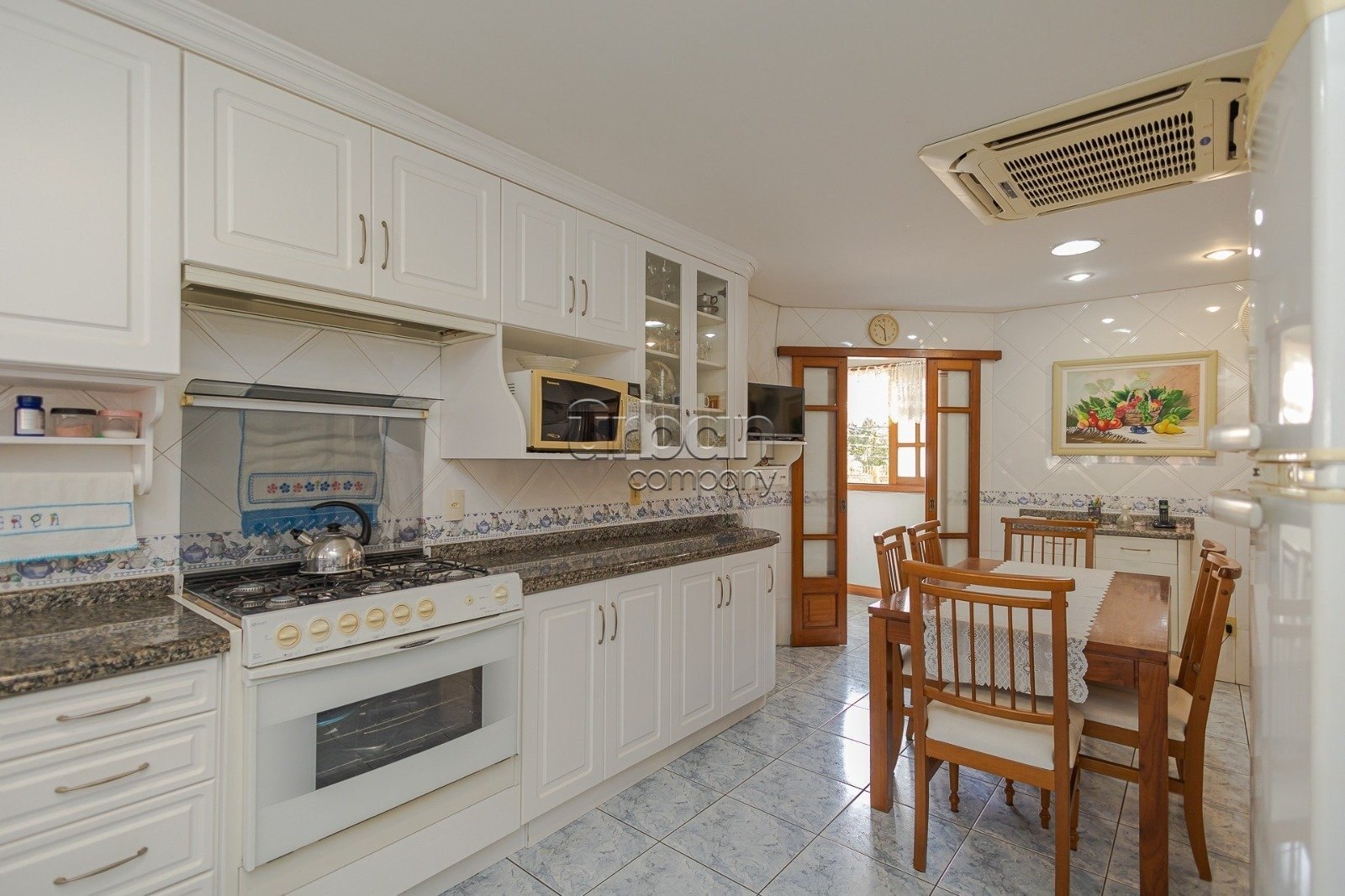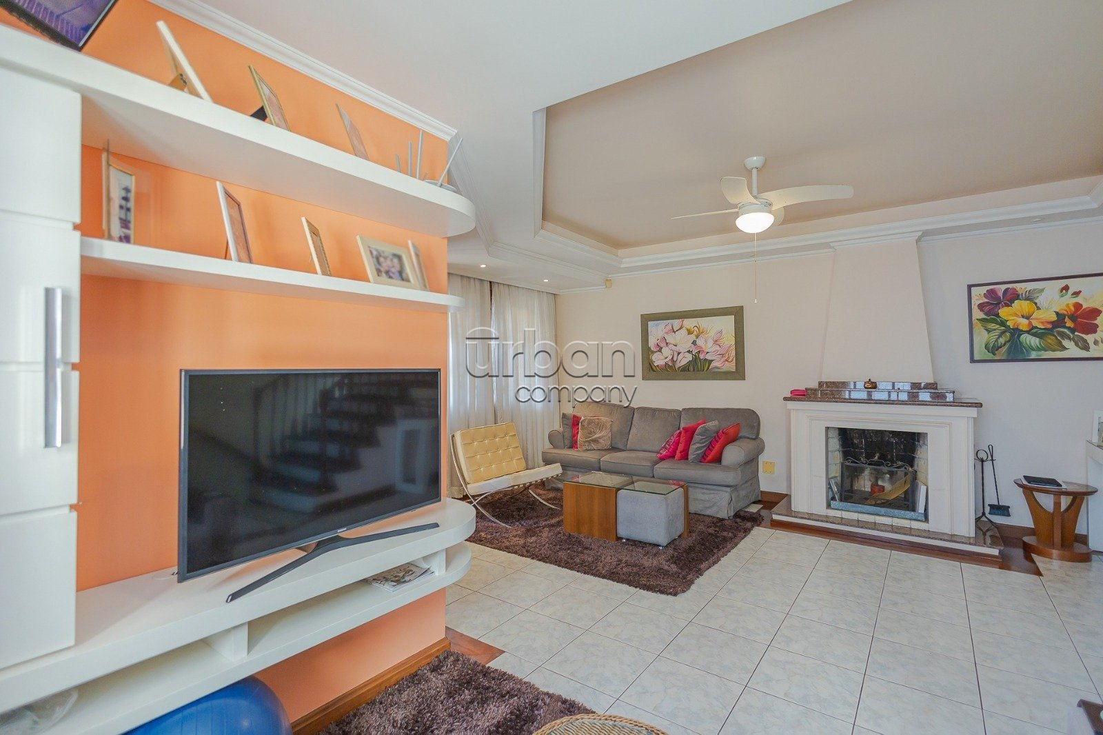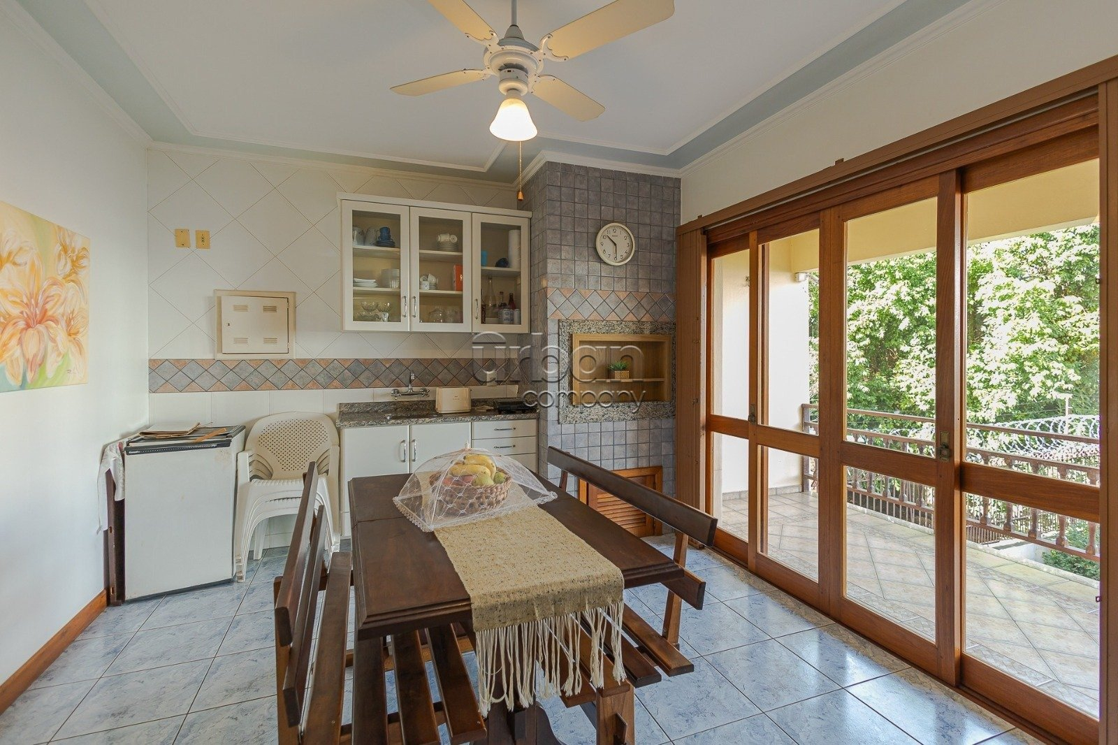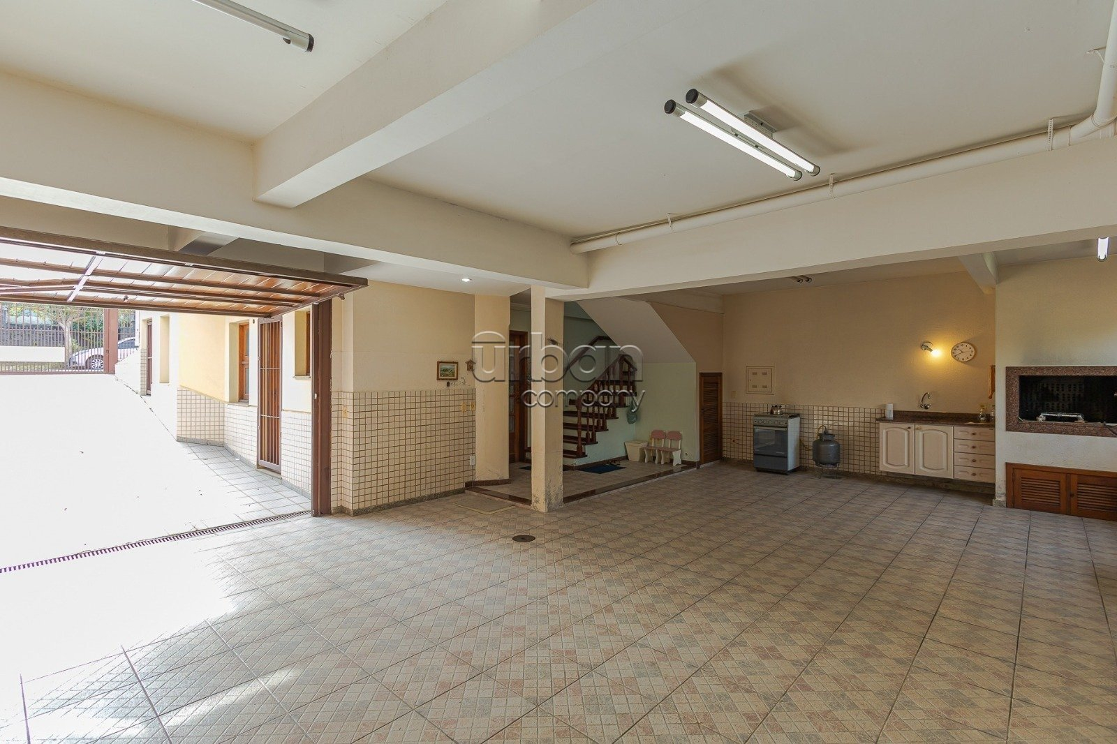 A garagem comporta até três veículos e conta com mais uma churrasqueira, com saída direta para o pátio dos fundos. O pátio, com gramado e árvores frutíferas, é perfeito para aproveitar o ar livre com total privacidade.