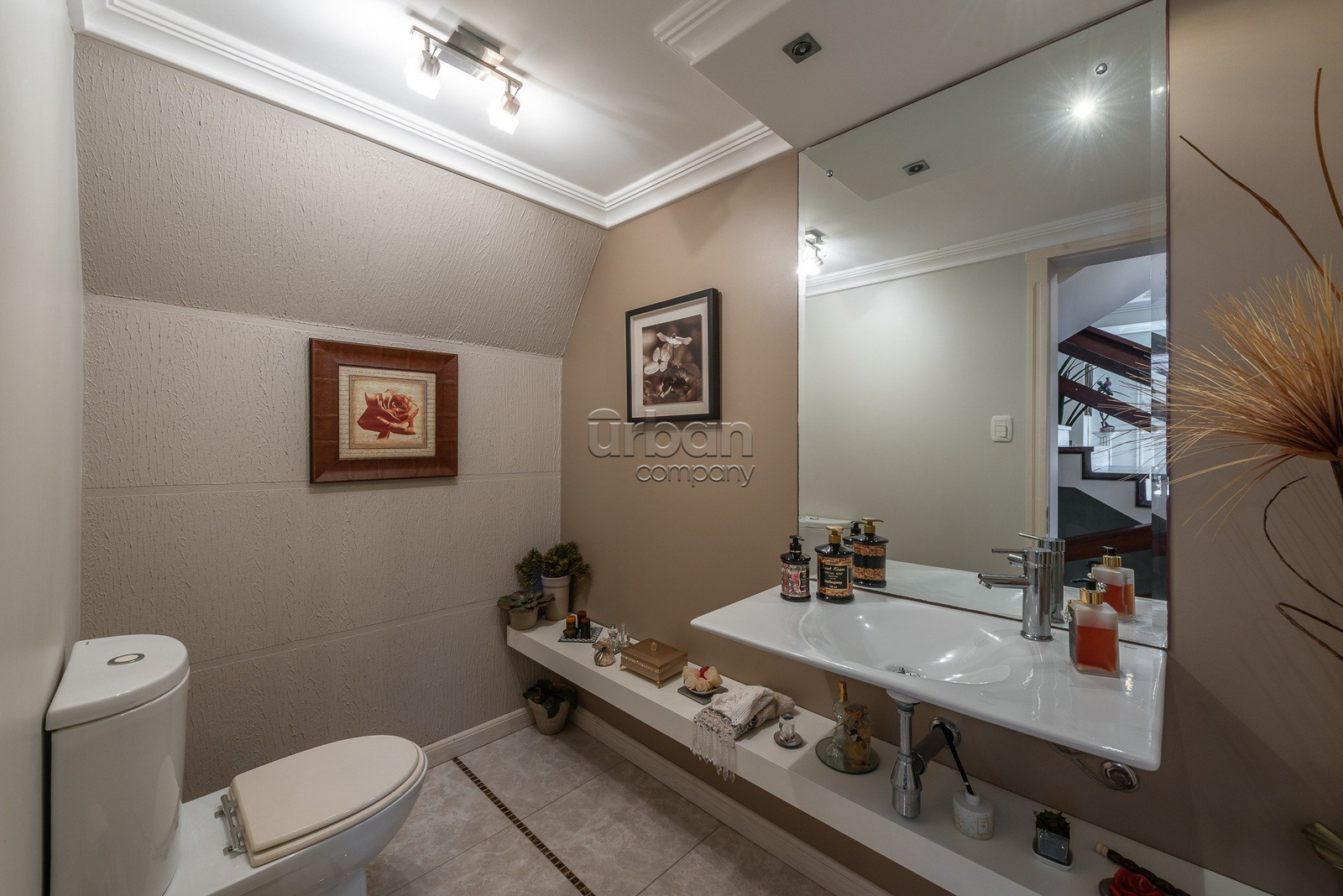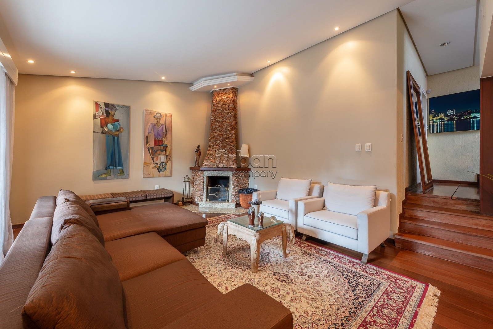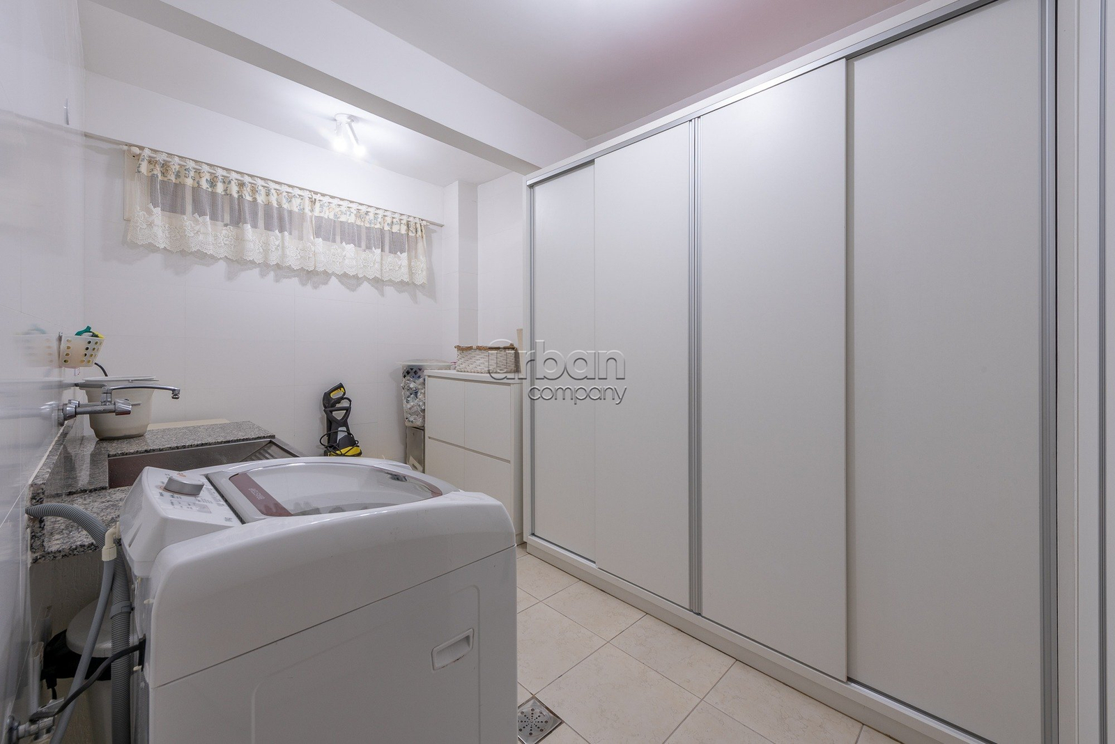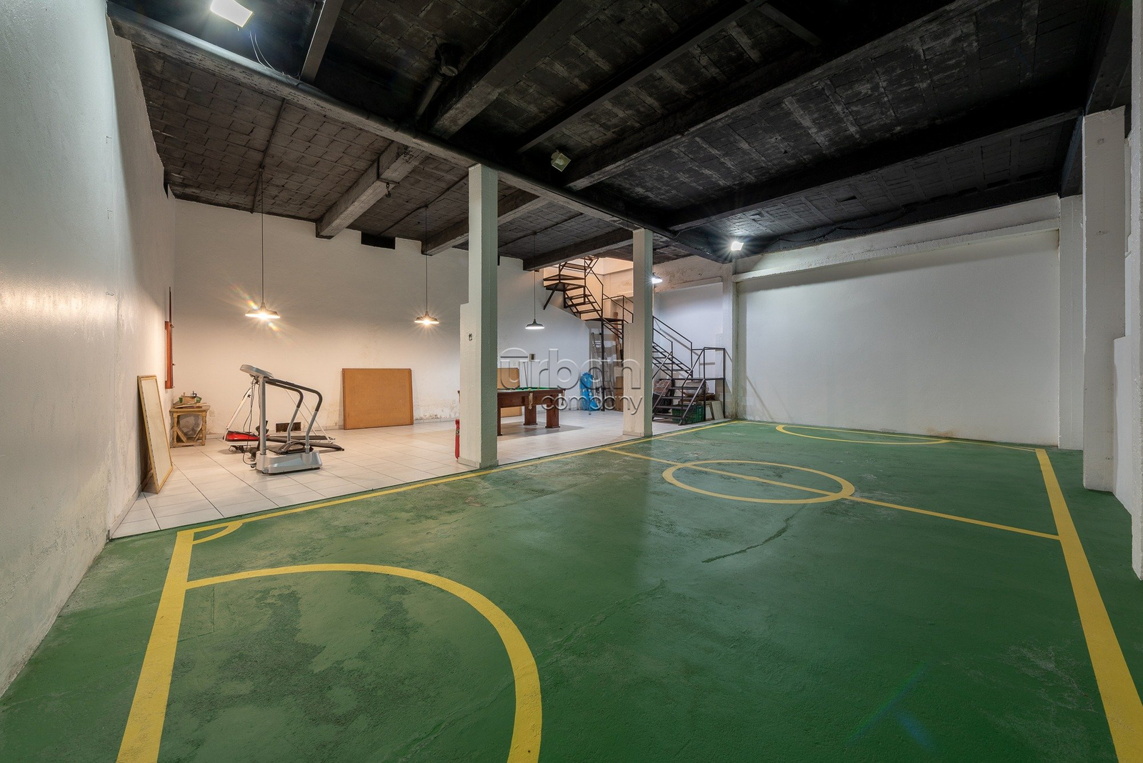 No piso inferior, dispõe de sala de lazer com cozinha americana e churrasqueira, dependência completa, lavanderia, piscina e quadra poliesportiva.