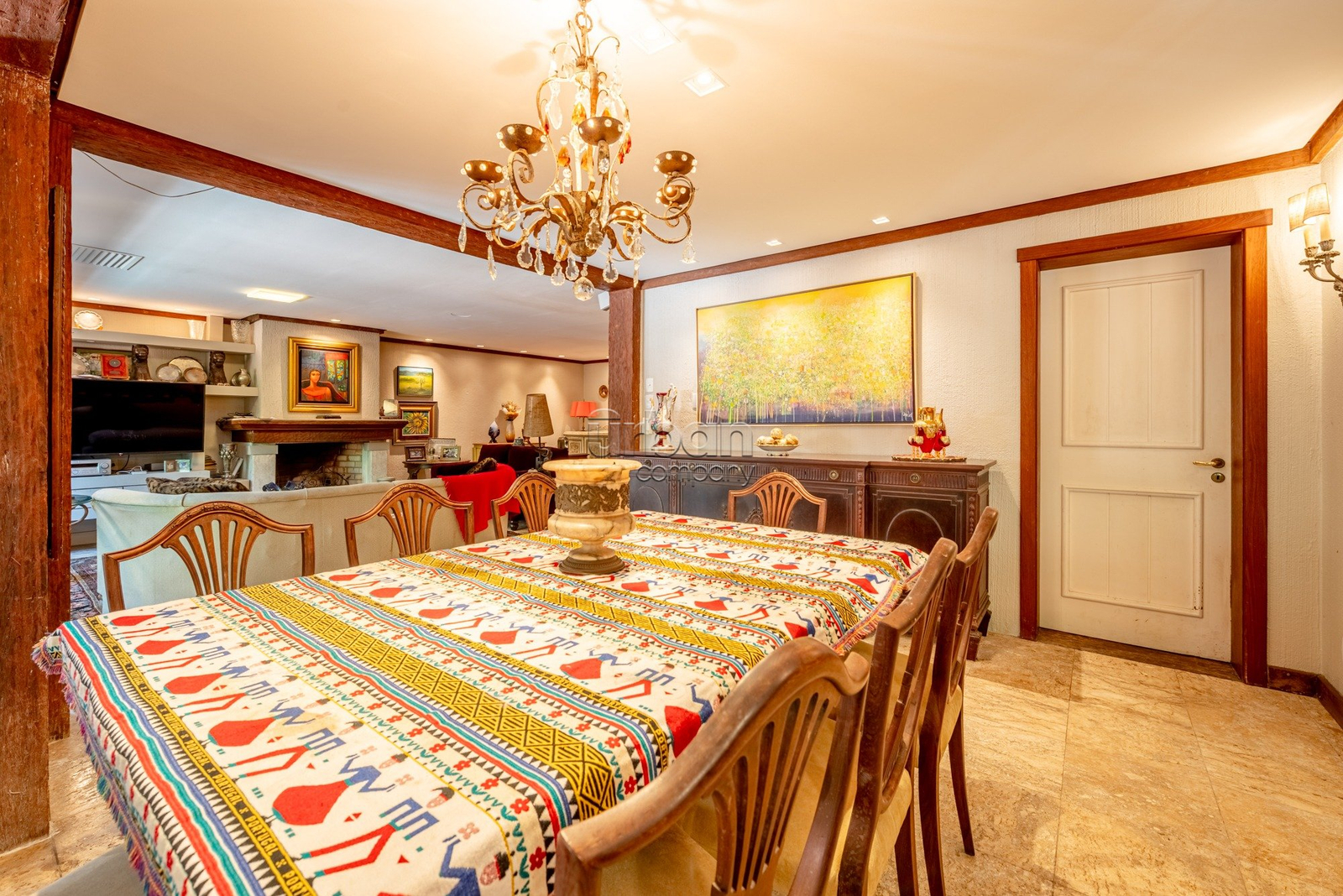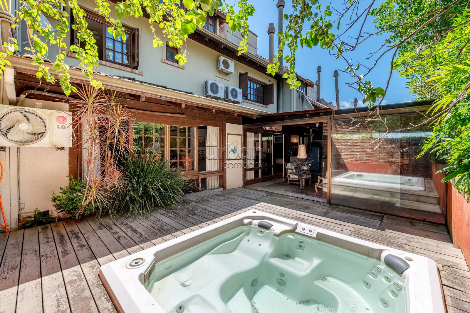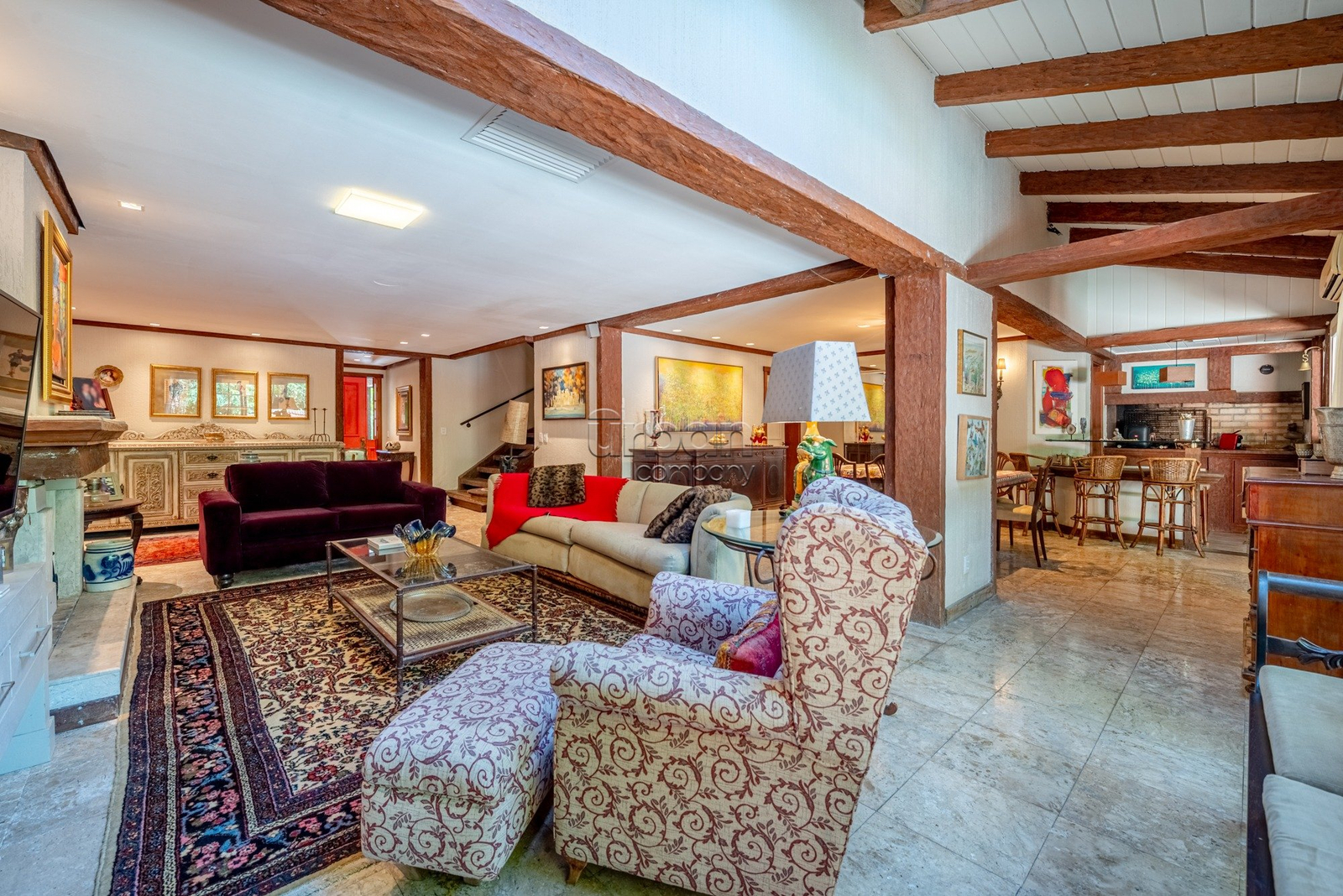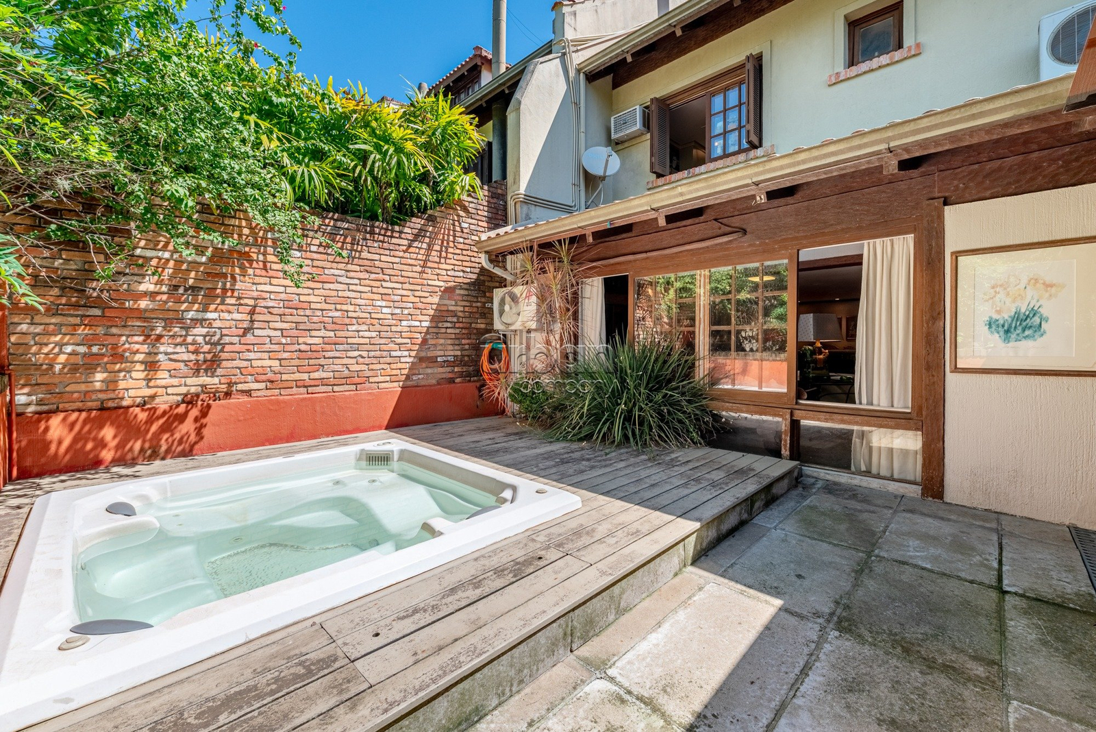 São 386,61 privativos, sendo que no térreo há uma generosa sala com lareira, sala de jantar, espaço gourmet com churrasqueira, jardim de inverno coberto com fogão à lenha e spa (jacuzzi com deck), lavabo, gabinete, cozinha com copa e área de serviço.