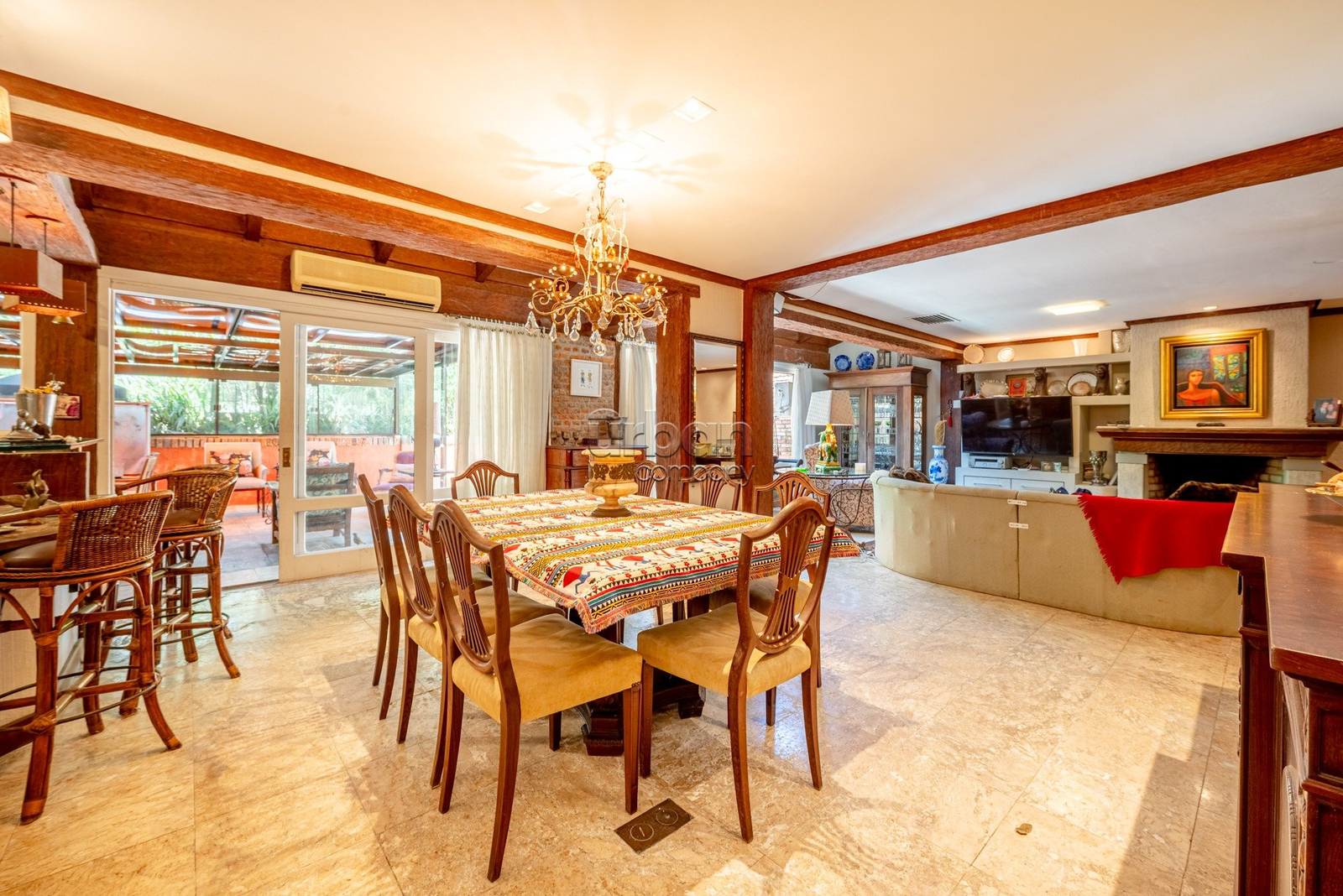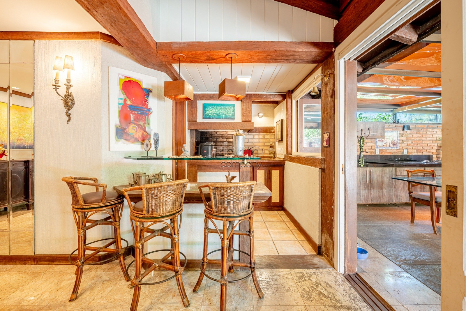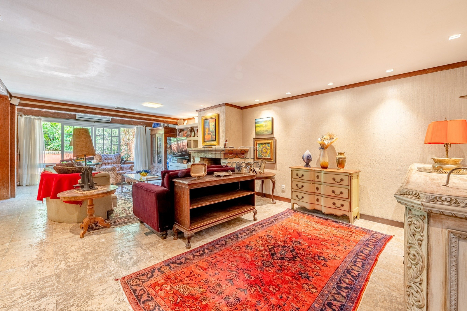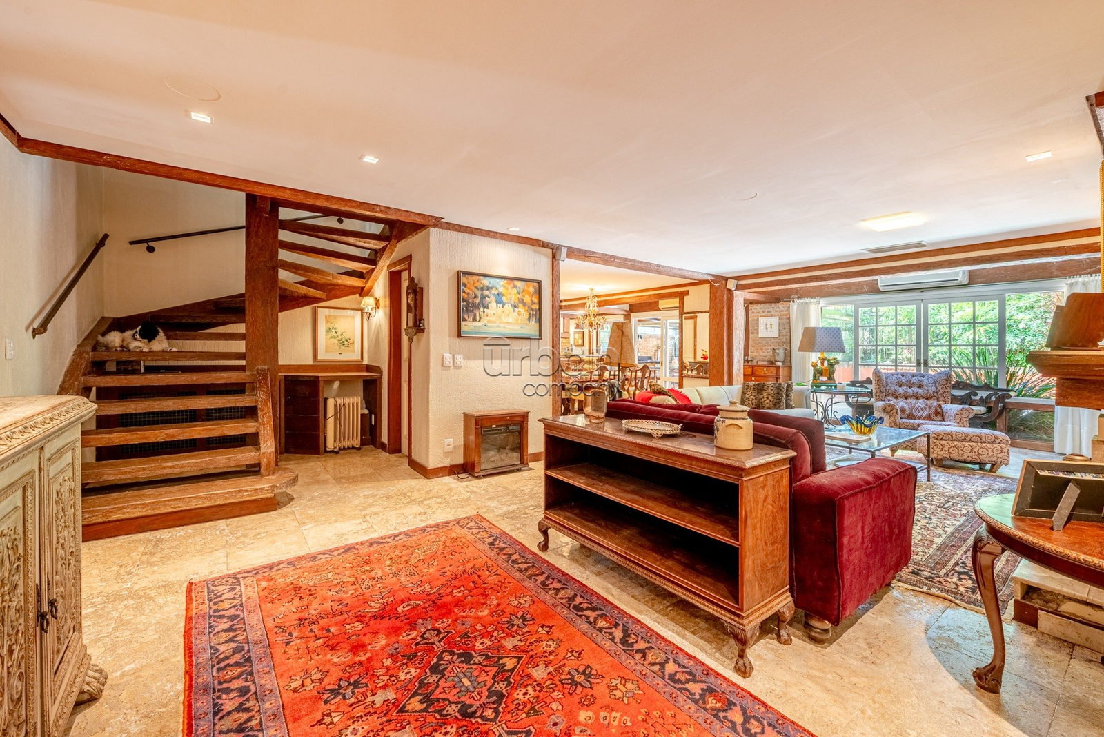 São 386,61 privativos, sendo que no térreo há uma generosa sala com lareira, sala de jantar, espaço gourmet com churrasqueira, jardim de inverno coberto com fogão à lenha e spa (jacuzzi com deck), lavabo, gabinete, cozinha com copa e área de serviço.