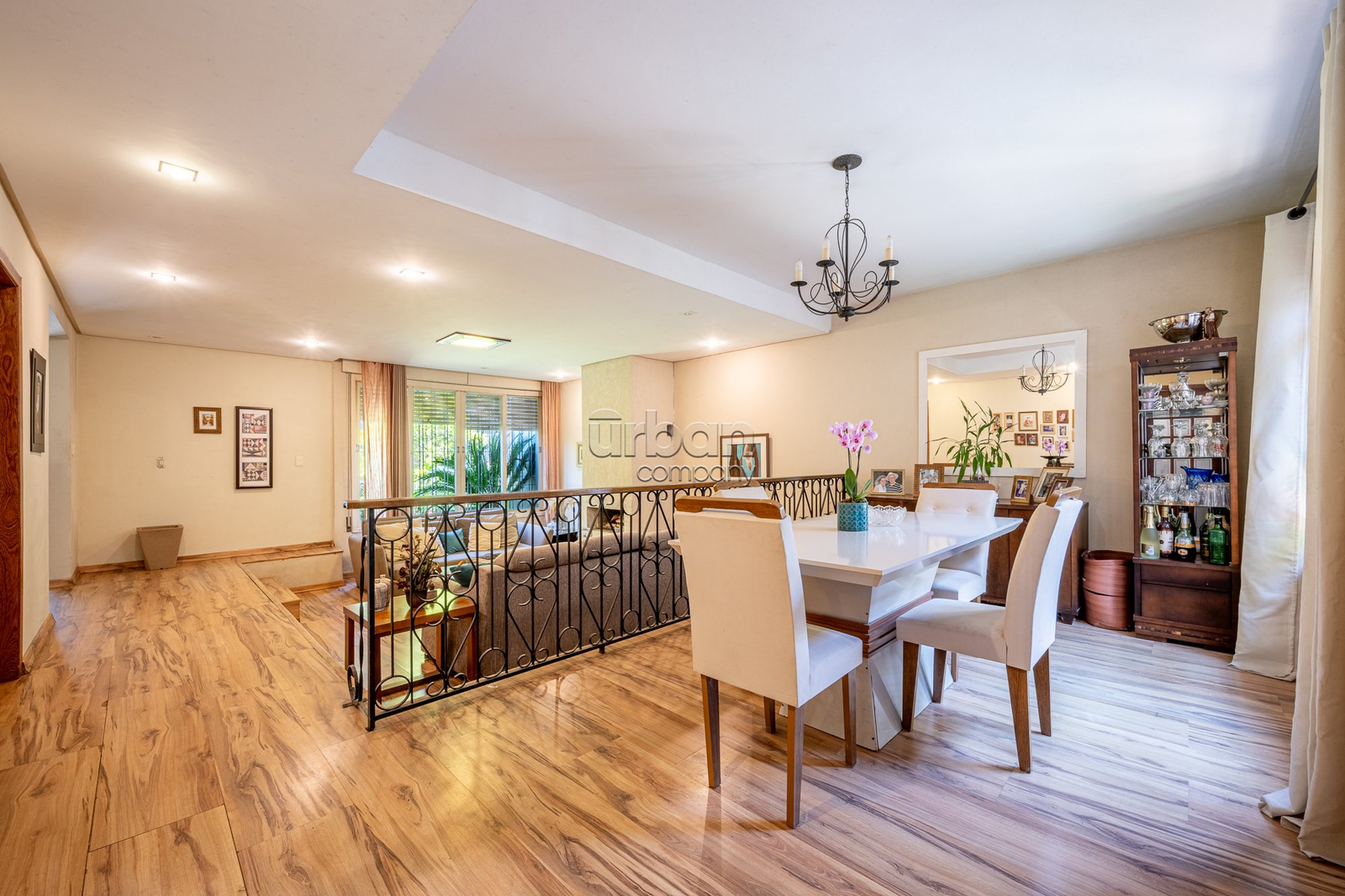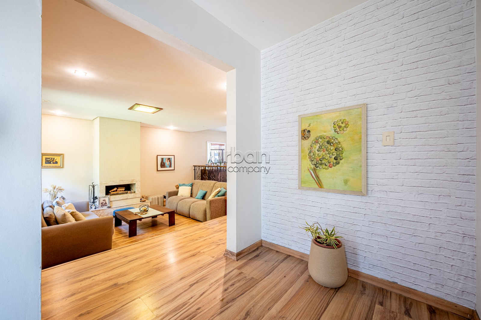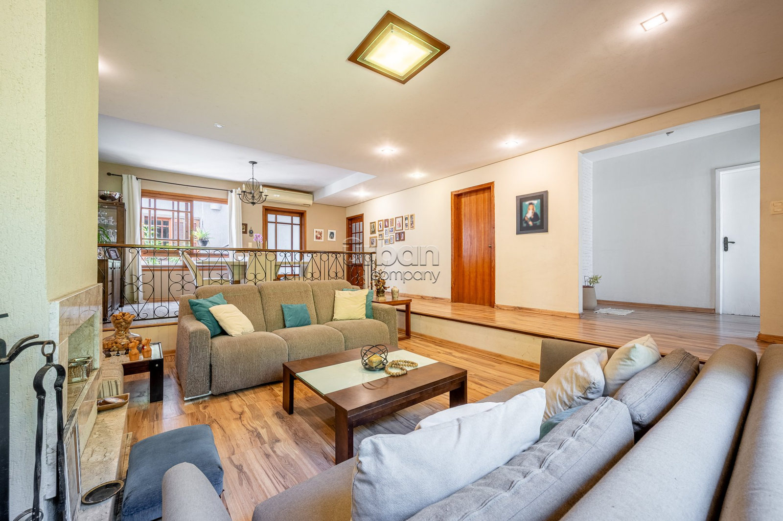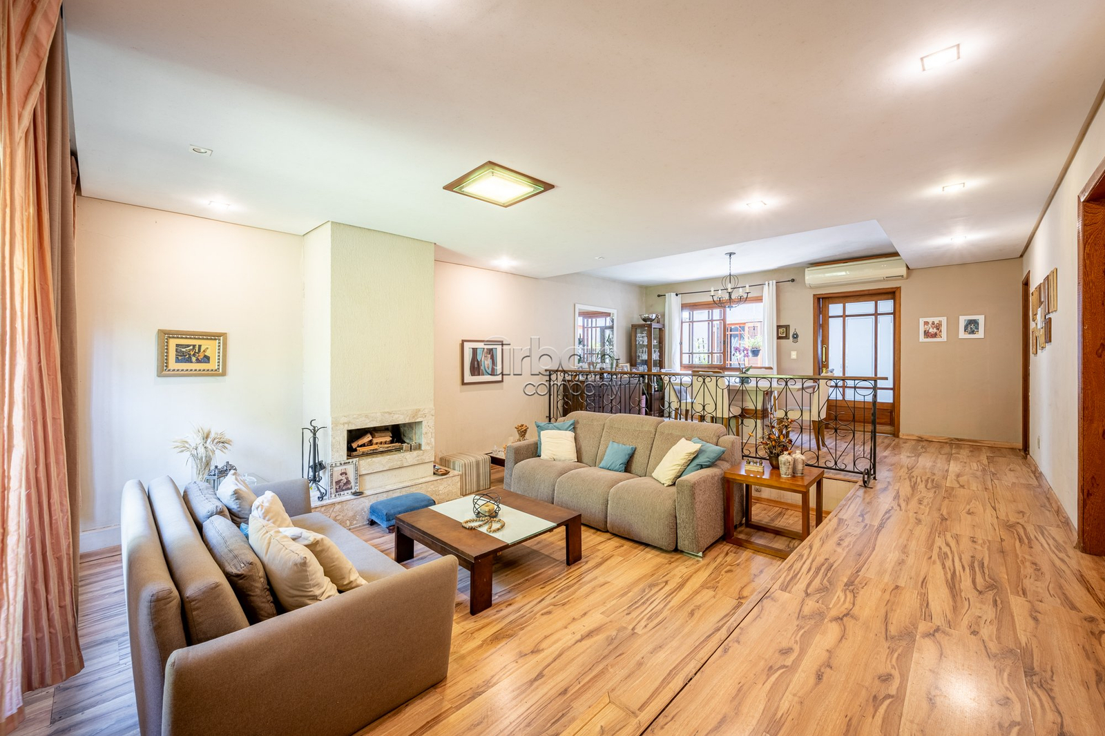 No pavimento principal, a casa conta com 3 dormitórios, sendo 1 suíte, banheiro social, e um escritório espaçoso. O living com lareira integra dois ambientes e ainda possui lavabo e um estar íntimo, ideal para sala de TV ou convivência familiar.