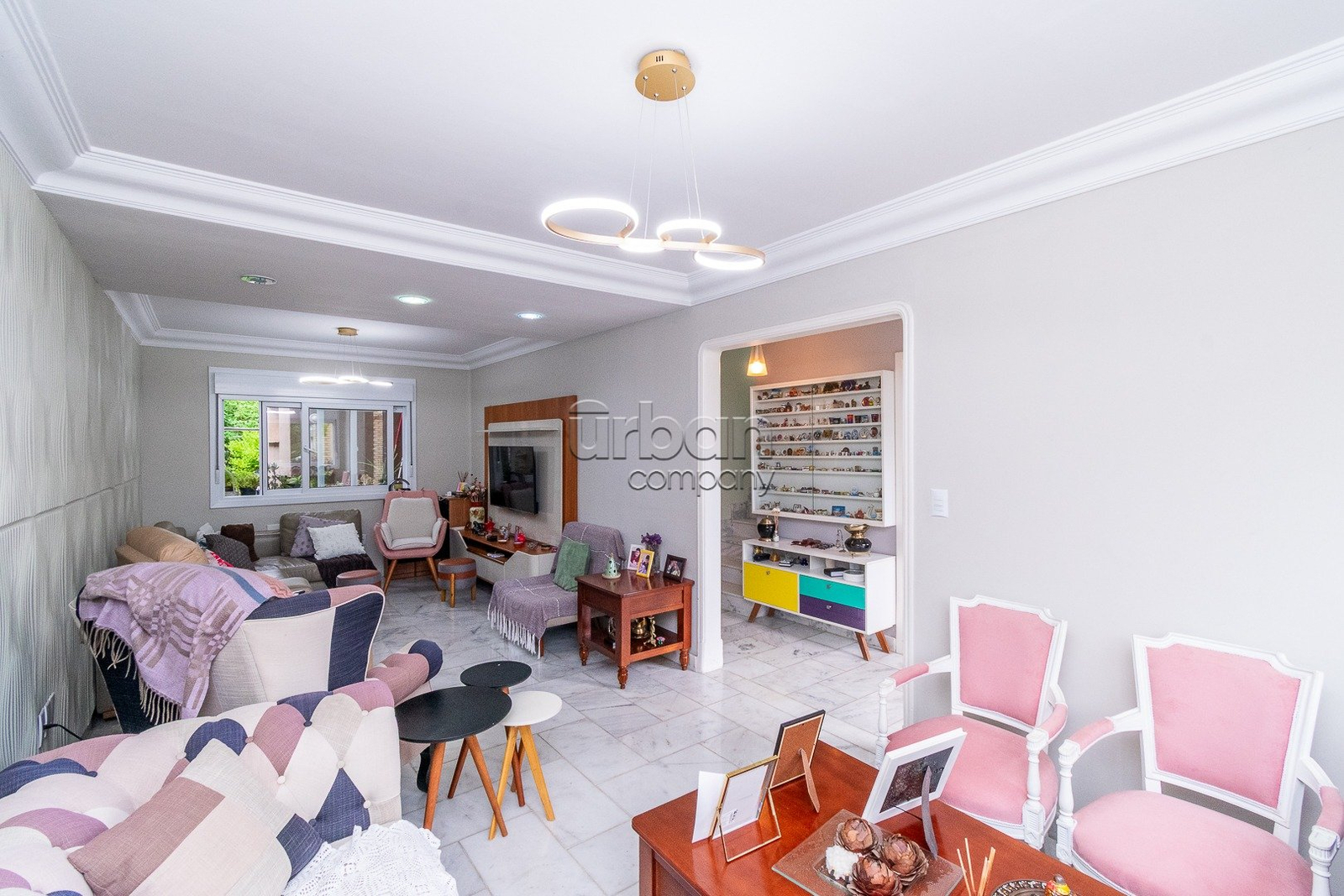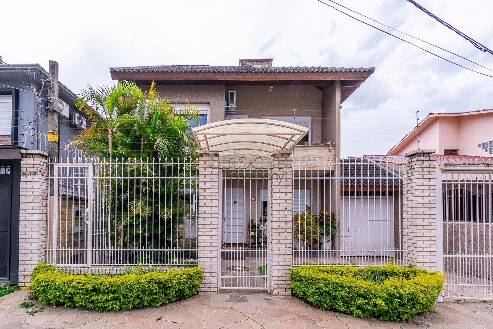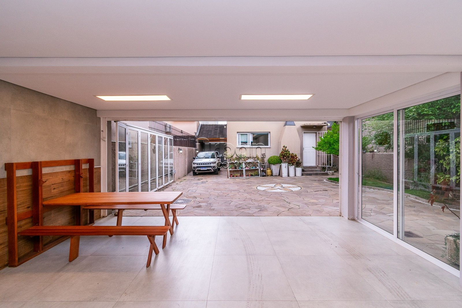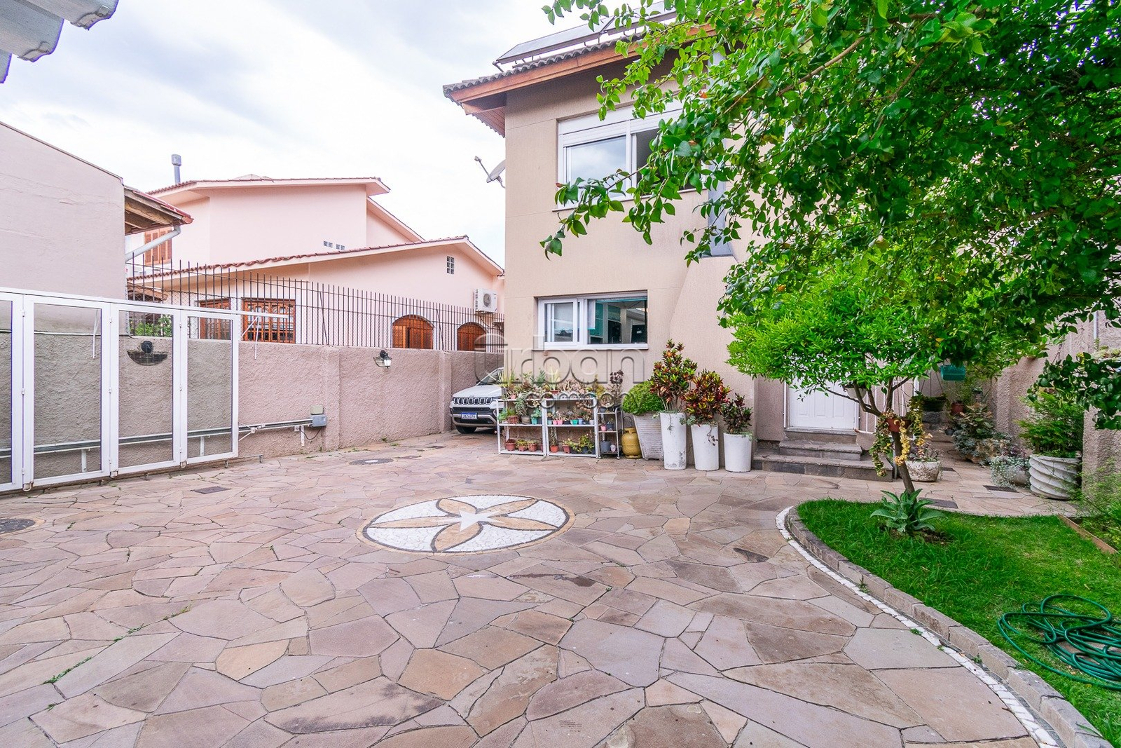 Casa com 4 dormitórios, tendo a seguinte distribuição: no piso de entrada encontramos o living para 2 ambientes, lavabo, espaço para escritório, sala de jantar com adega, cozinha aberta com churrasqueira, despensa e área de serviço. Na parte externa está o pátio que comporta até 5 carros, salão de festas com churrasqueira, mesas dobráveis, banheiro e espaço para dormitório ou depósito.