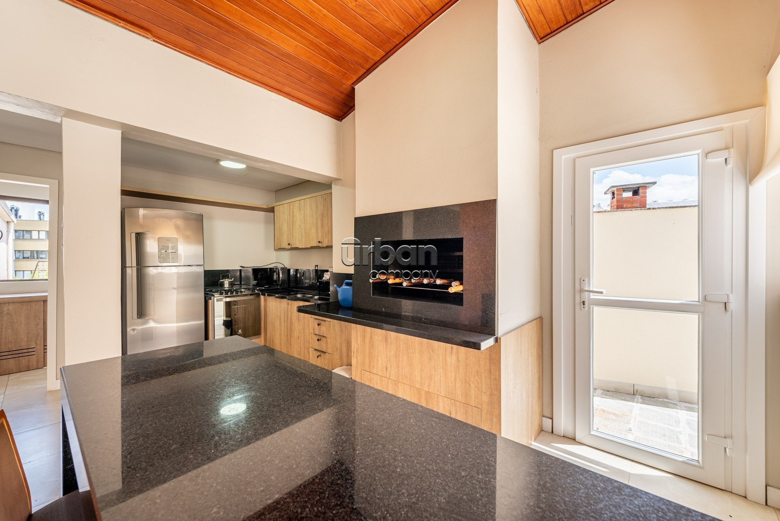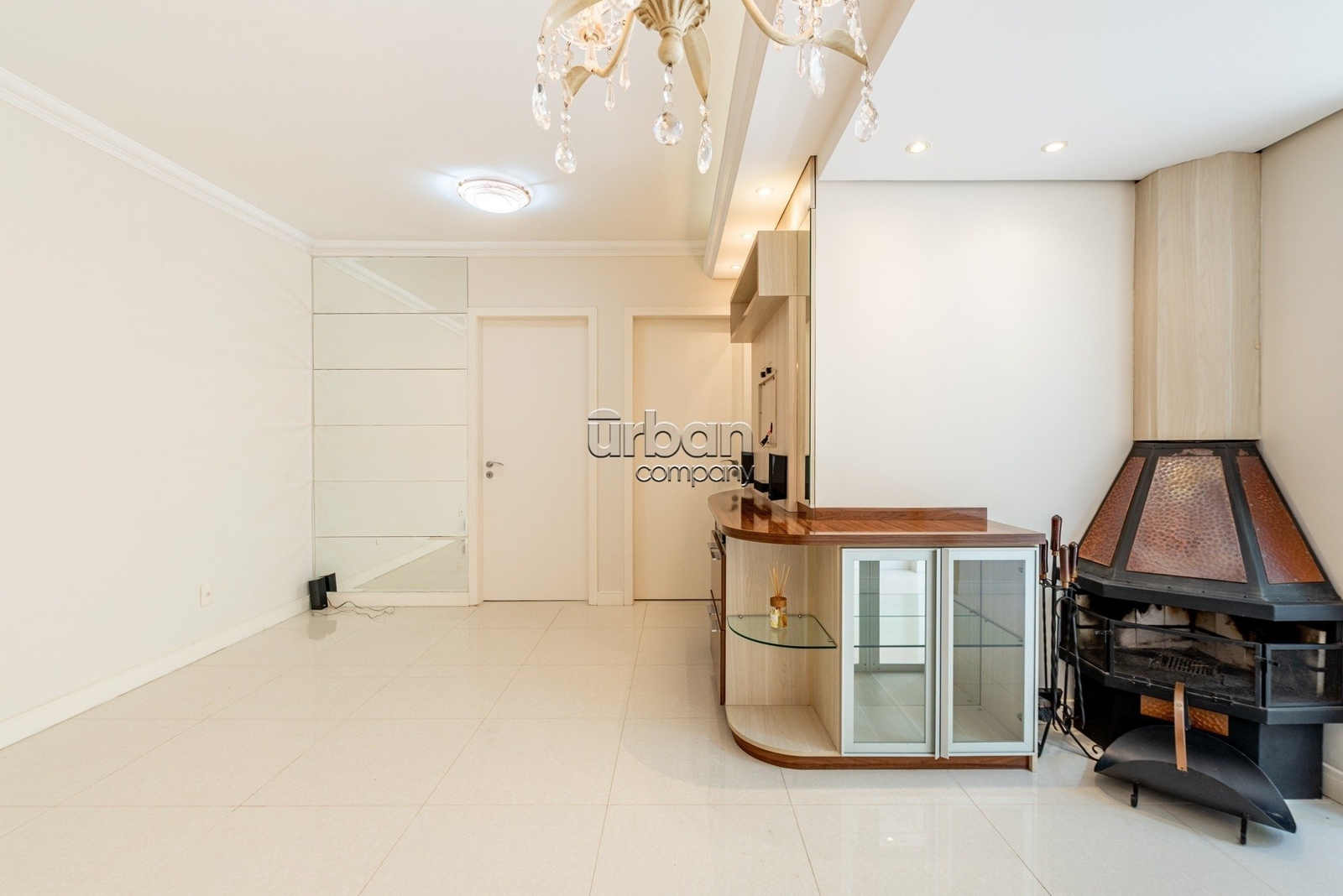 Com 81 m² de área privativa, o apartamento semimobiliado oferece living para dois ambientes, lareira, churrasqueira, cozinha planejada e área de serviço independente.