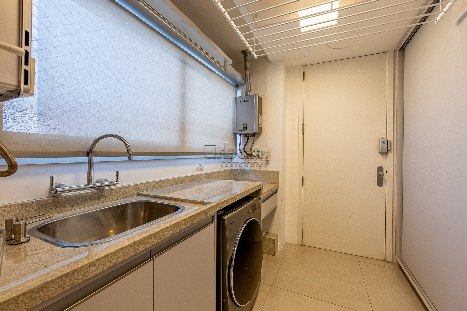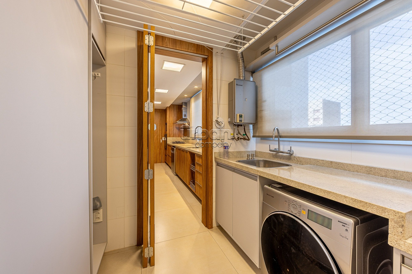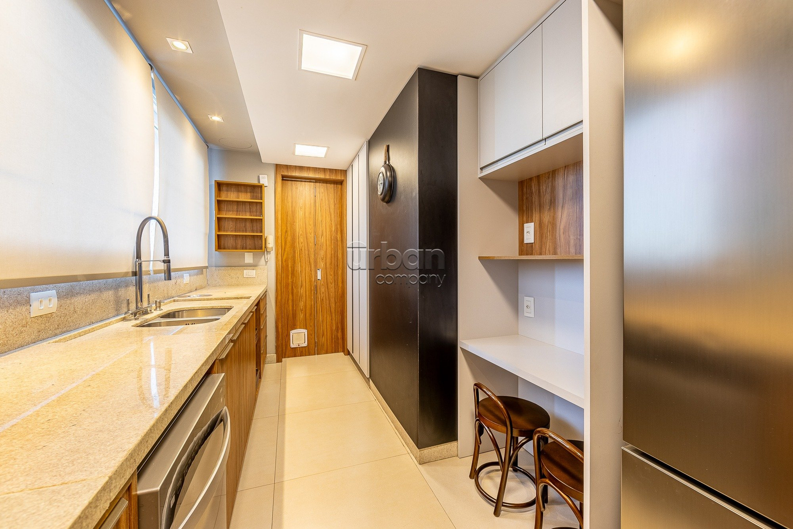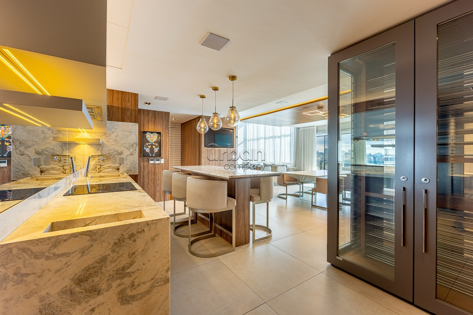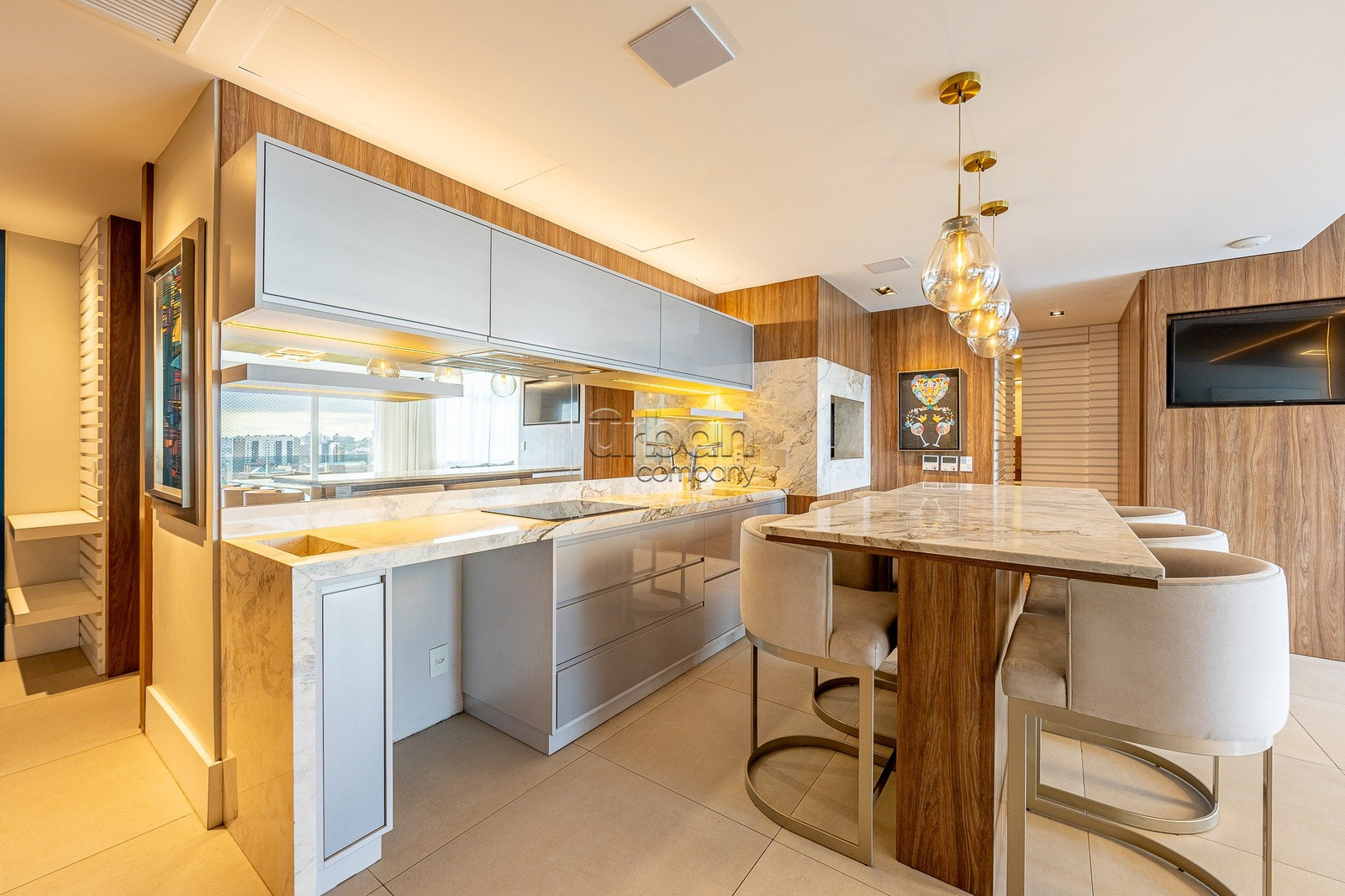 A área gourmet foi pensada para receber com elegância, contando com churrasqueira, bancada de apoio e lavabo, compondo um ambiente ideal para encontros com amigos e familiares. A cozinha é funcional e bem equipada, com área de serviço independente e dependência completa, garantindo praticidade na rotina.