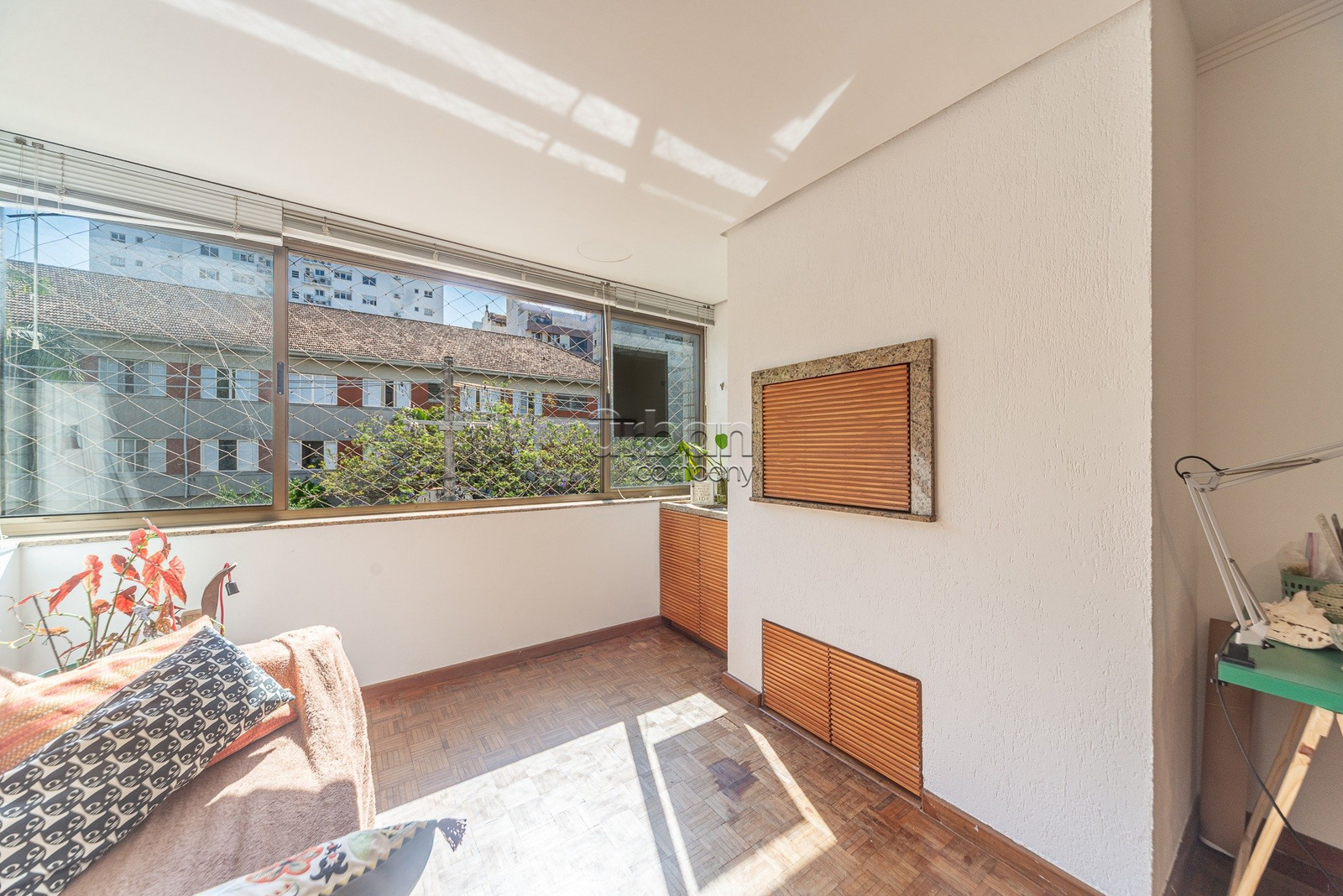 O living para dois ambientes conta com lareira, churrasqueira e lavabo, além de cozinha integrada e área de serviço separada. O apartamento permanece semi mobiliado, com móveis fixos e sob medida.