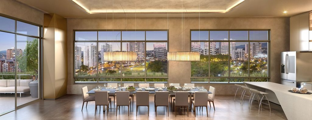 No segundo pavimento: living 3 ambientes, cozinha gourmet com churrasqueira, pé direito duplo e elevador privativo codificado.