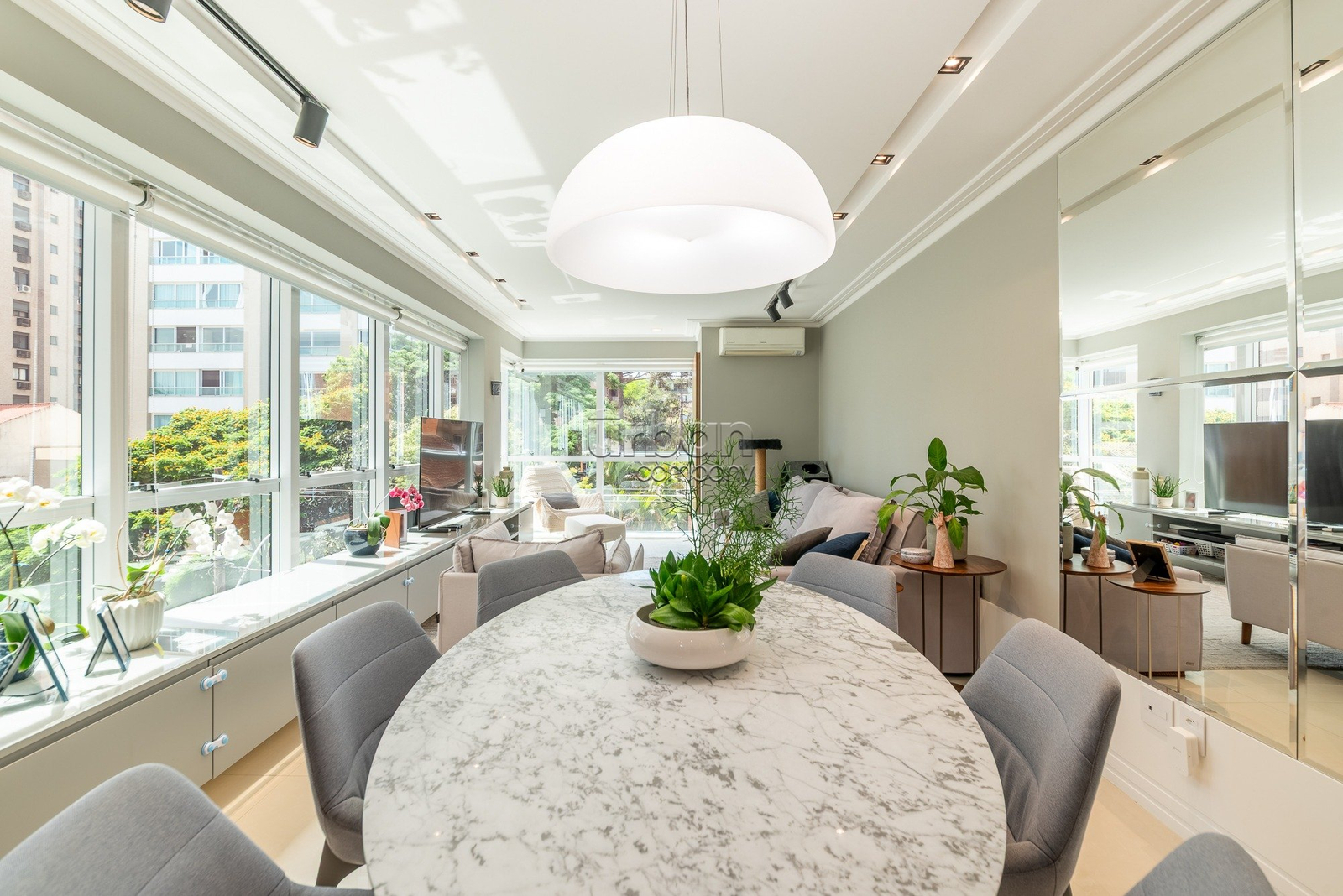 O living é amplo com esquadrias de piso ao teto que proporcionam excelente luminosidade e uma sensação de amplitude, além de uma bela vista para a copa das árvores e ótima orientação solar.