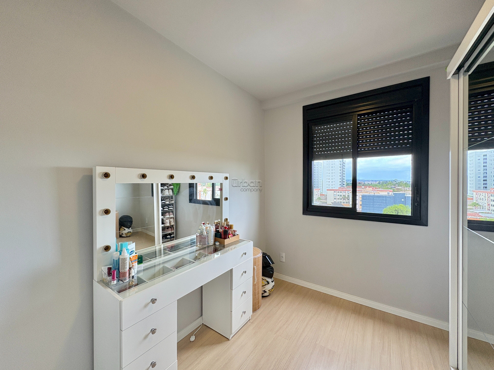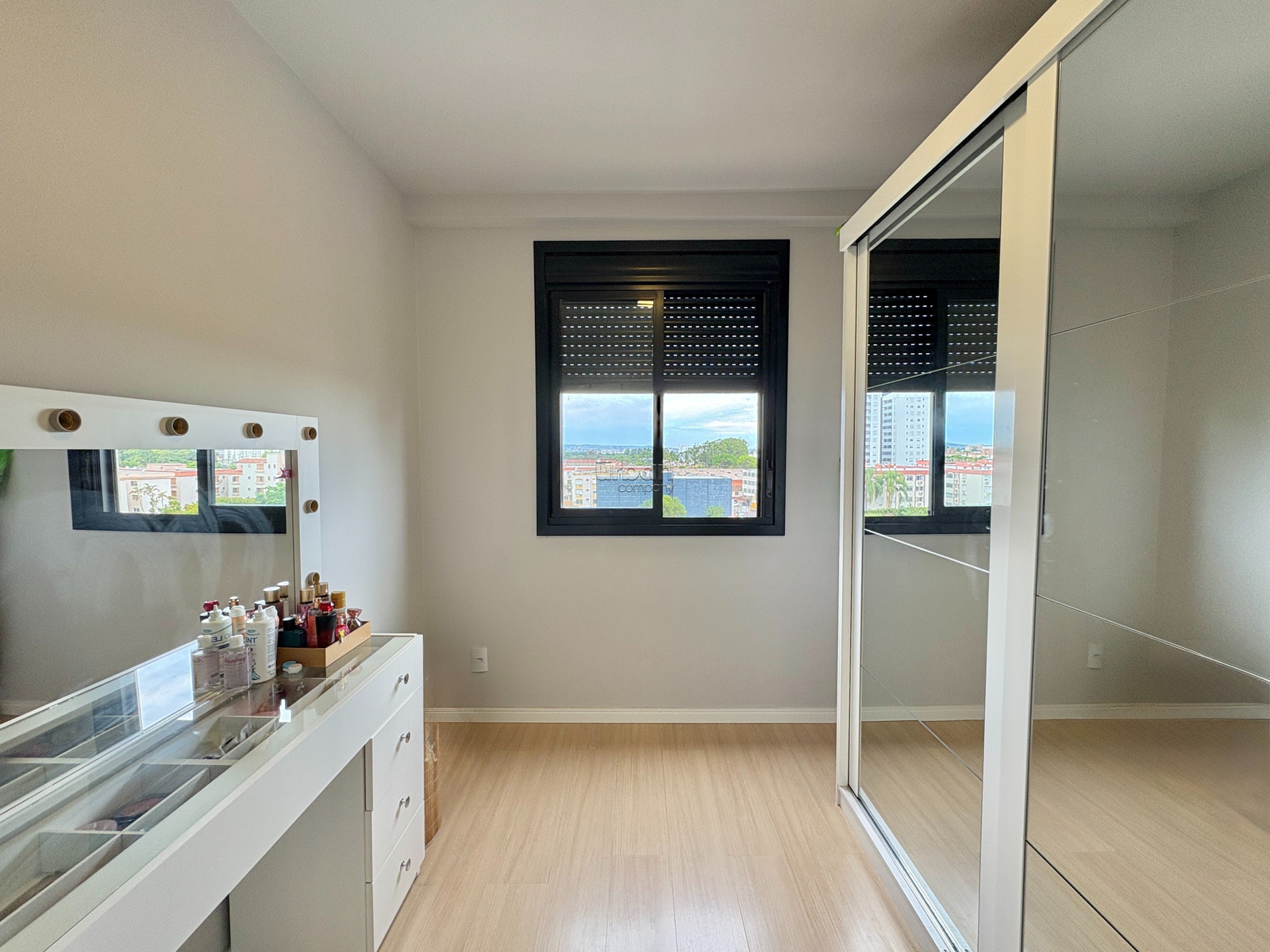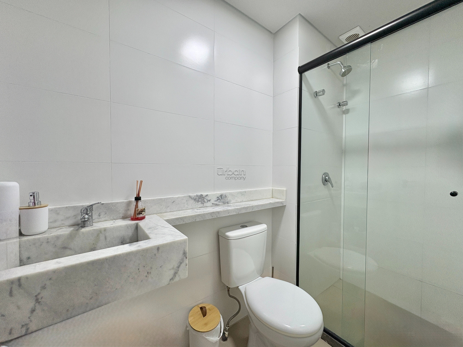 A cozinha é planejada, com bancadas em mármore, e o banheiro possui acabamento marmorizado, agregando sofisticação ao ambiente. Possui rebaixo em gesso em todo o apartamento, porcelanato na sala, cozinha e sacada e piso laminado nos dormitórios.