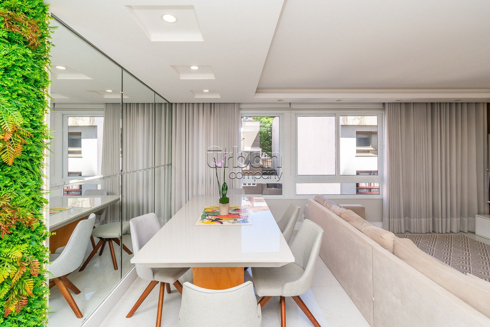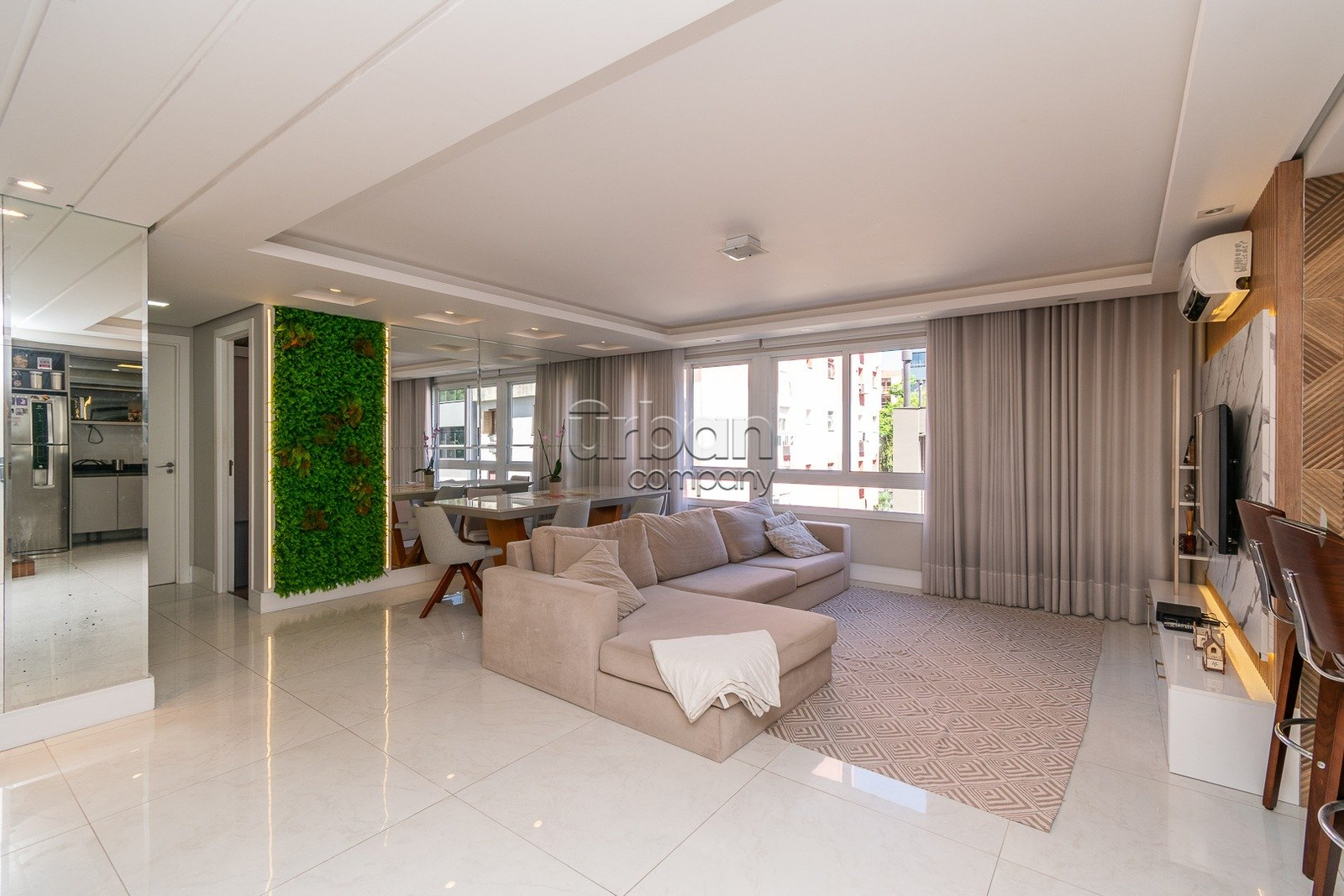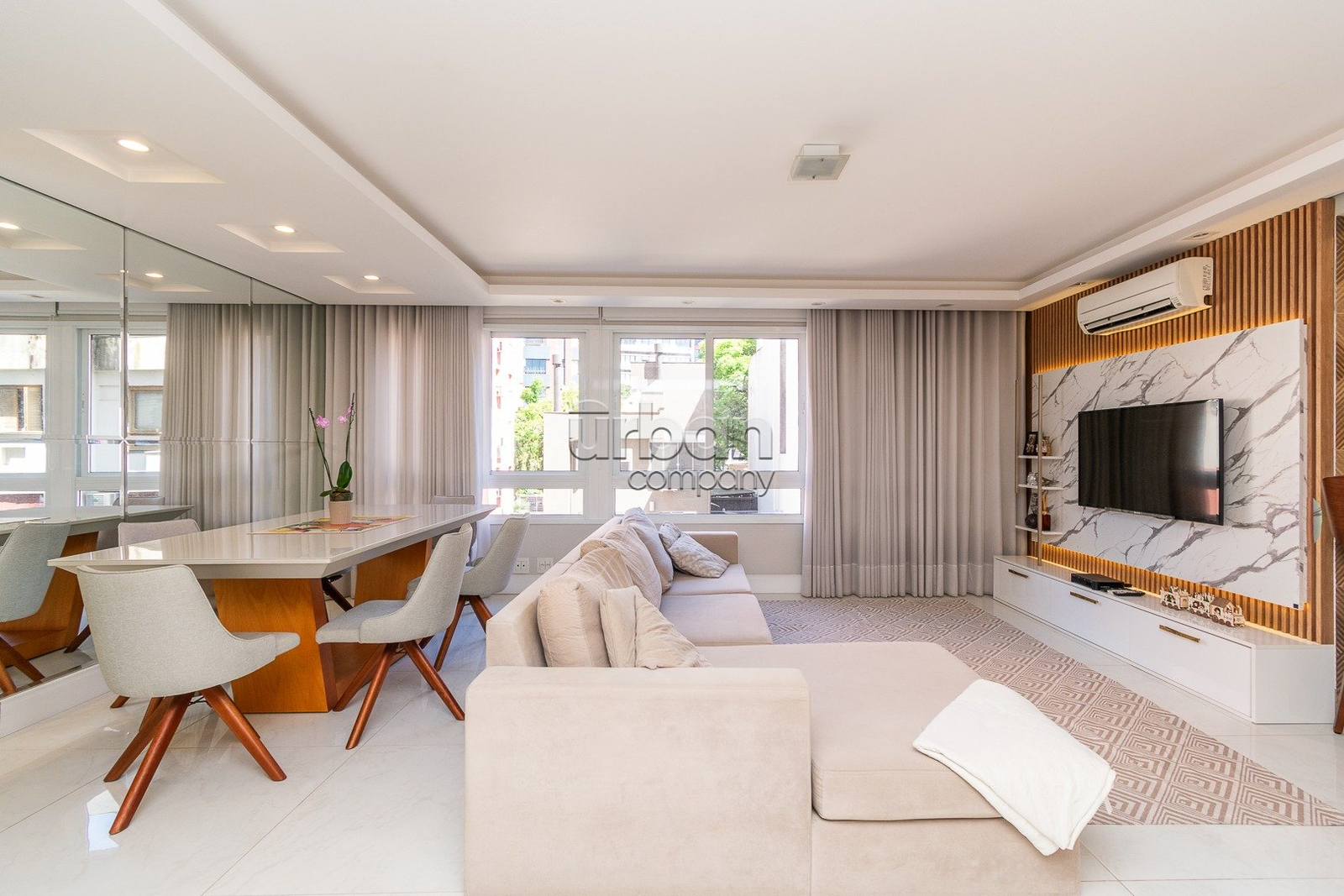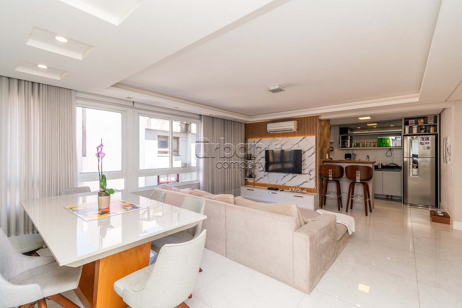 Apartamento semi-mobiliado com 90m² de área privativa, decorado por arquiteto. Planta originalmente de 3 dormitórios, foi inteligentemente adaptada para 2 dormitórios, ampliando o living e proporcionando uma área social mais integrada e confortável, com fácil reversão para a configuração.