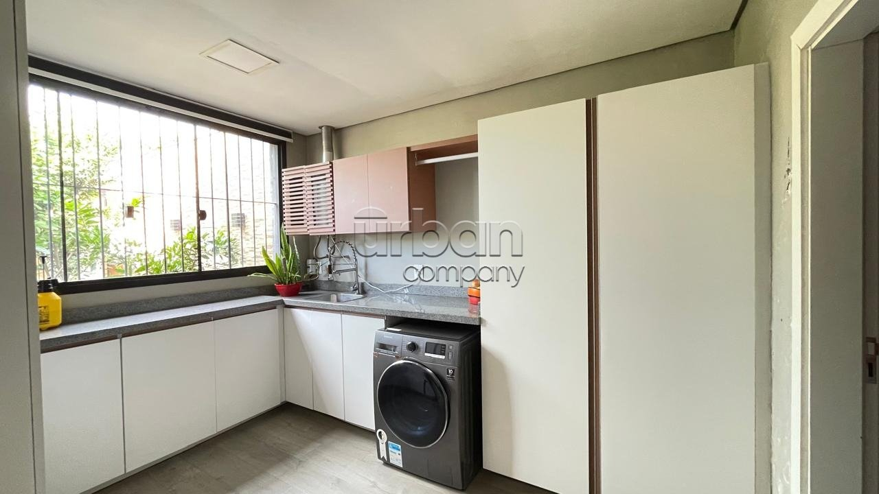 Sala e cozinha integrados, banheiro social e lavanderia espaçosa.