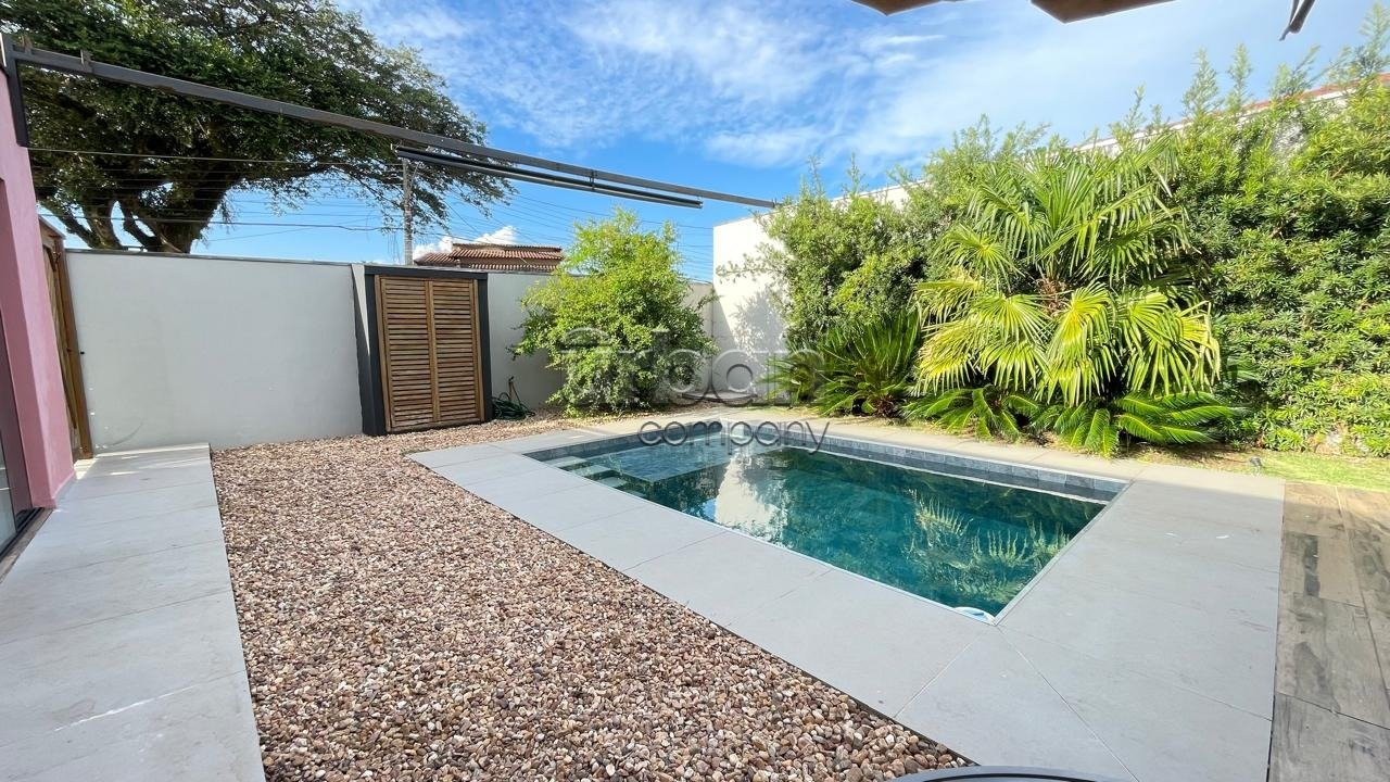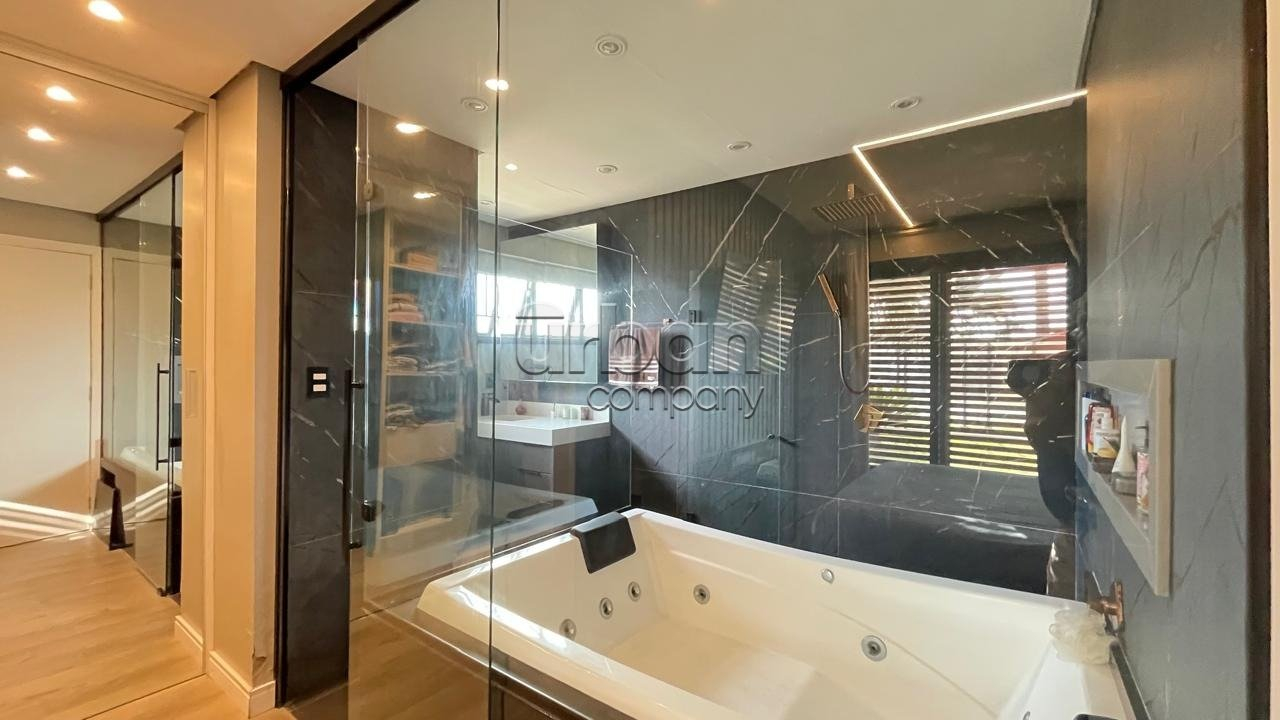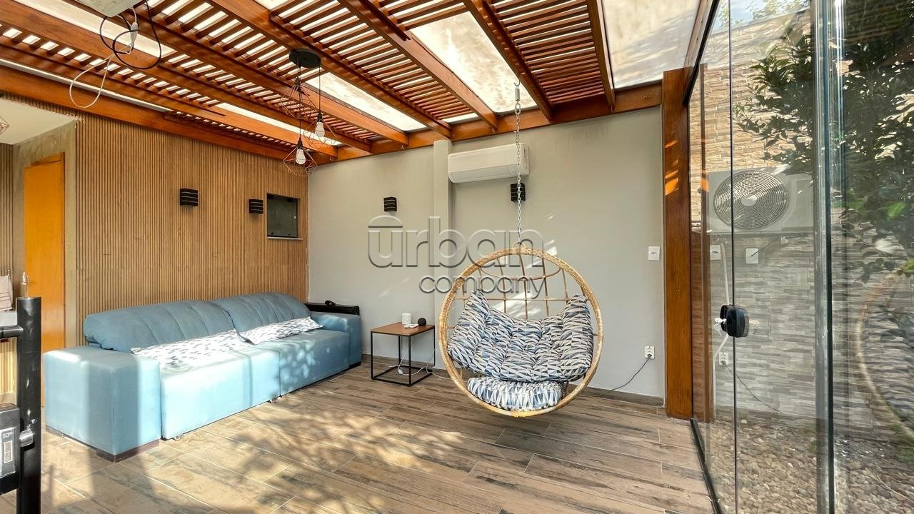 Área de lazer próxima à piscina, fechada com portas de vidro, com banheiro e ar condicionado, podendo ser usada também como home-office ou uma segunda suíte.