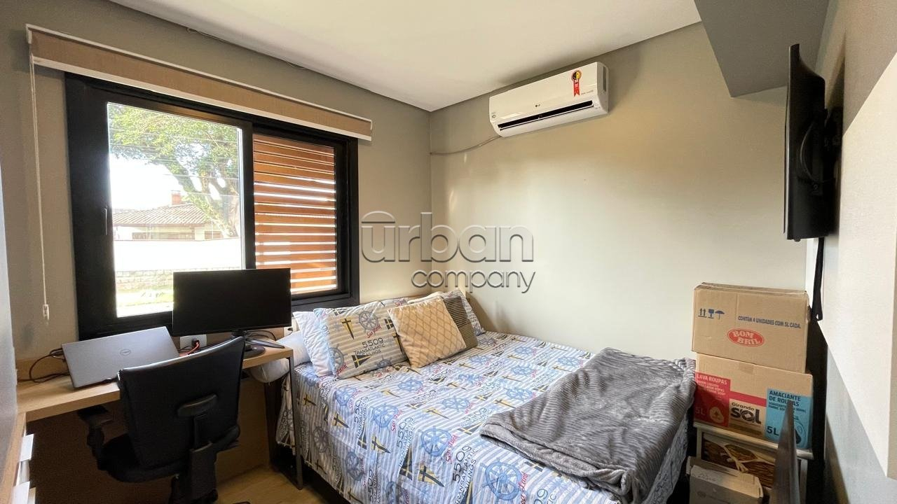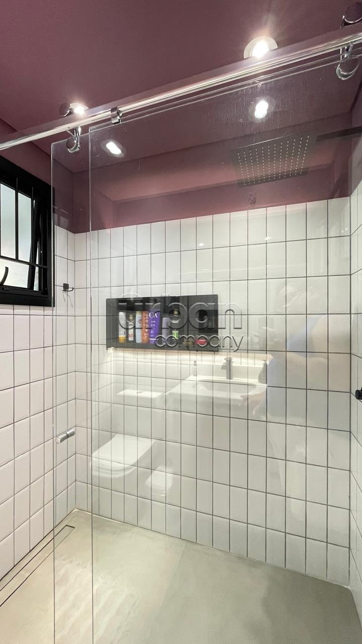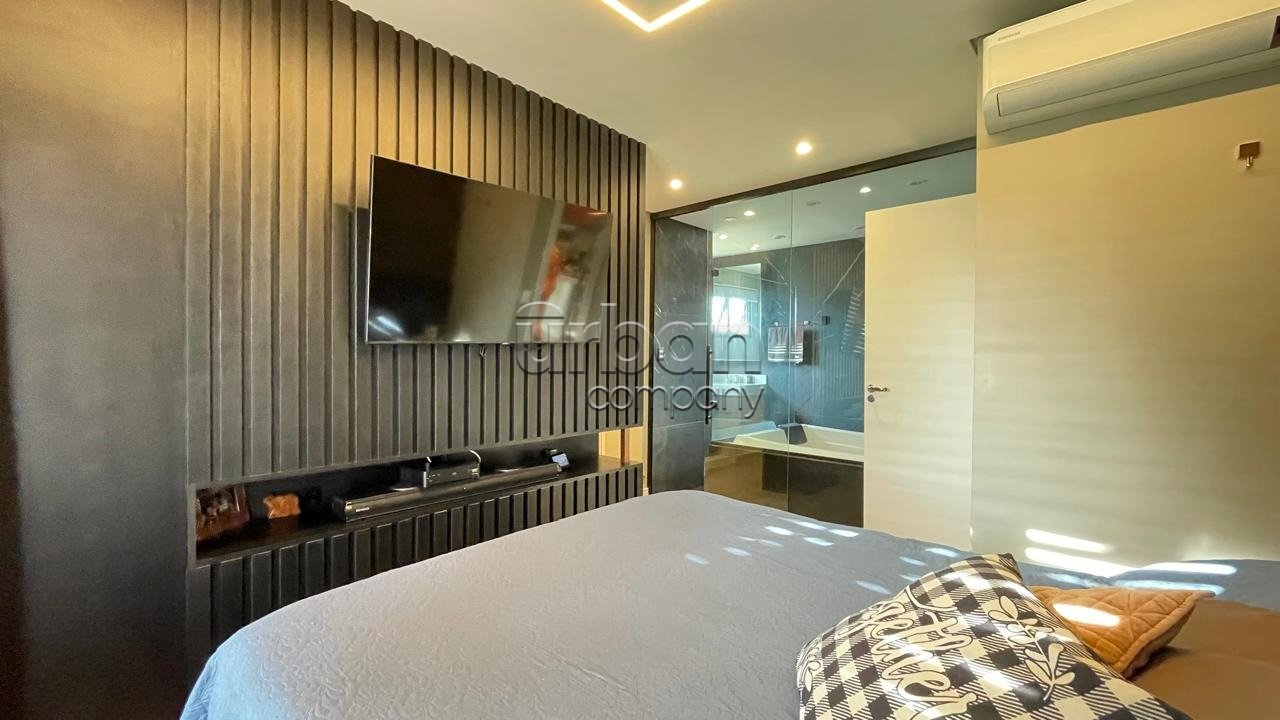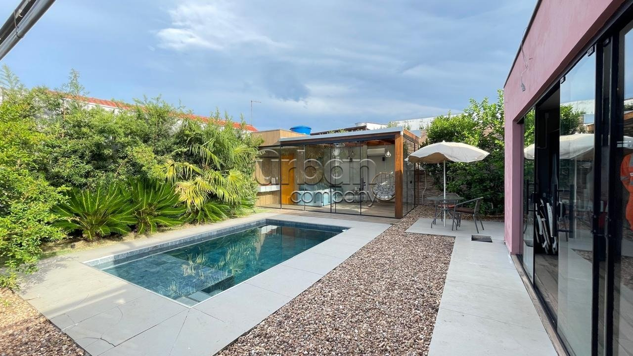 Área de lazer próxima à piscina, fechada com portas de vidro, com banheiro e ar condicionado, podendo ser usada também como home-office ou uma segunda suíte.