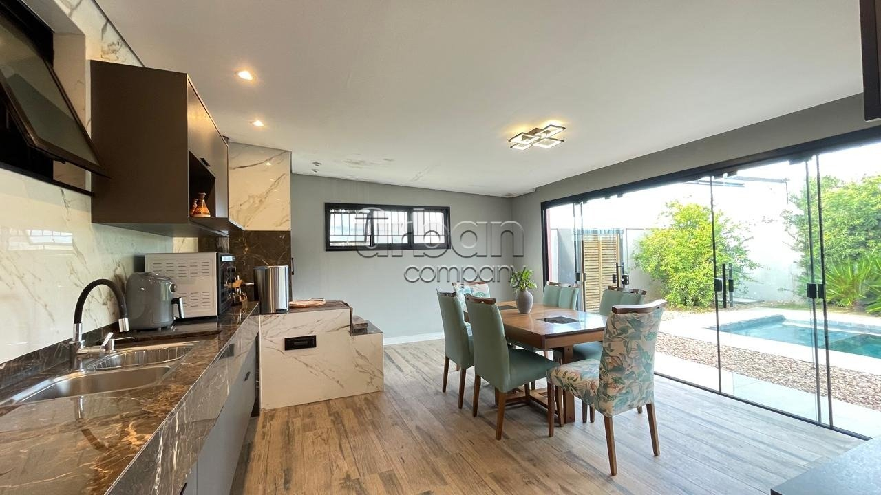 Área gourmet completa com fogão campeiro e móveis, integrada com a piscina.