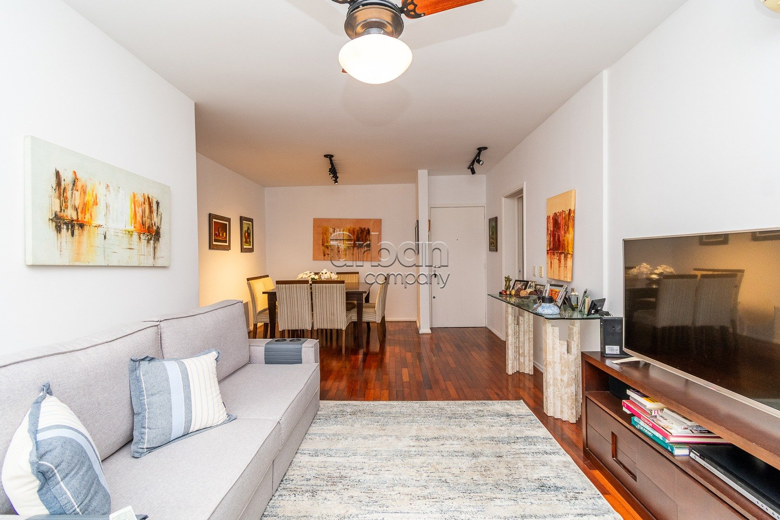 O apartamento possui ampla área social com sala de jantar com mesa para 8 lugares, sala de estar com sacada, cozinha separada com copa, lavanderia e dependência de empregada.