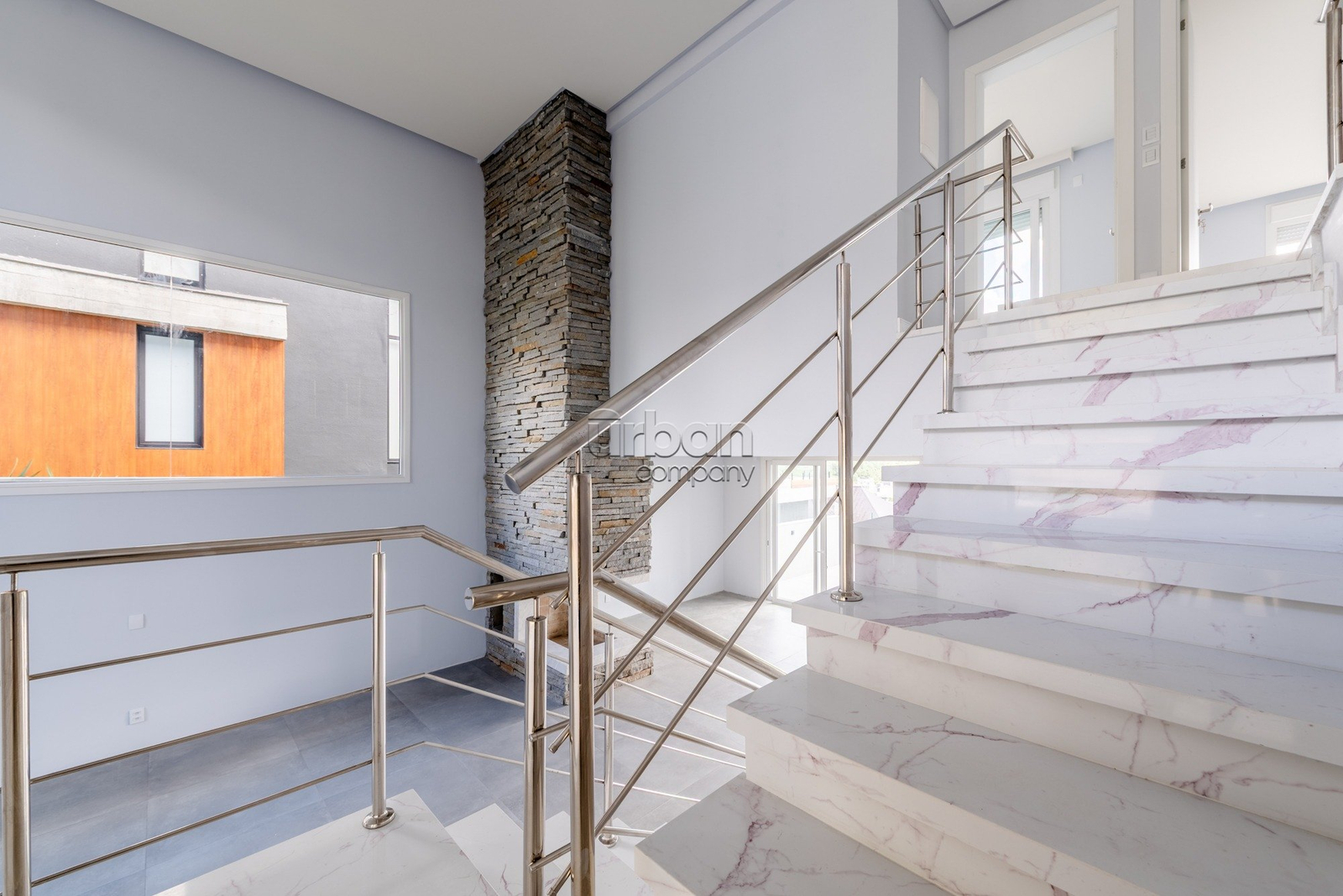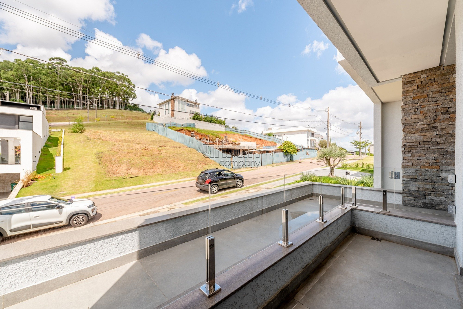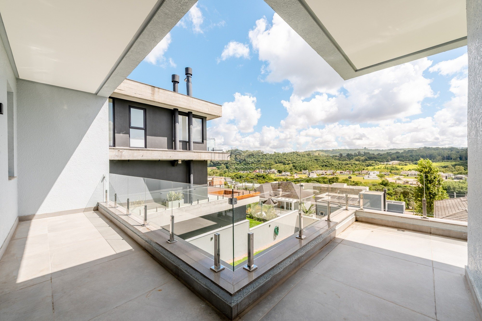 2° PAVIMENTO: Escada com acabamento em porcelanato branco com veios lilás. Três suítes ( 3 suítes, lavabo, gabinete/ dormitório e 4 vagas garagem ) com imponentes portas com persianas eletrônicas que acessam a sacada integrada entre as duas suítes, com vista panorâmica. A terceira suíte localizada na parte frontal da casa, considerando a excelente posição solar, planejaram uma bela sacada para cultivar um jardim, jardim este que é um verdadeiro alívio para os olhos, proporcionando frescor e uma transição suave entre a rua e o lar!