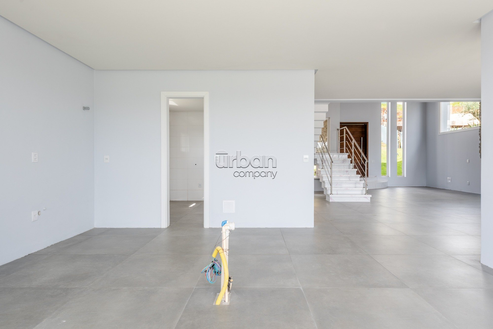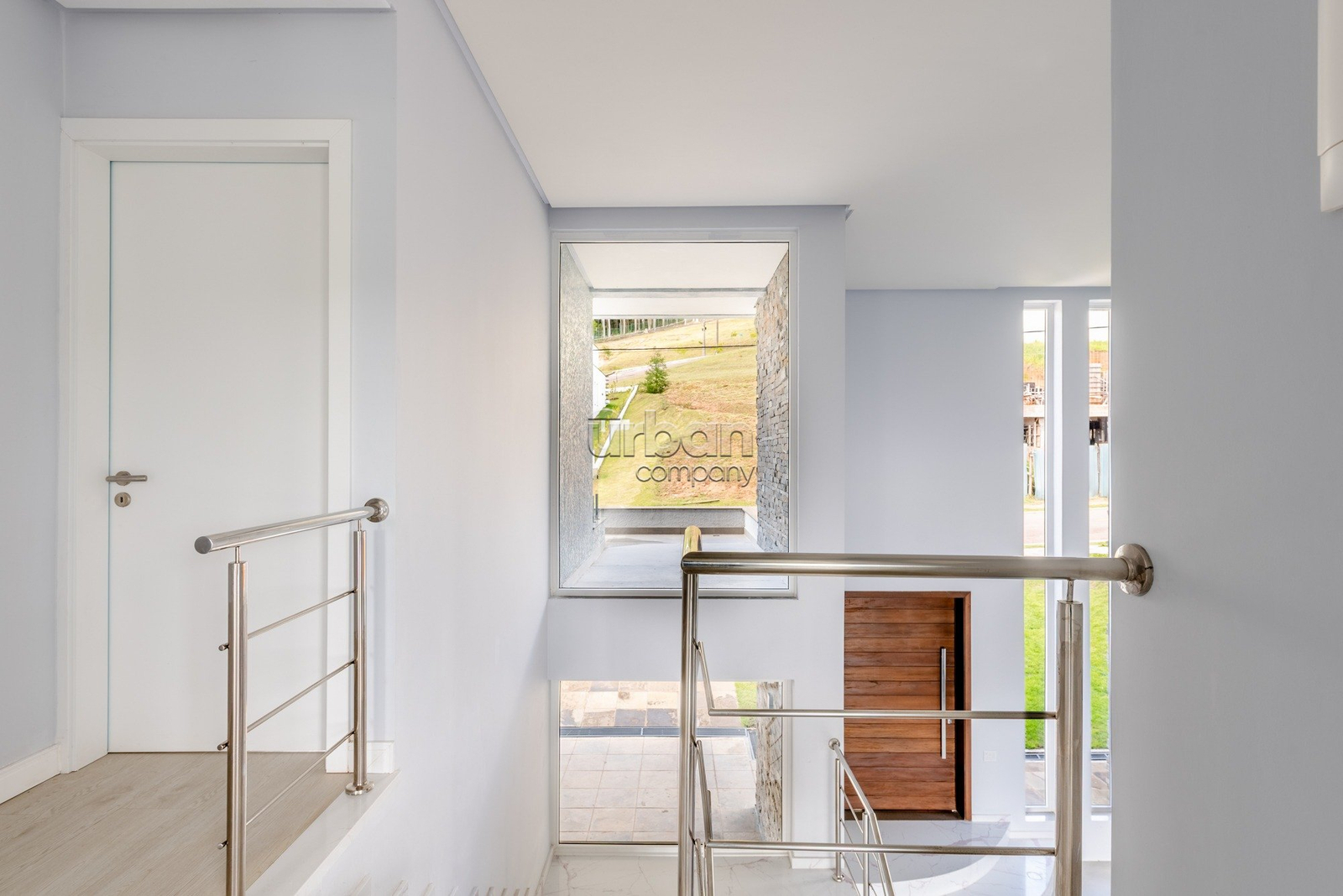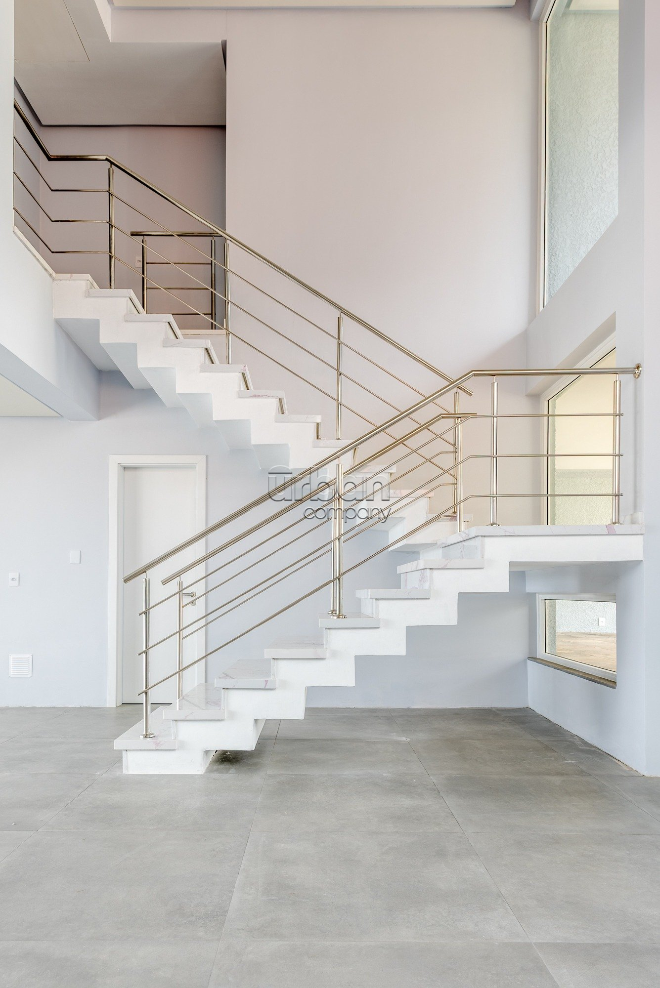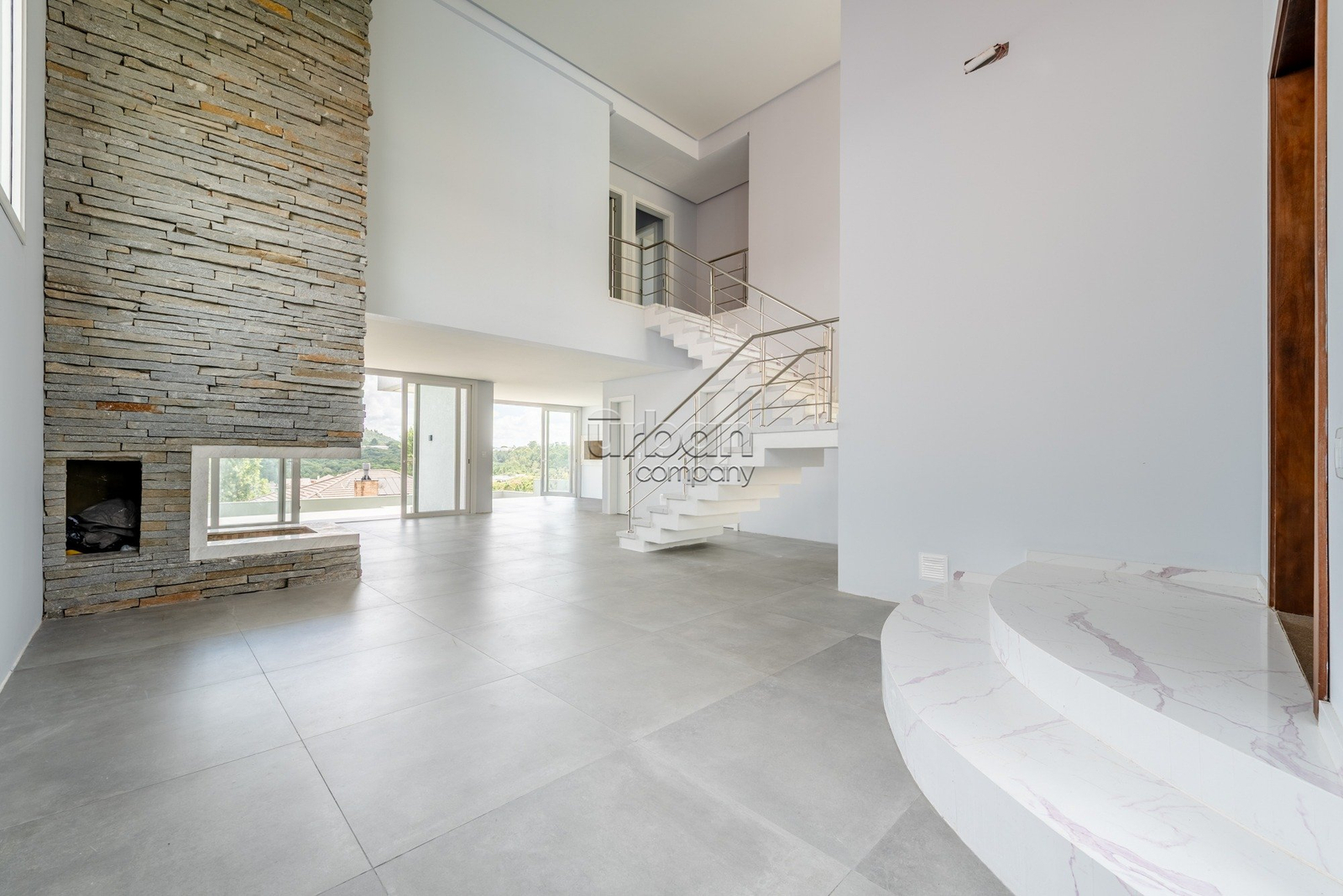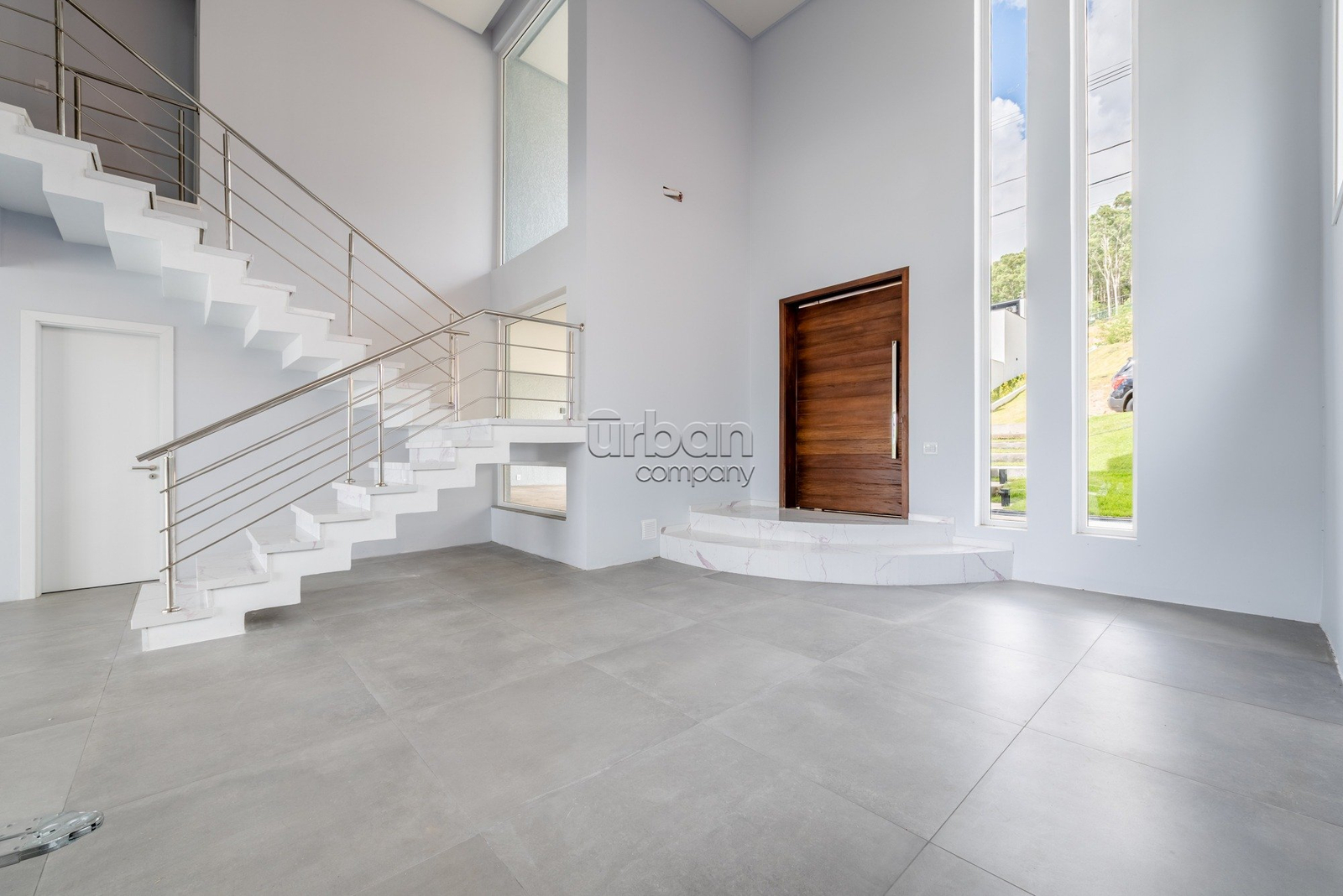 1° PAVIMENTO: O hall de entrada é definido por um pé direito duplo e um portal imponente, com uma porta pivotante de proporções monumentais,