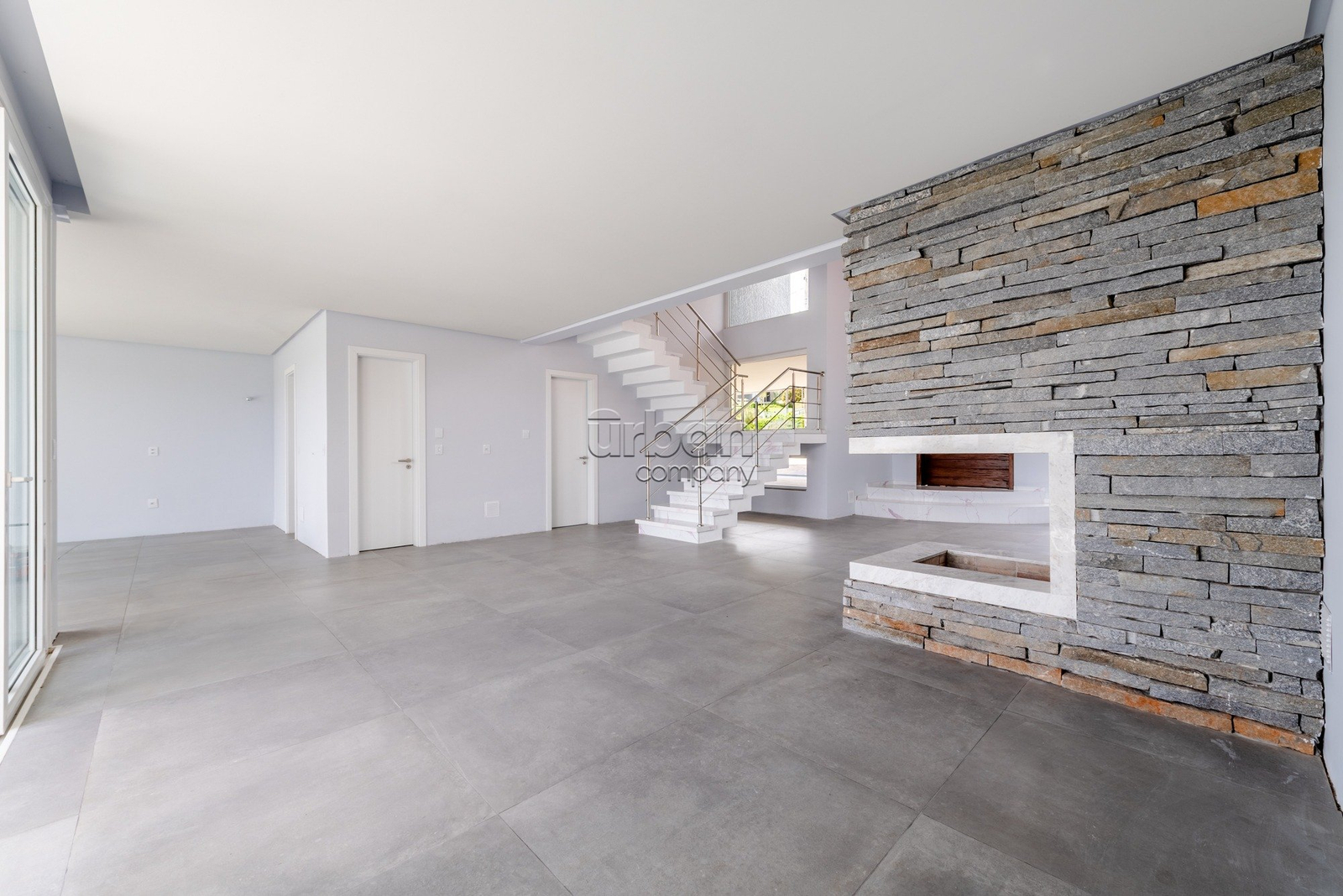 O living em conceito aberto, pé direito duplo, sala de estar, lounge com lareira, cozinha integrada com churrasqueira, dispensa auxiliar, gabinete e um lavabo de apoio.
