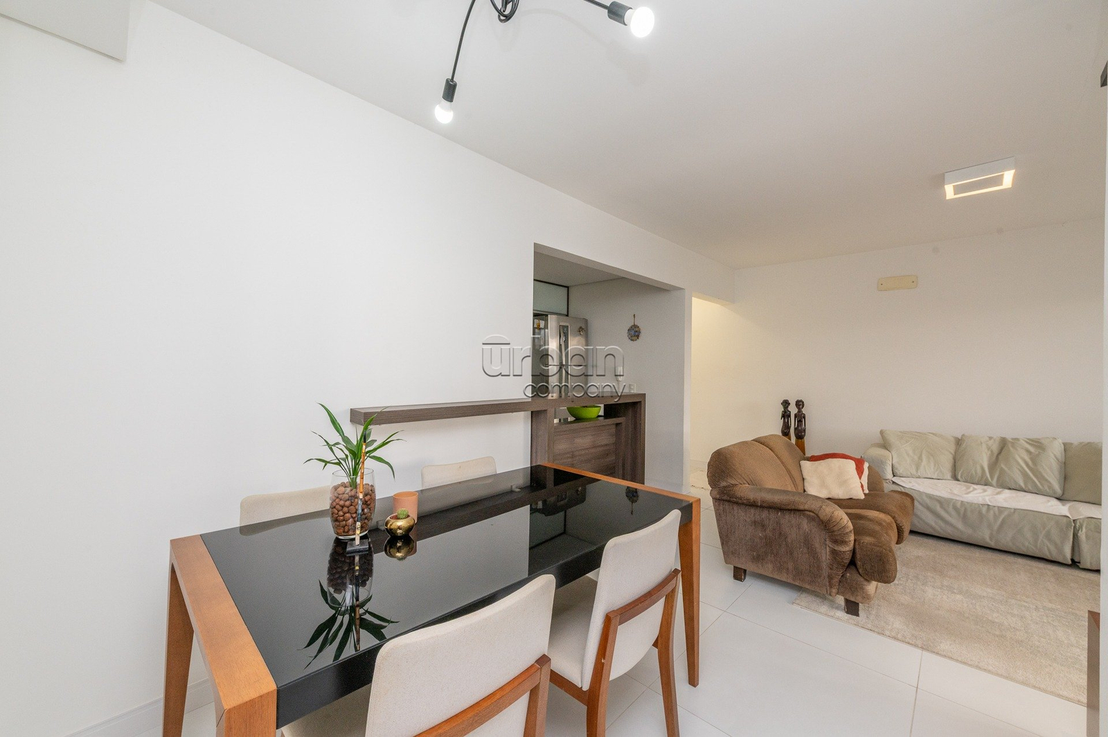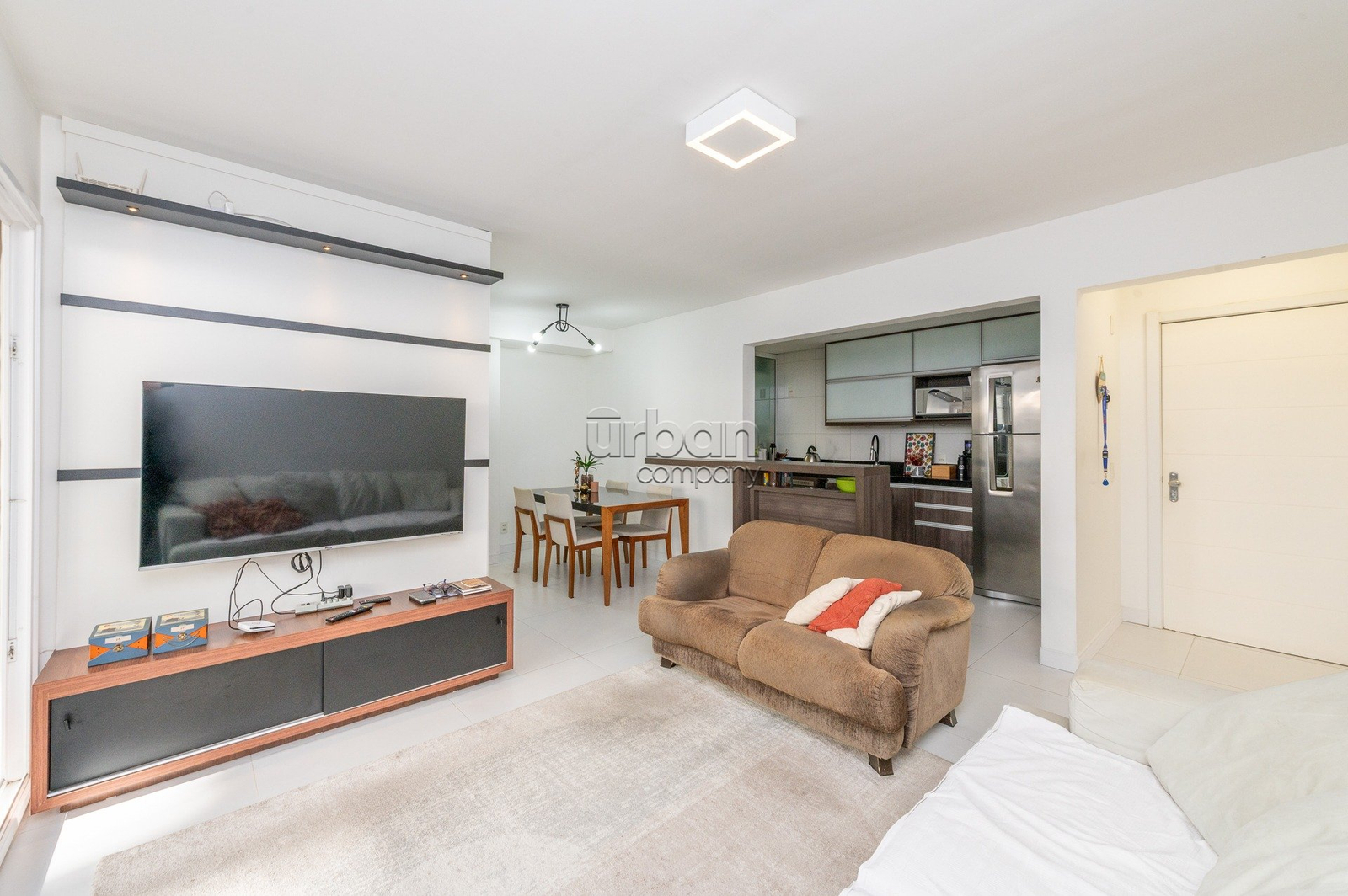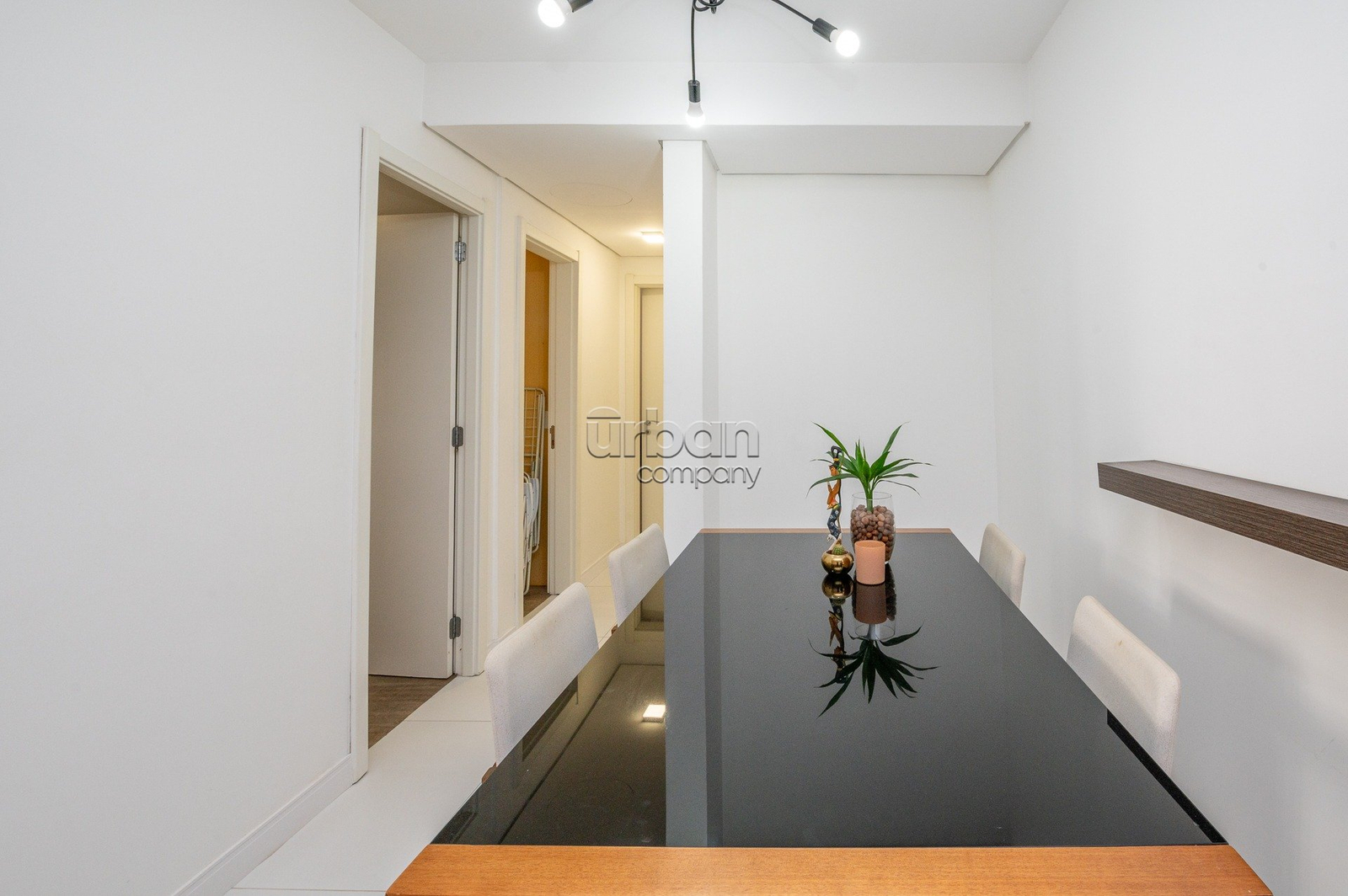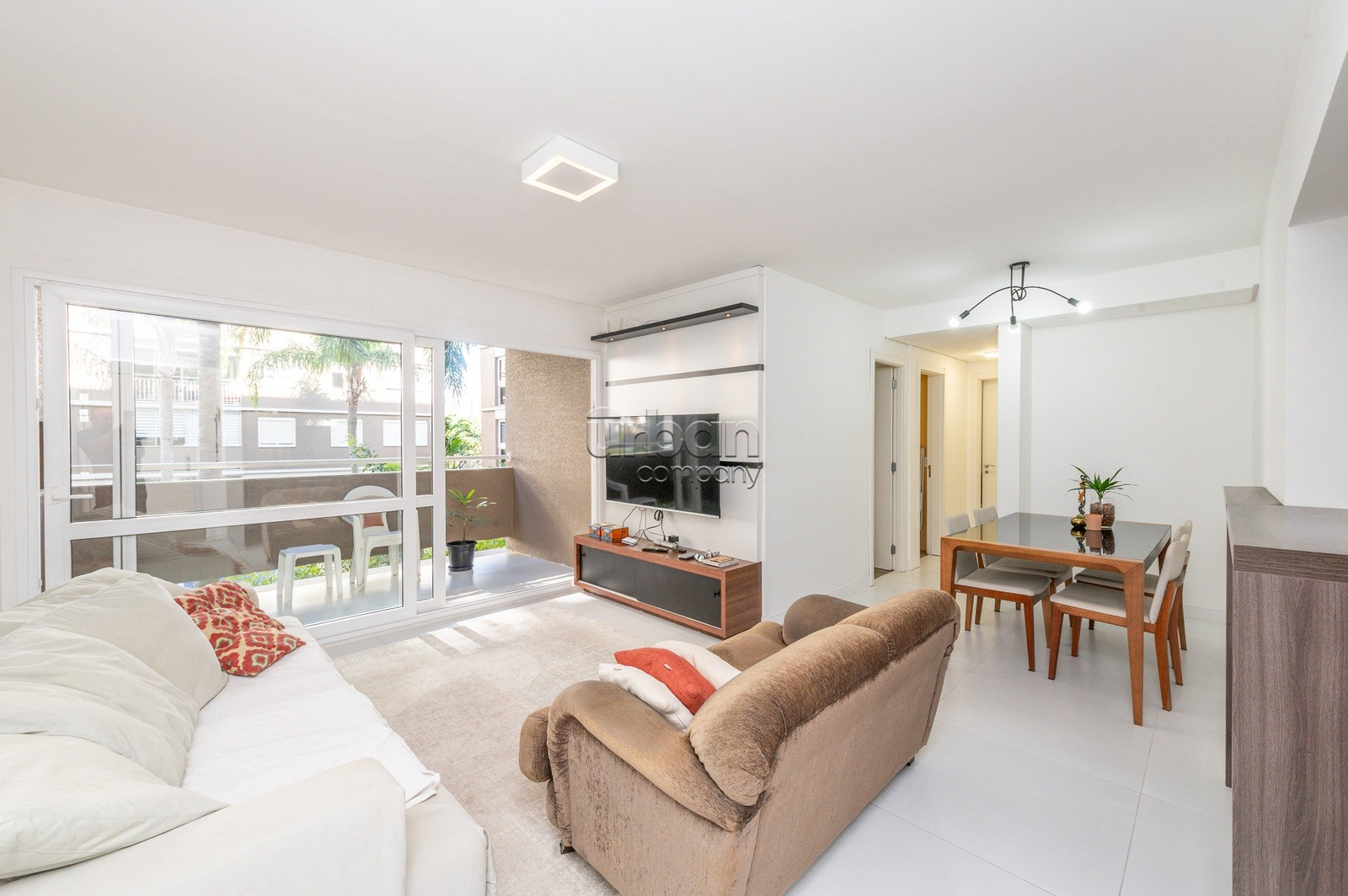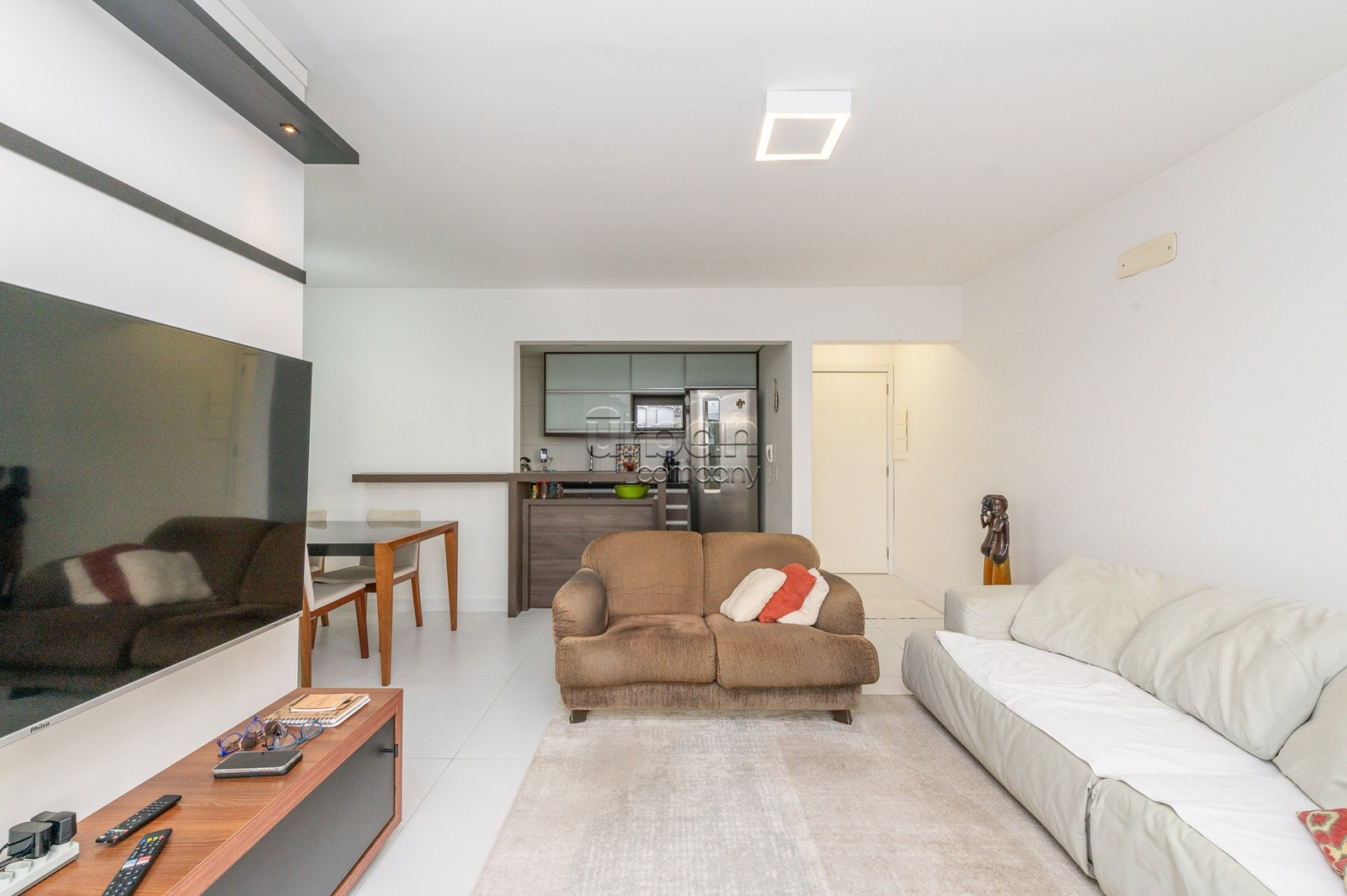 Living para 2 ambientes definidos, com sala de jantar integrada a cozinha americana, sacada aberta com churrasqueira, banheiro social e área de serviço separada.