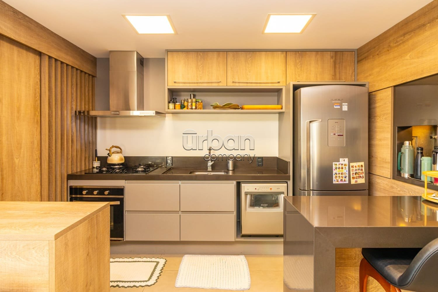 A cozinha é completa, equipada com armários sob medida e churrasqueira, integrando praticidade e elegância ao dia a dia.
