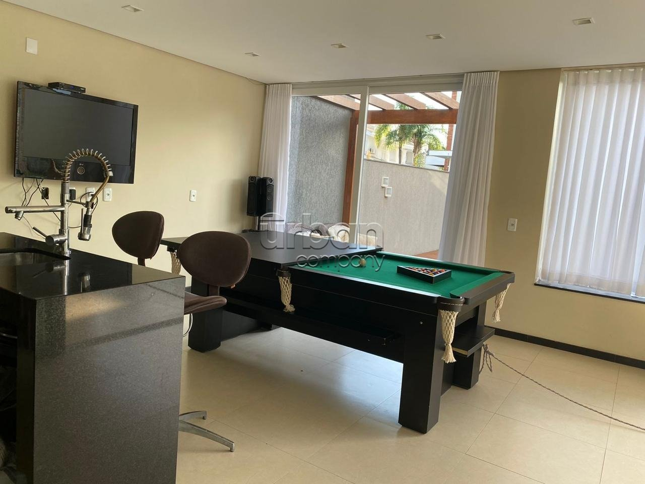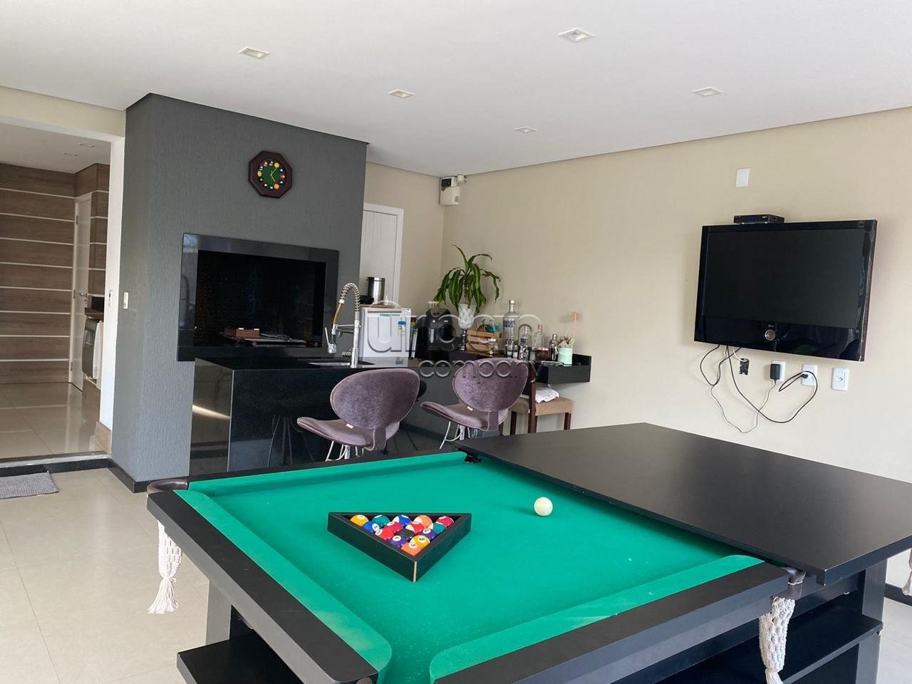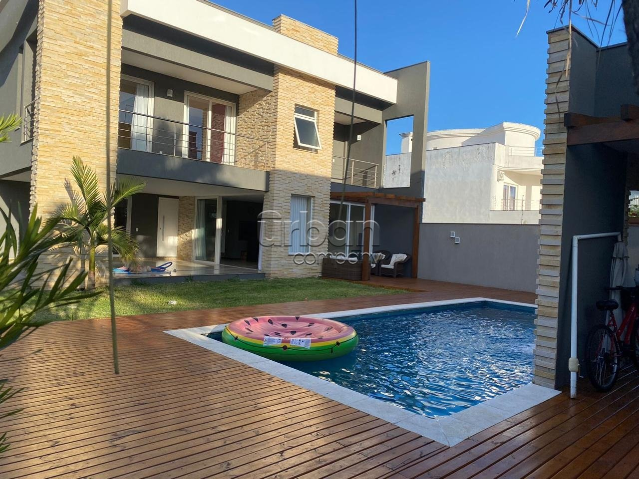 A área de lazer é um dos grandes diferenciais do imóvel: espaçoso ambiente gourmet com churrasqueira e mesa de bilhar, integrado a um deck de madeira que conduz a uma belíssima piscina de 4m x 10m, com cascata e hidromassagem. A piscina é construída em concreto armado e revestida com pastilhas de vidro, evidenciando qualidade e durabilidade. Ao lado da piscina, há ainda banheiro de apoio e depósito.