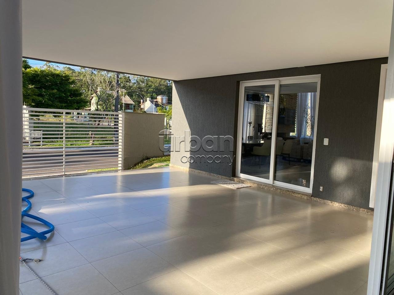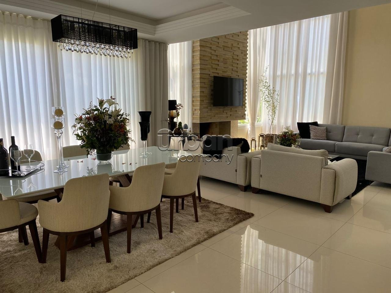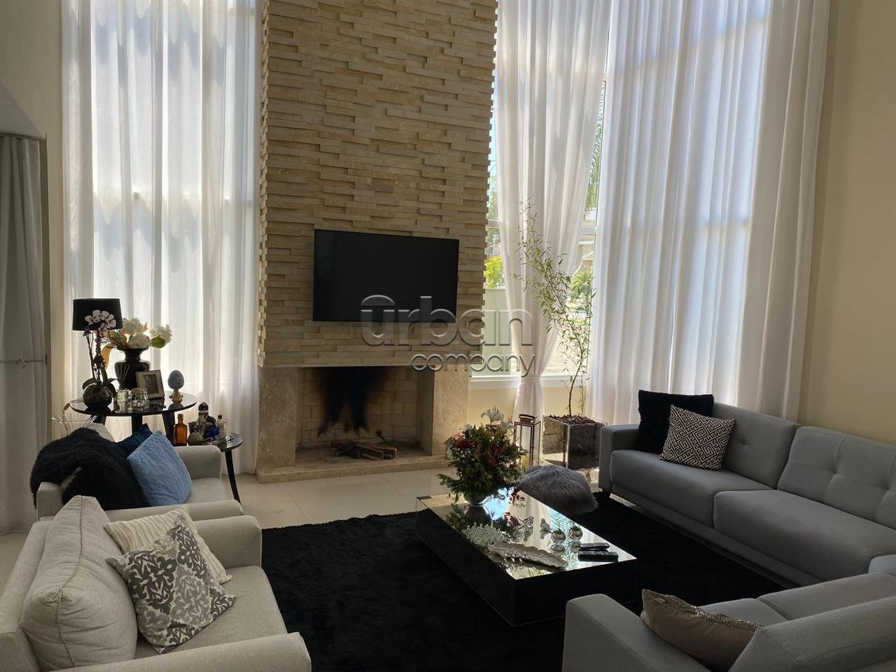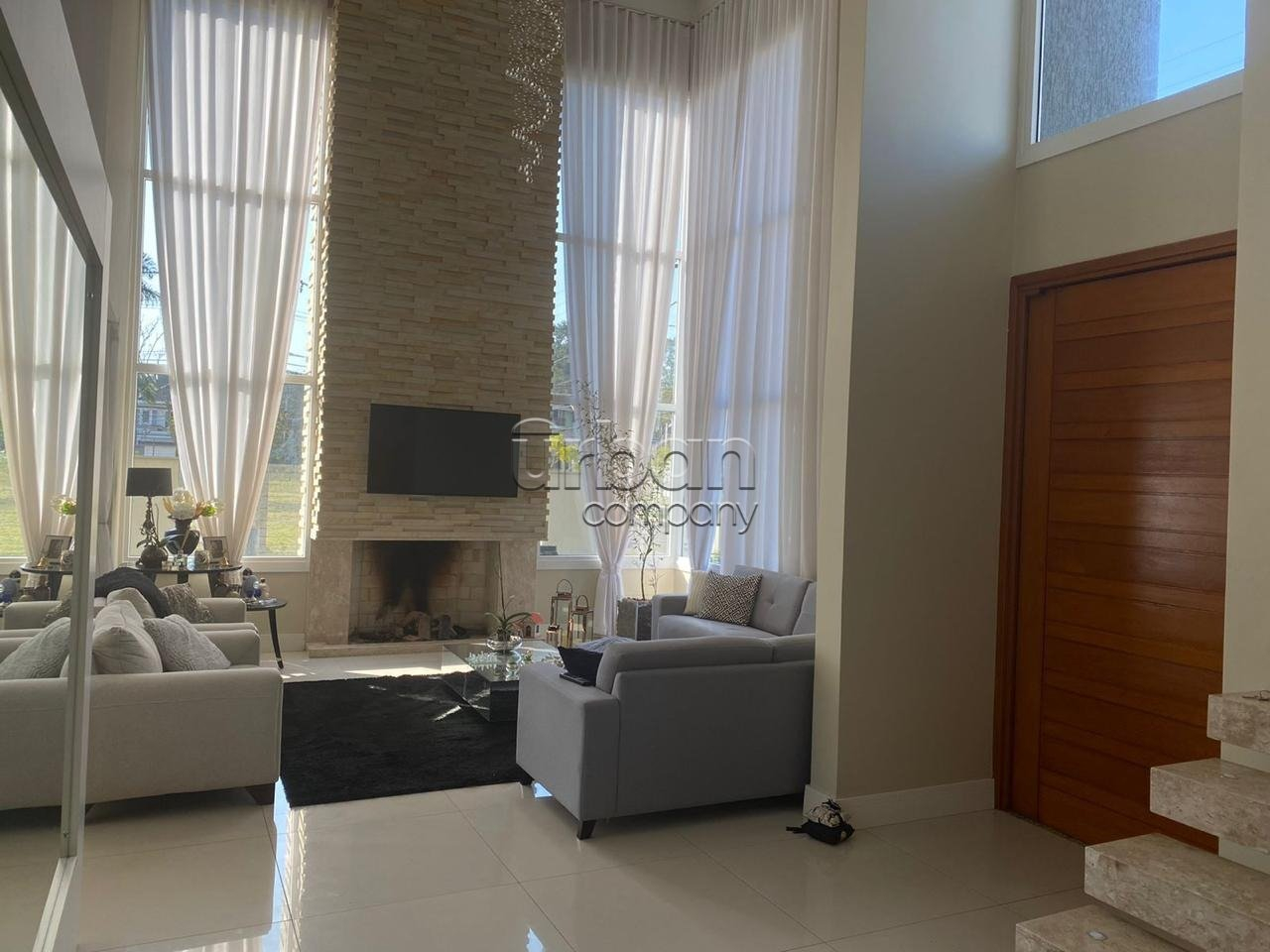 No pavimento térreo, o imóvel dispõe de ampla sala de estar com pé-direito duplo e lareira, conferindo imponência e aconchego ao ambiente. Conta ainda com 1 dormitório, lavabo, sala de jantar, cozinha funcional, lavanderia e garagem para até 4 veículos de pequeno porte e posição solar leste.