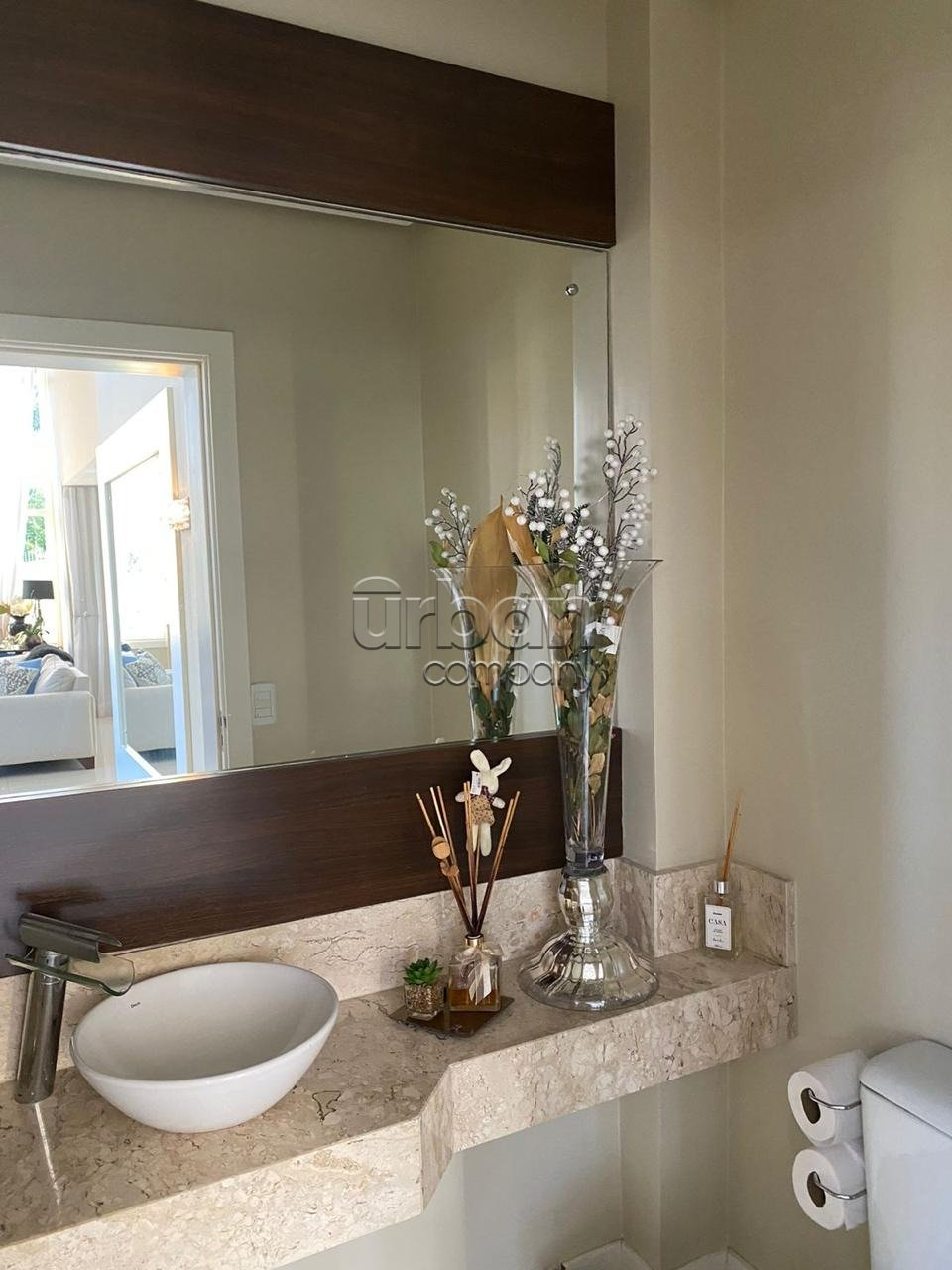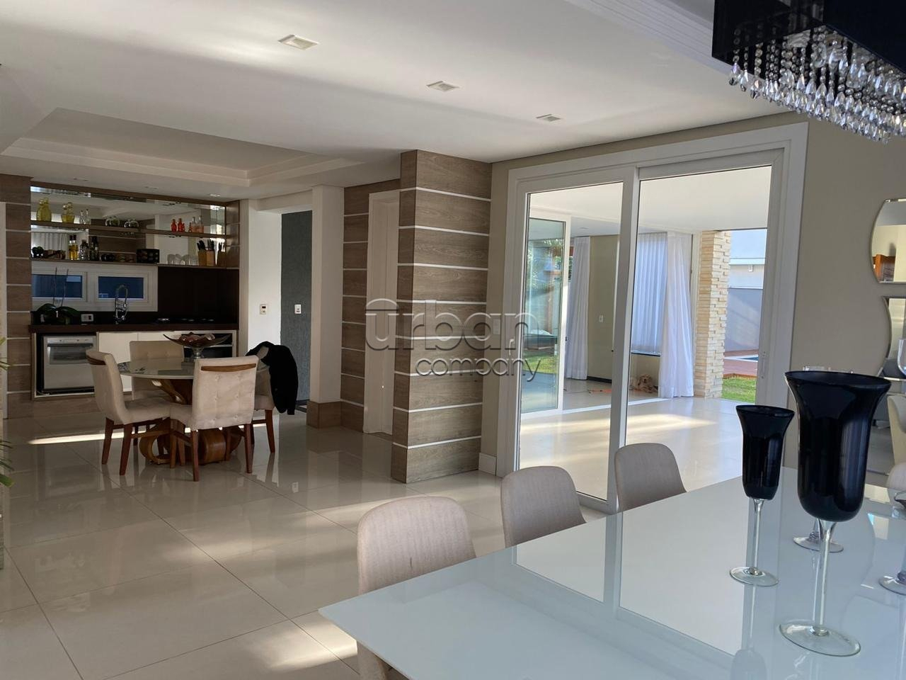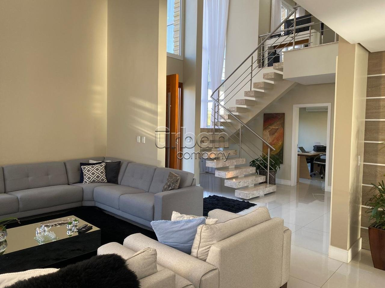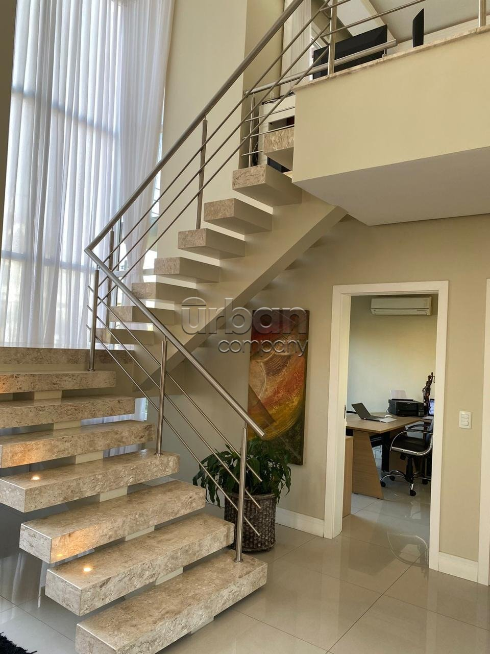 O pavimento superior é acessado por uma sofisticada escada em mármore travertino, com iluminação embutida e amplas aberturas envidraçadas que proporcionam vista externa e abundante luminosidade natural, formando um elegante conjunto arquitetônico em ?U?.