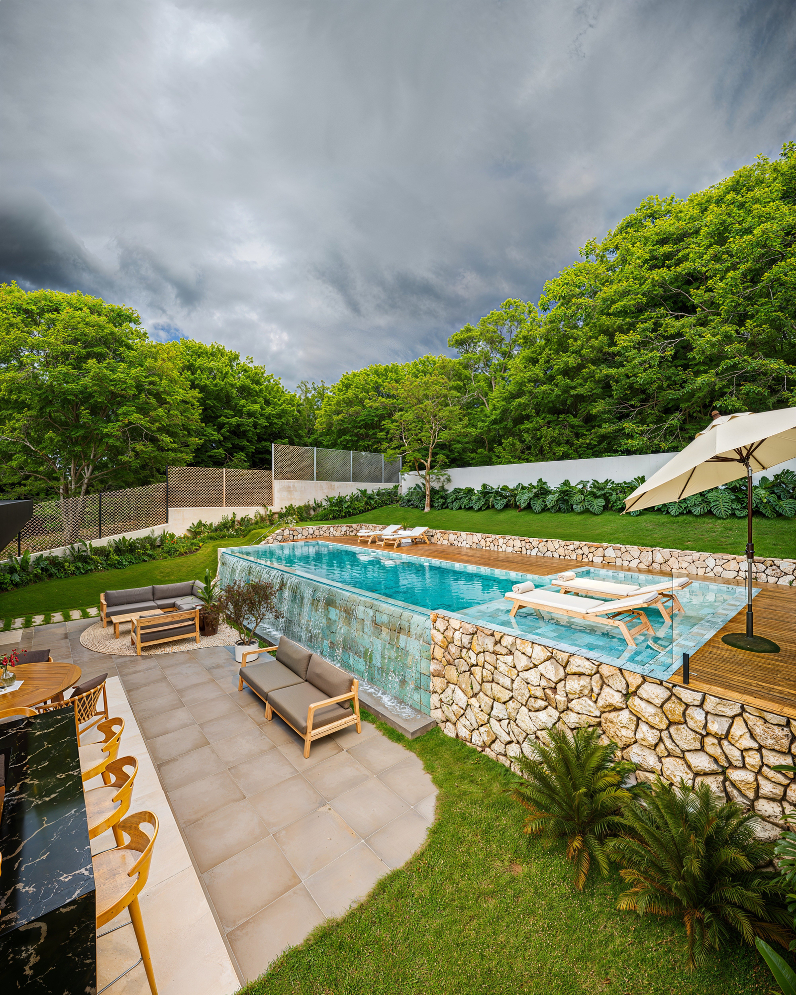 A área externa é um verdadeiro convite ao bem-estar, com piscina de concreto com mais de 40 m² e borda infinita, integrada a um espaço gourmet aberto, pensado para momentos memoráveis ao lado da família e amigos.