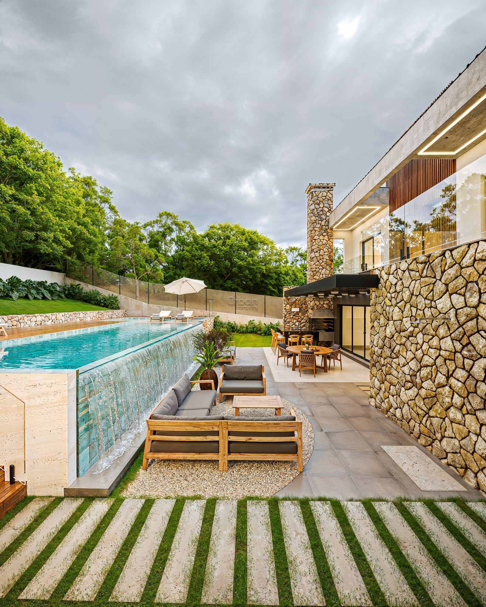 Aproximadamente 70 m² de revestimento em pedra moledo, valorizando a arquitetura