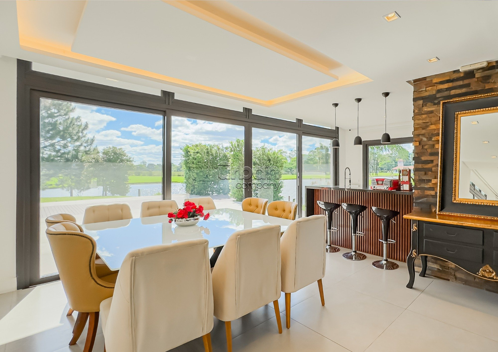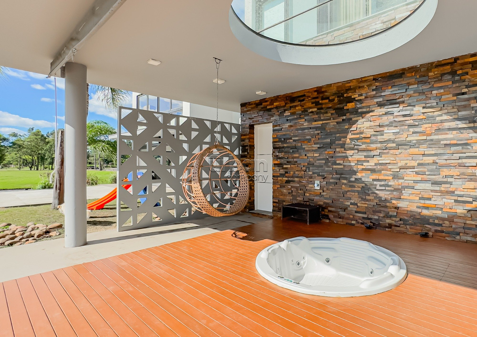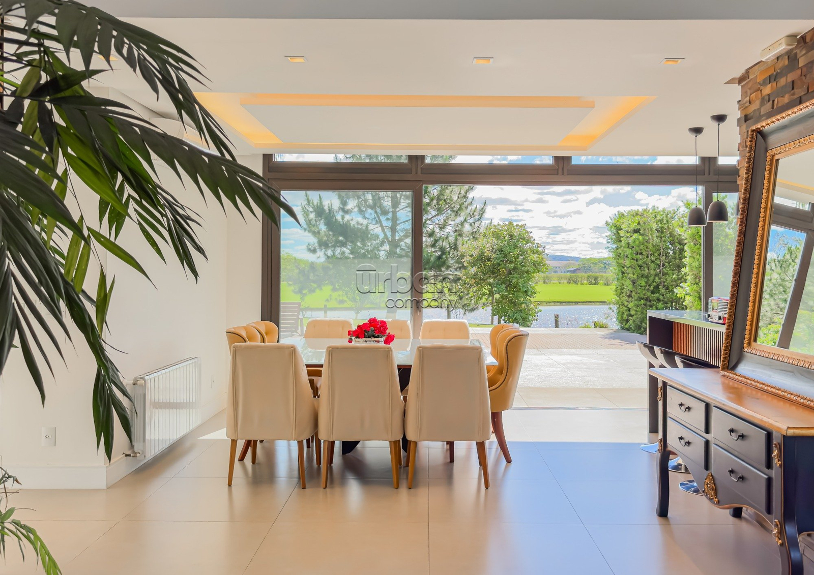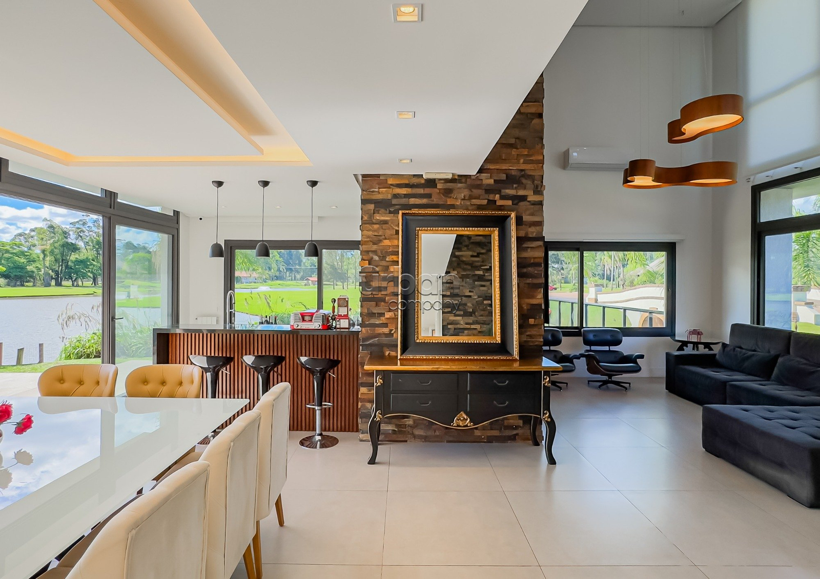 Com um amplo terreno de 1.280 m², a casa se destaca pela vista panorâmica para o lago, presente nos fundos e na lateral, criando um cenário único e permanente conexão com a natureza. O living impressiona pelo pé-direito duplo, lareira e integração com o escritório, proporcionando amplitude. Conta ainda com sala de música com isolamento acústico, copa/cozinha equipada e espaço gourmet.