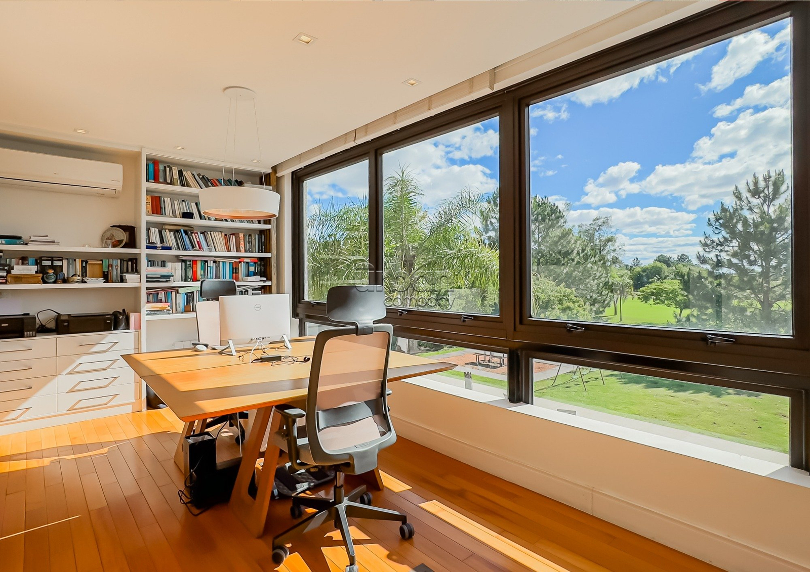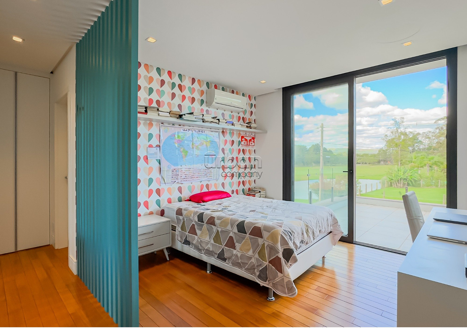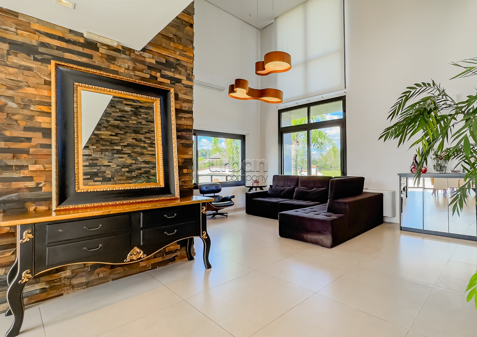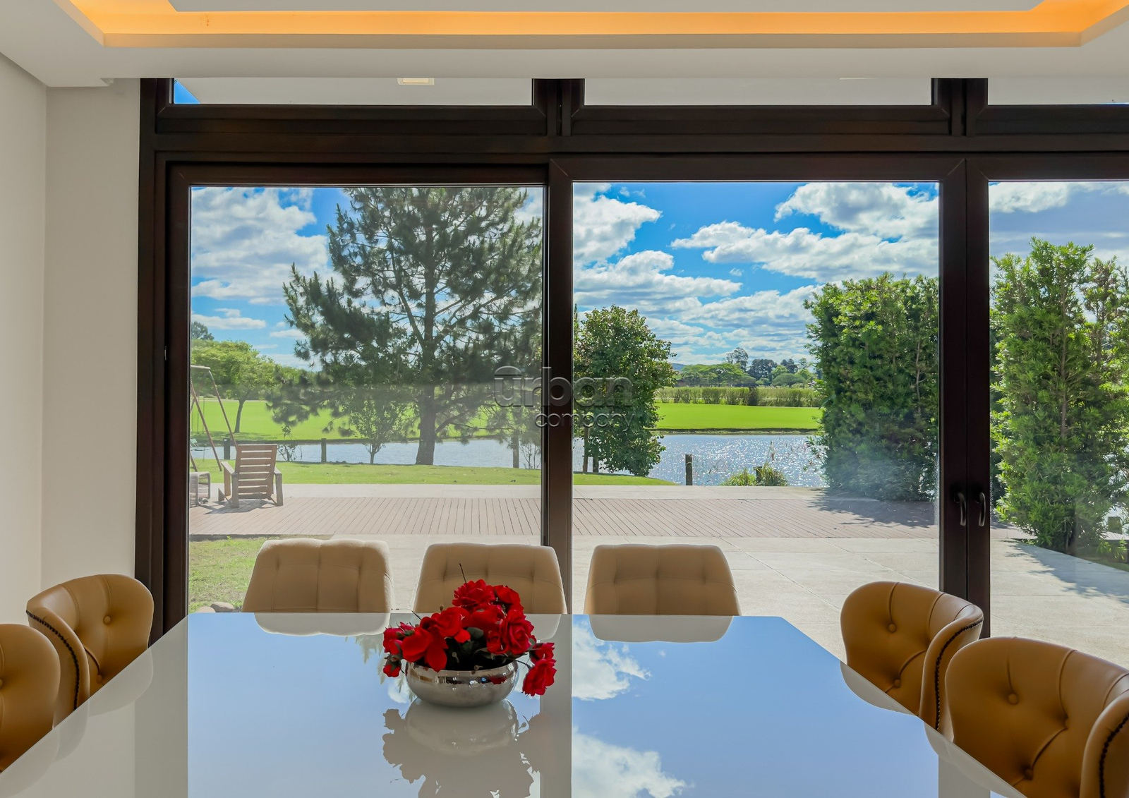 Com um amplo terreno de 1.280 m², a casa se destaca pela vista panorâmica para o lago, presente nos fundos e na lateral, criando um cenário único e permanente conexão com a natureza. O living impressiona pelo pé-direito duplo, lareira e integração com o escritório, proporcionando amplitude. Conta ainda com sala de música com isolamento acústico, copa/cozinha equipada e espaço gourmet.