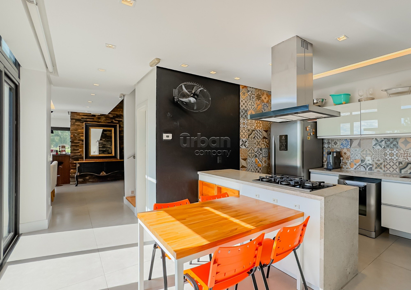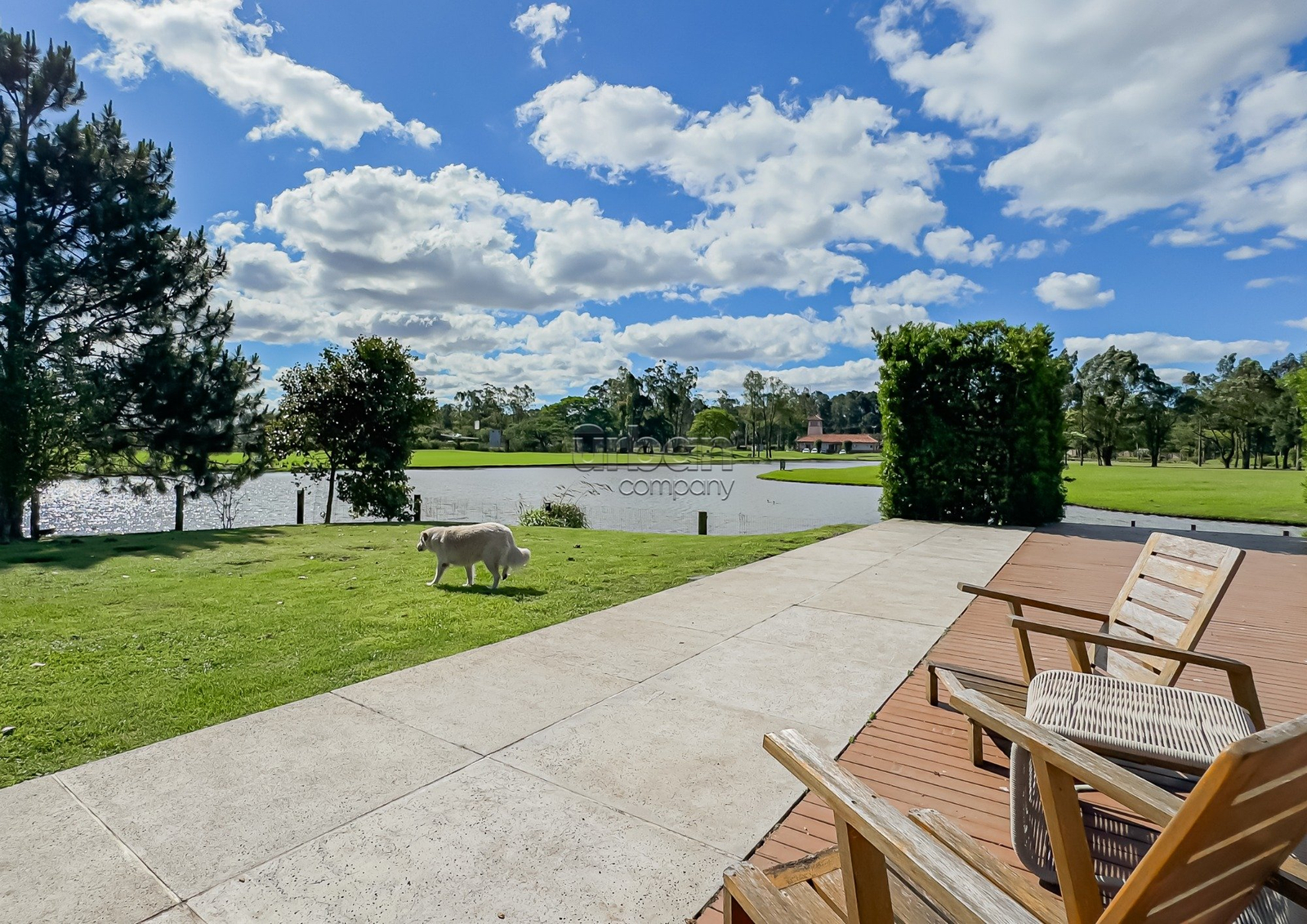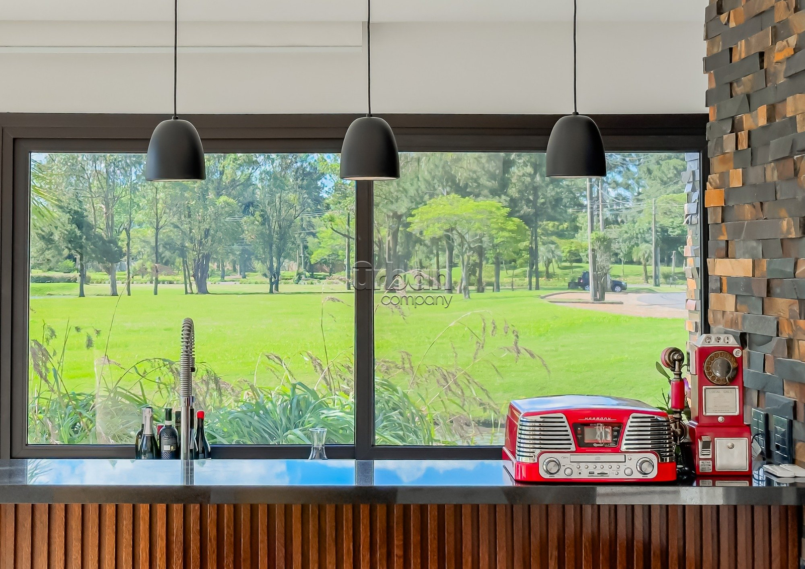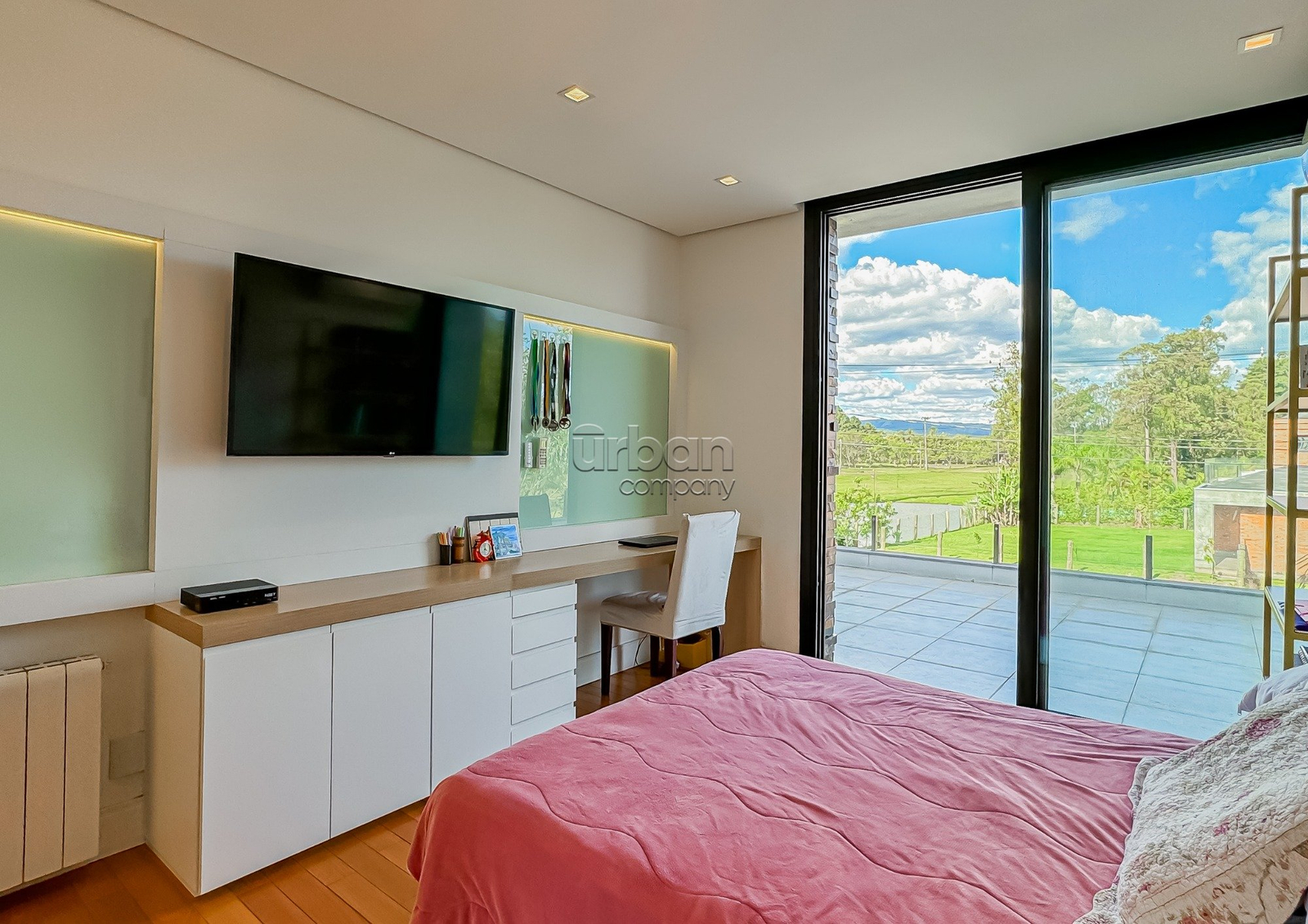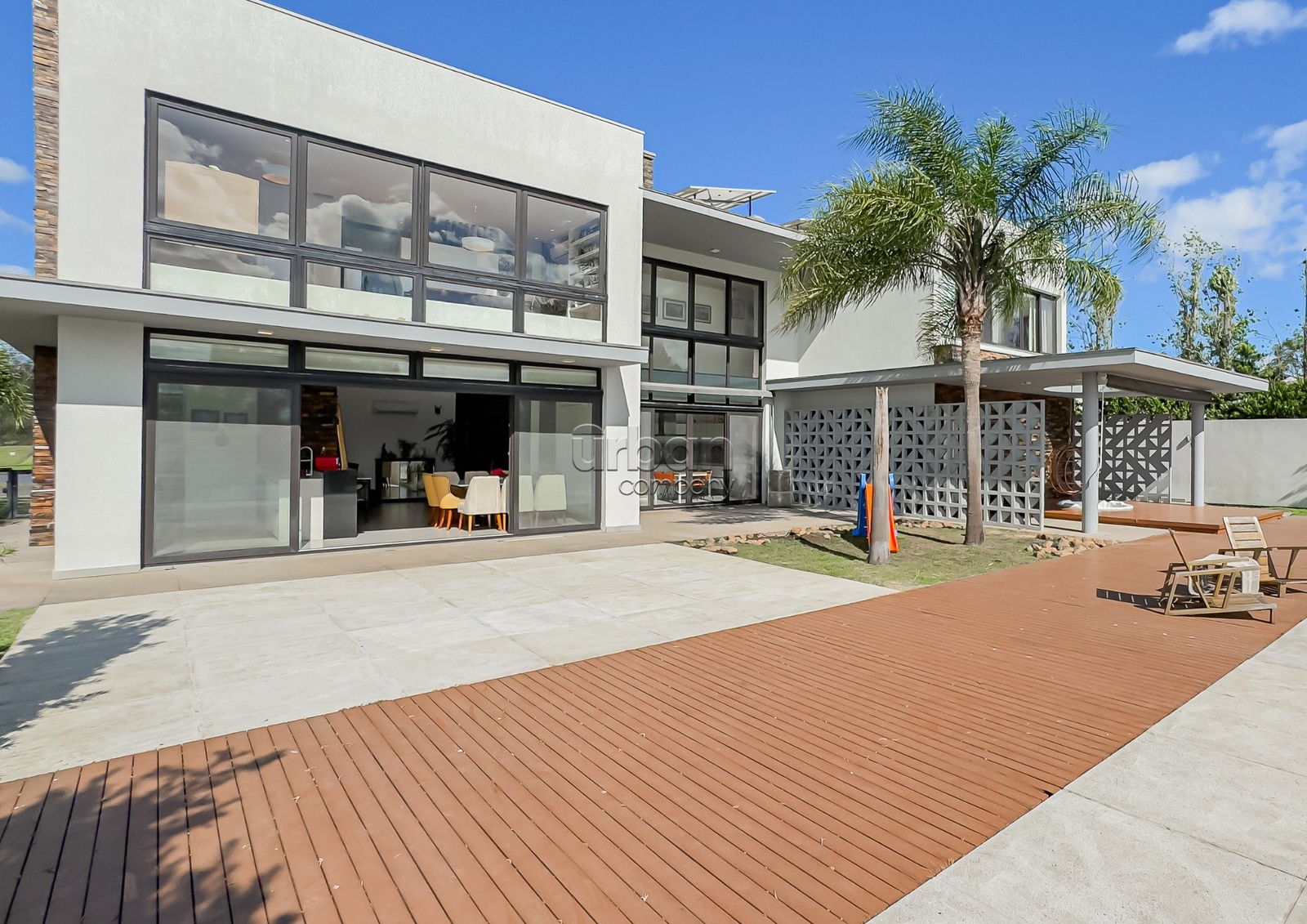 Com um amplo terreno de 1.280 m², a casa se destaca pela vista panorâmica para o lago, presente nos fundos e na lateral, criando um cenário único e permanente conexão com a natureza. O living impressiona pelo pé-direito duplo, lareira e integração com o escritório, proporcionando amplitude. Conta ainda com sala de música com isolamento acústico, copa/cozinha equipada e espaço gourmet.