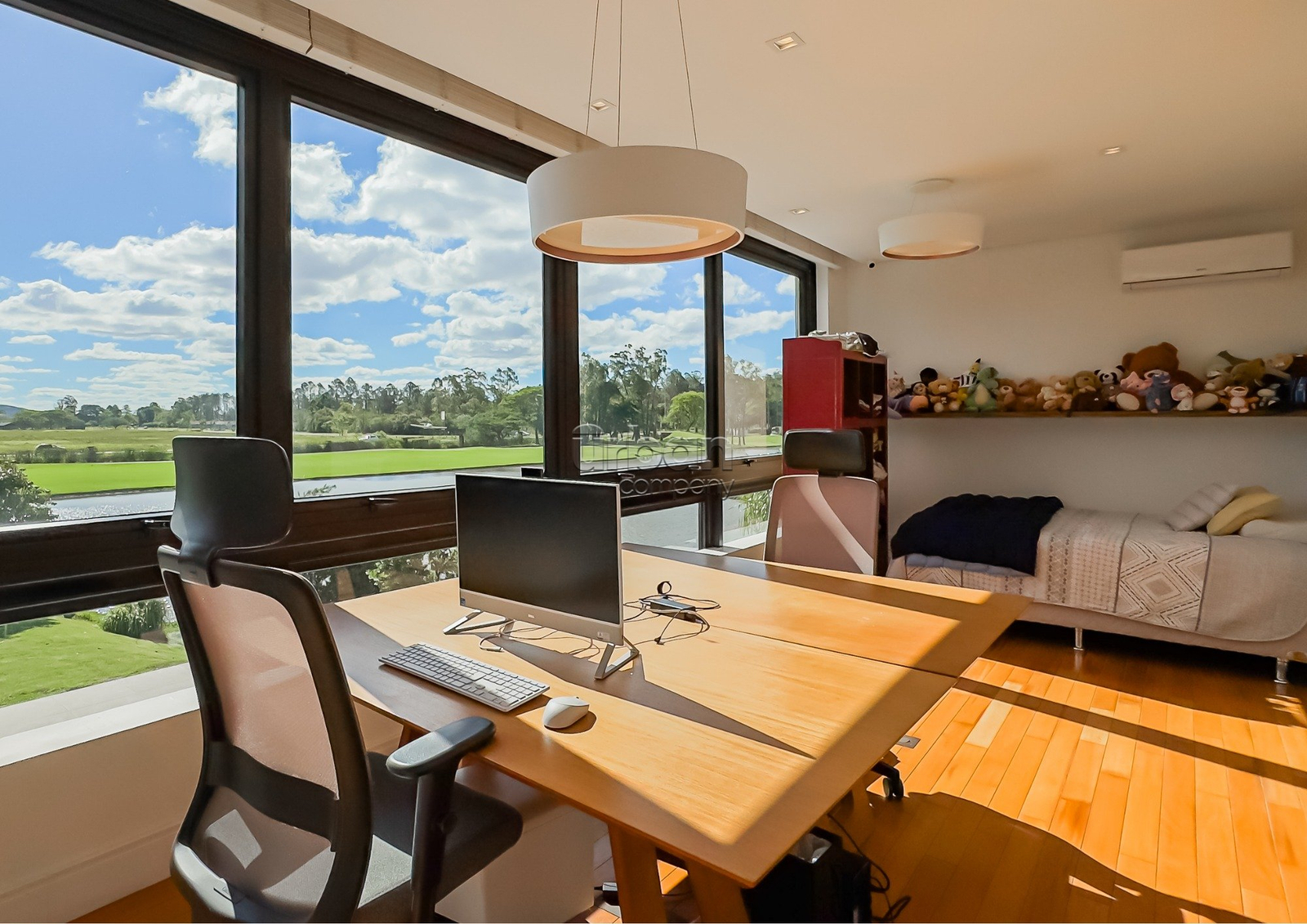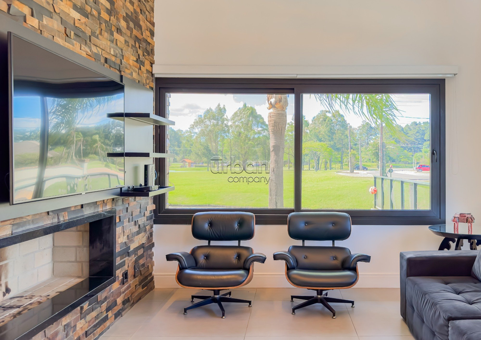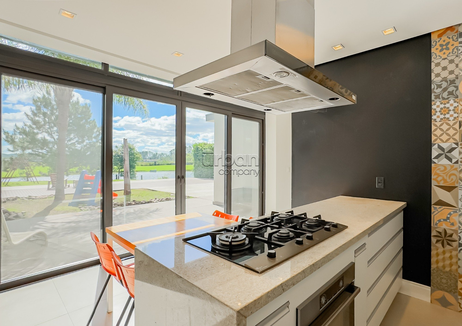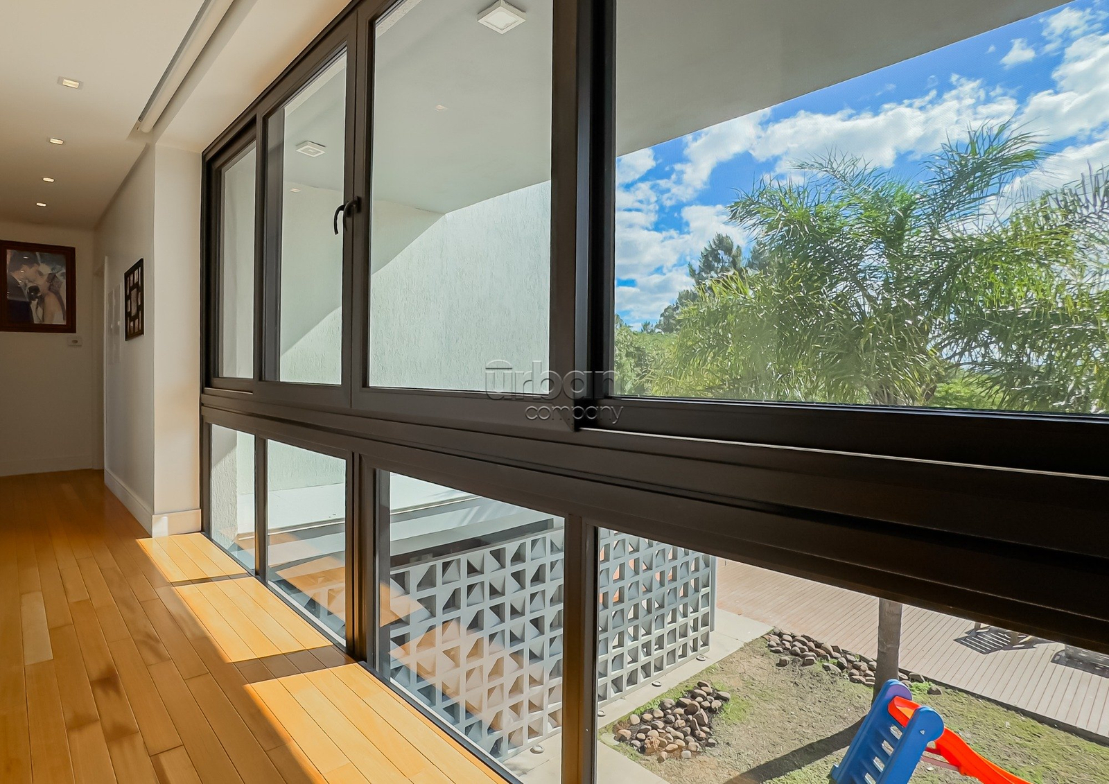 Com um amplo terreno de 1.280 m², a casa se destaca pela vista panorâmica para o lago, presente nos fundos e na lateral, criando um cenário único e permanente conexão com a natureza. O living impressiona pelo pé-direito duplo, lareira e integração com o escritório, proporcionando amplitude. Conta ainda com sala de música com isolamento acústico, copa/cozinha equipada e espaço gourmet.