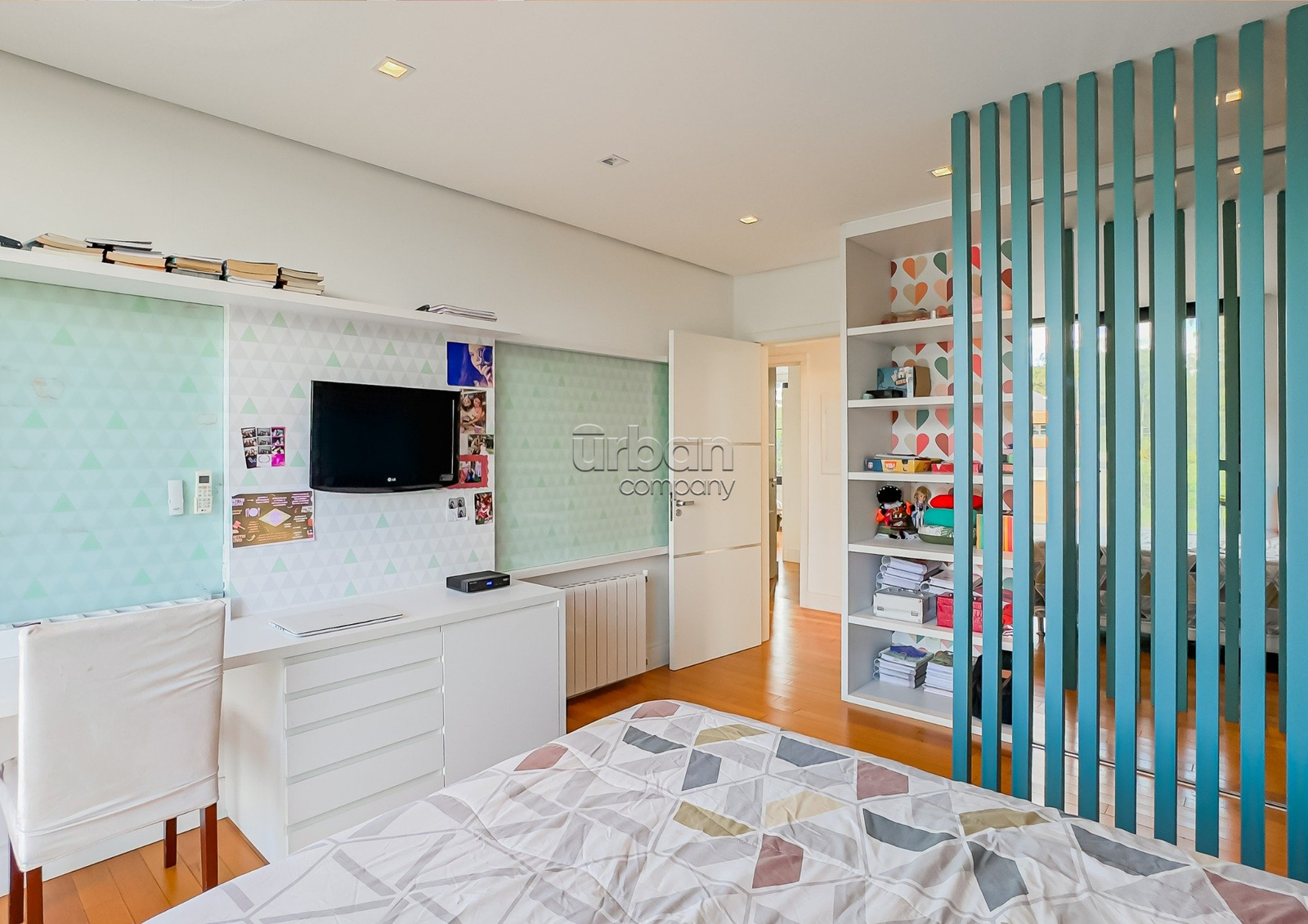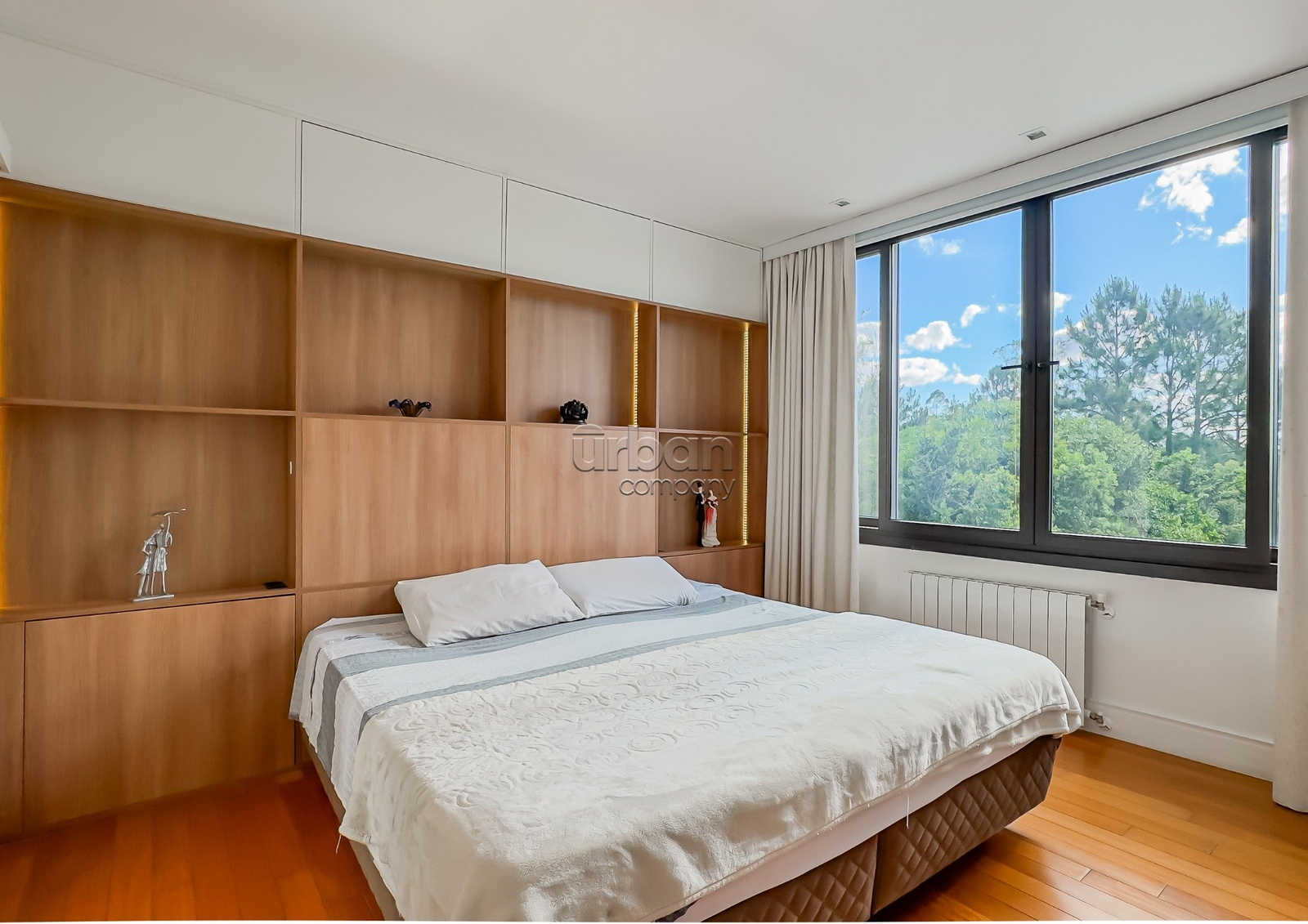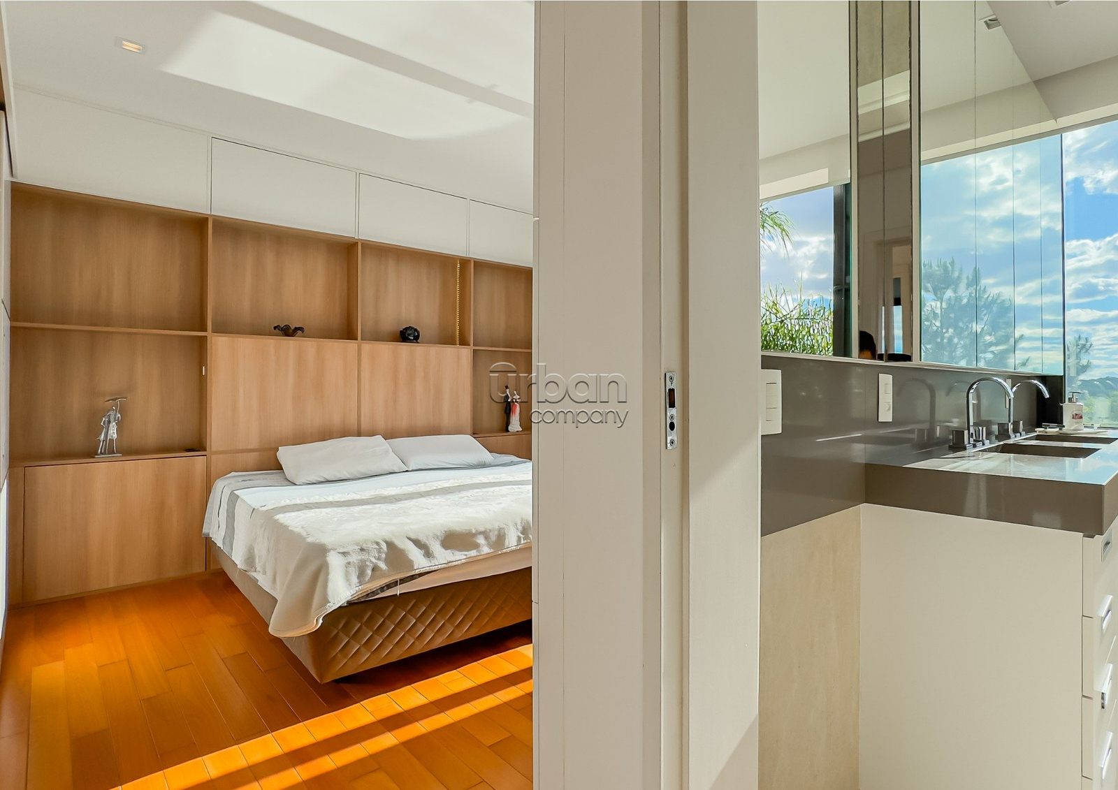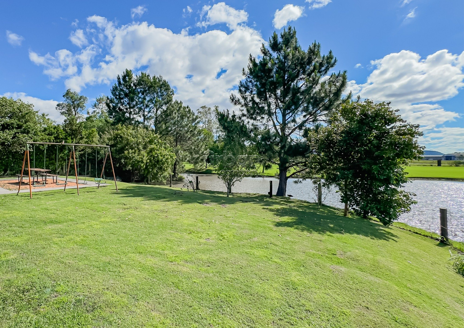 Com um amplo terreno de 1.280 m², a casa se destaca pela vista panorâmica para o lago, presente nos fundos e na lateral, criando um cenário único e permanente conexão com a natureza. O living impressiona pelo pé-direito duplo, lareira e integração com o escritório, proporcionando amplitude. Conta ainda com sala de música com isolamento acústico, copa/cozinha equipada e espaço gourmet.