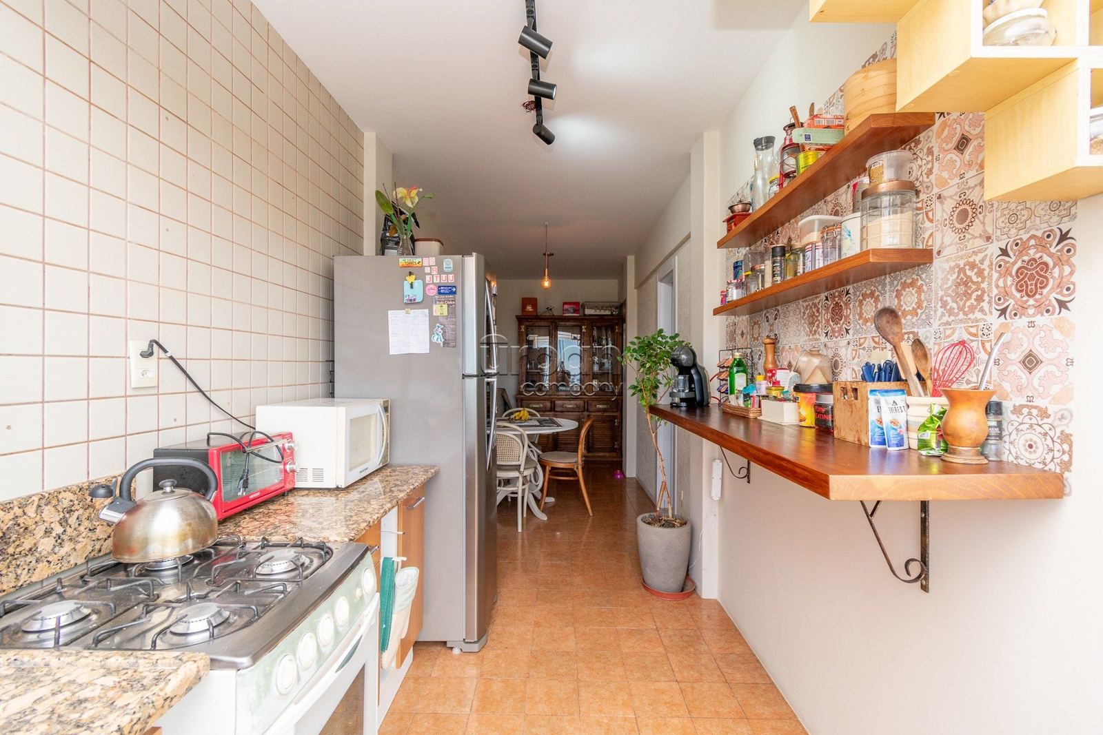 Cozinha com copa, área de serviço grande, dependência transformada em escritório, lavabo, e banheiro com ventilação direta.