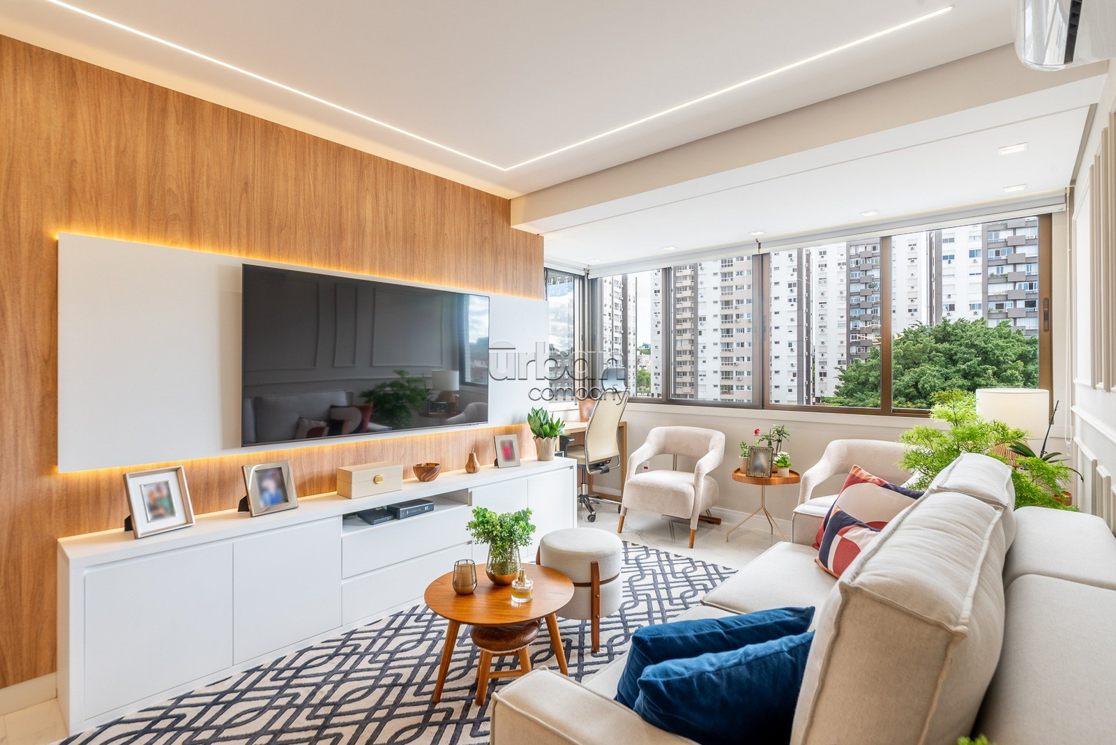 Amplo living para 3 ambientes com home office, vista definida, ensolarado, ficam os móveis fixos, cozinha e lavanderia completa, churrasqueira, todos os cômodos com split.