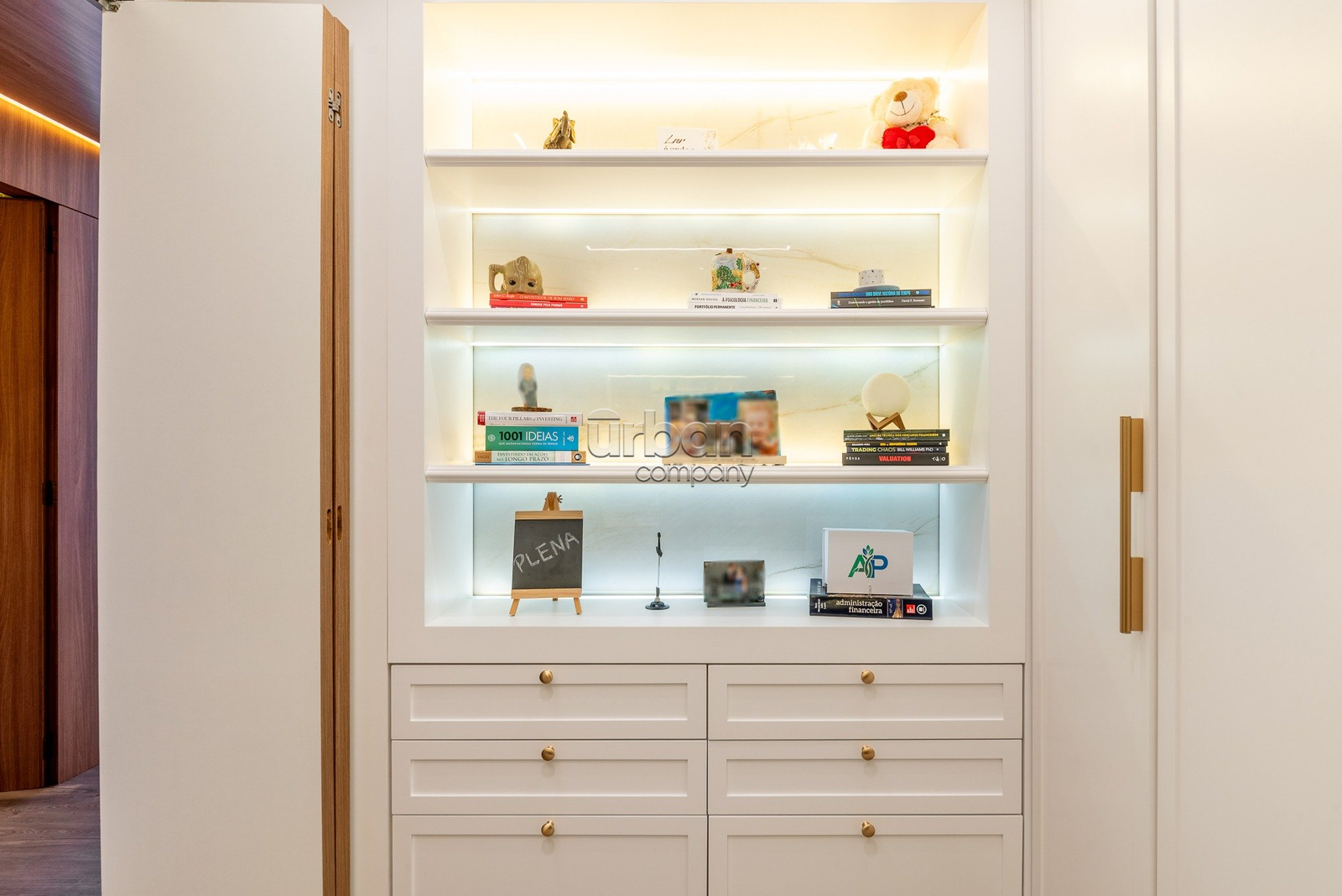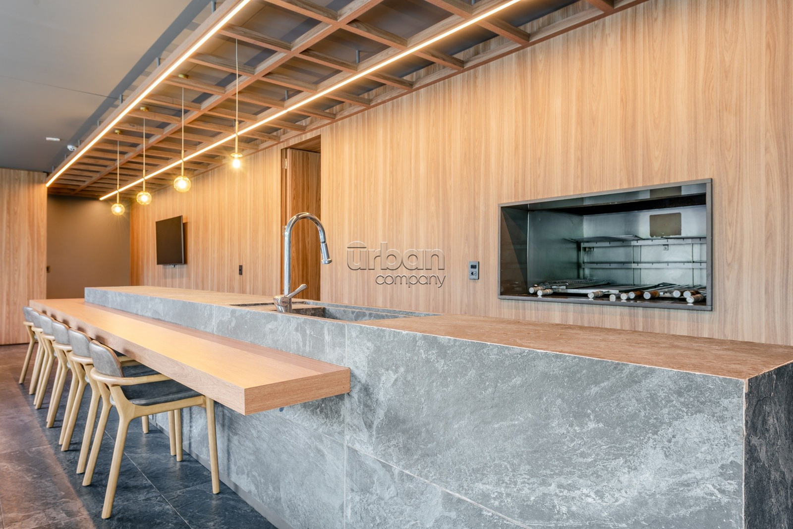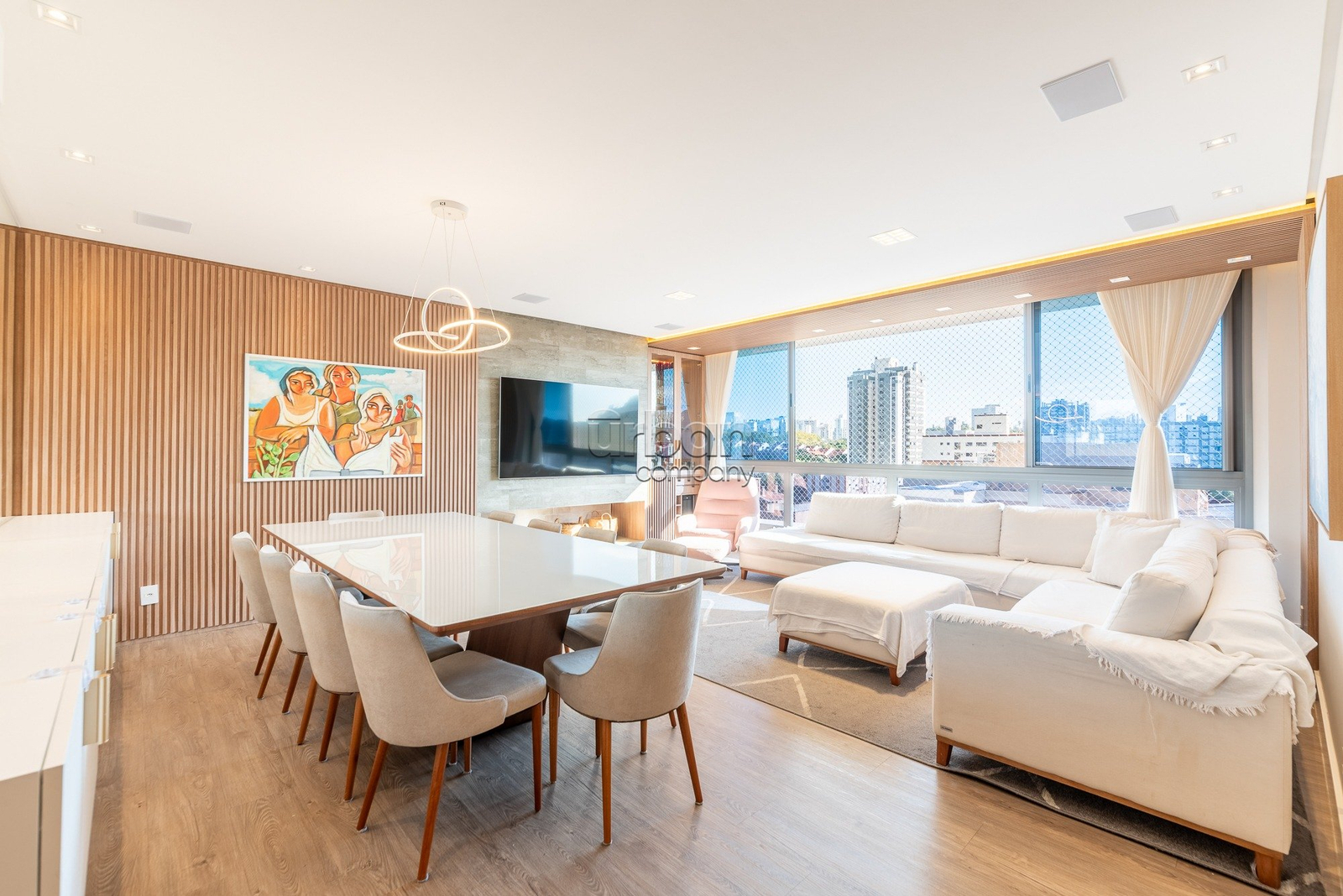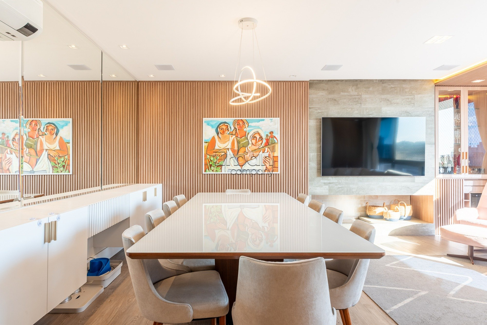 O imóvel possui projeto assinado por arquiteto, com mobiliário de alto padrão e excelente aproveitamento dos espaços. O living é amplo, com dois ambientes bem definidos, estar e jantar, lareira e aberturas do piso ao teto que garantem ótima iluminação natural. A integração com a cozinha e o espaço gourmet com churrasqueira traz praticidade e sofisticação ao ambiente.