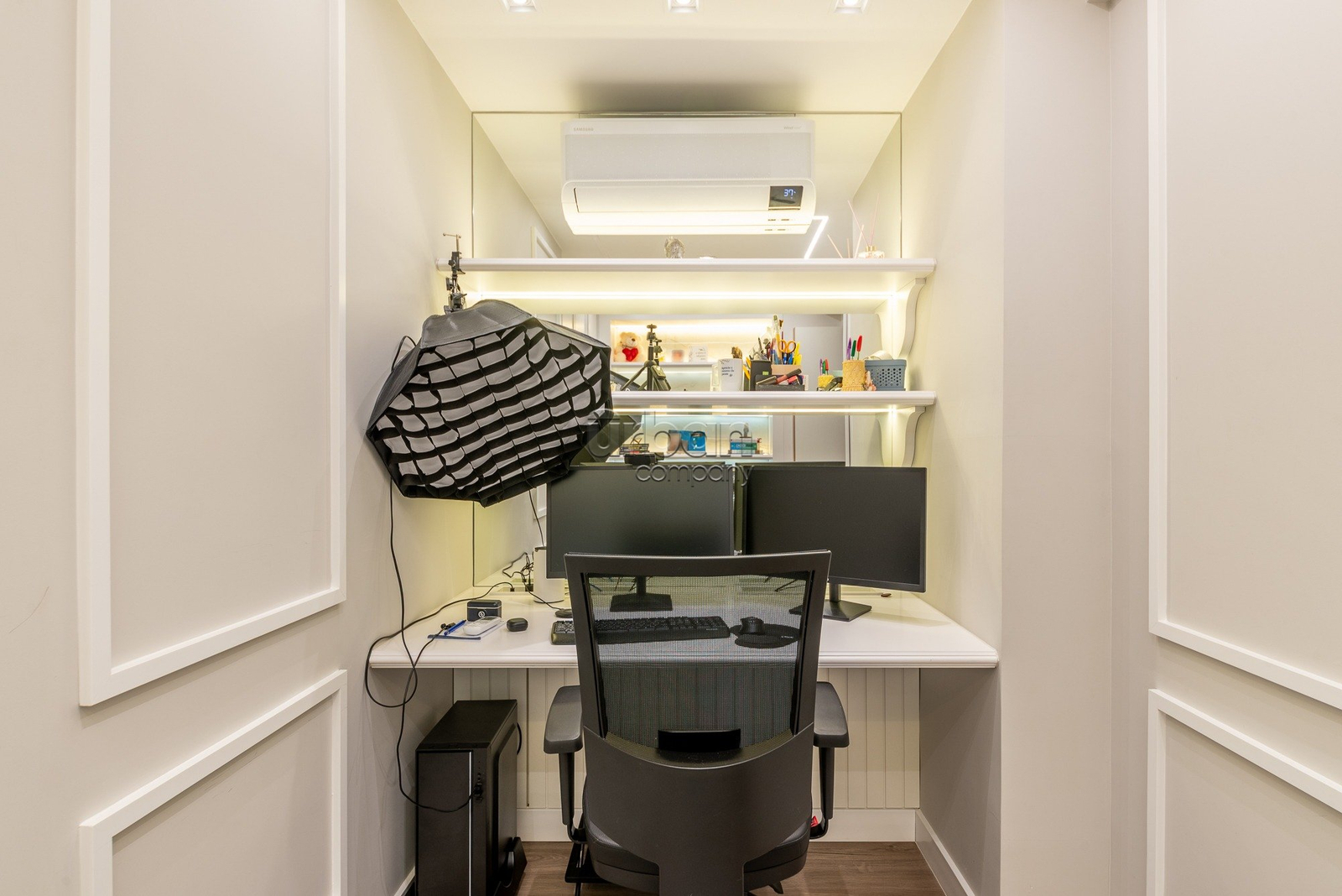 Conta com lavabo, lavanderia independente com acesso de serviço e dependência adaptada para home office, ideal para a rotina atual.